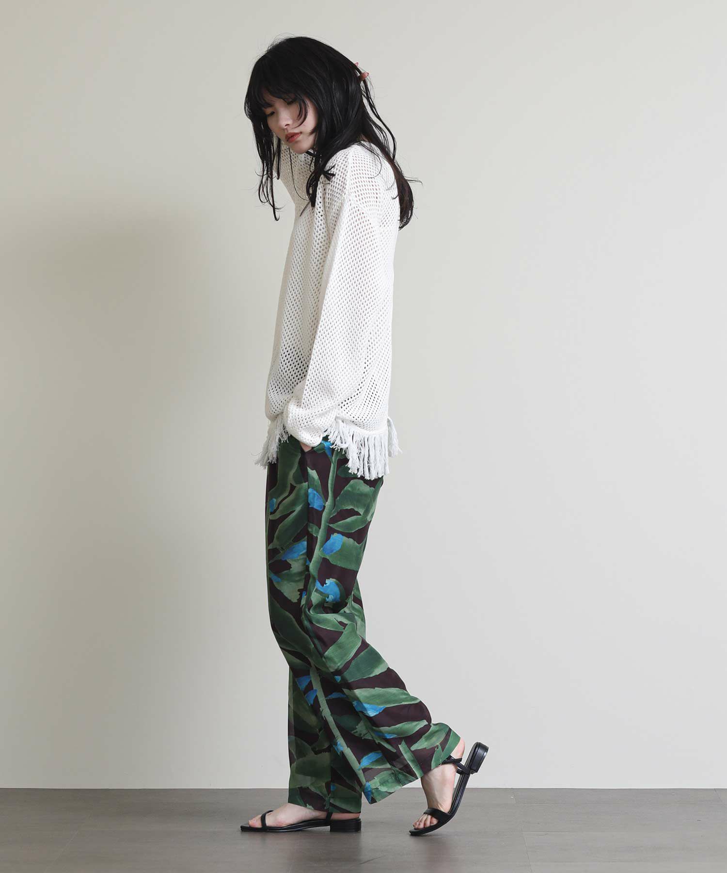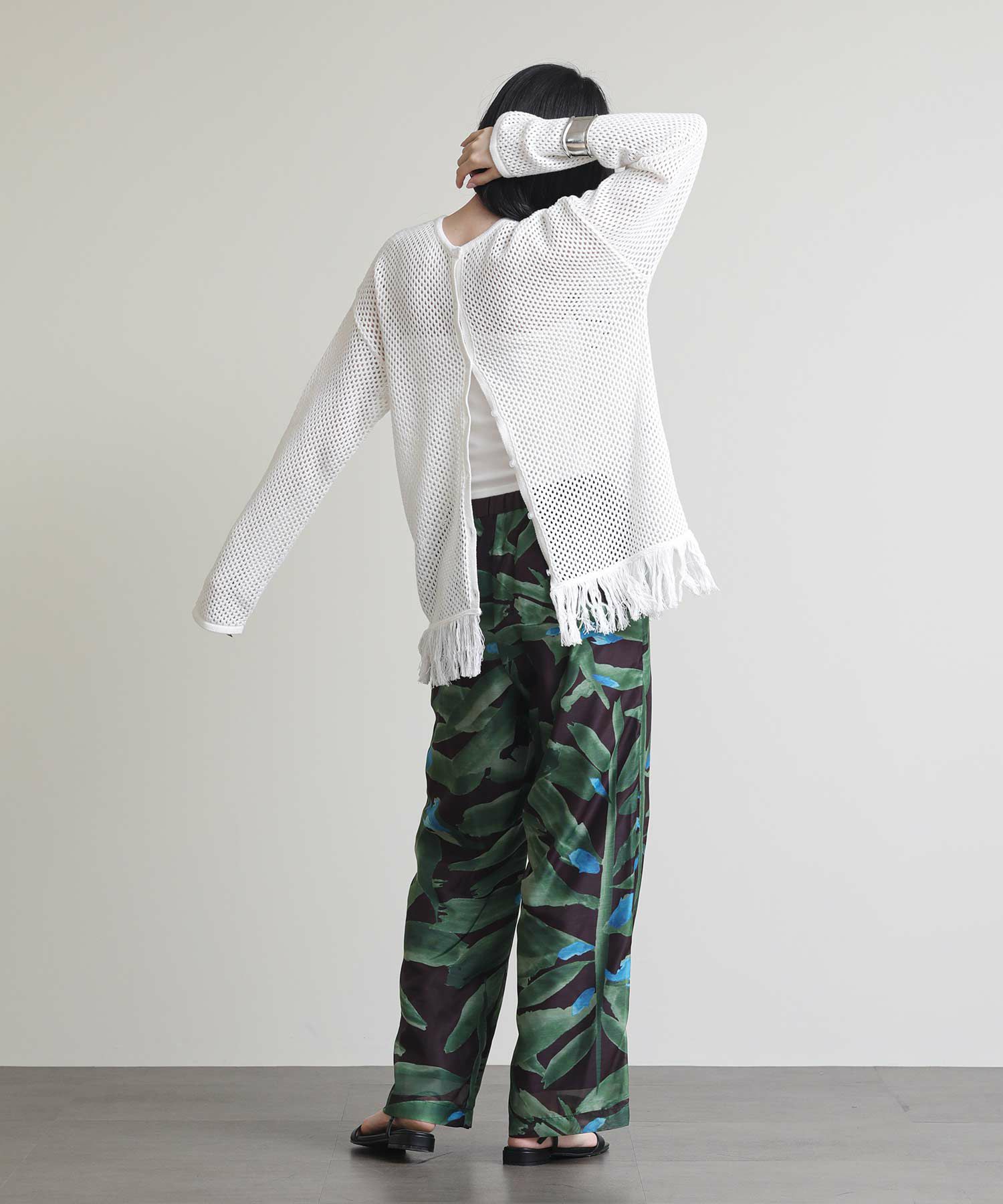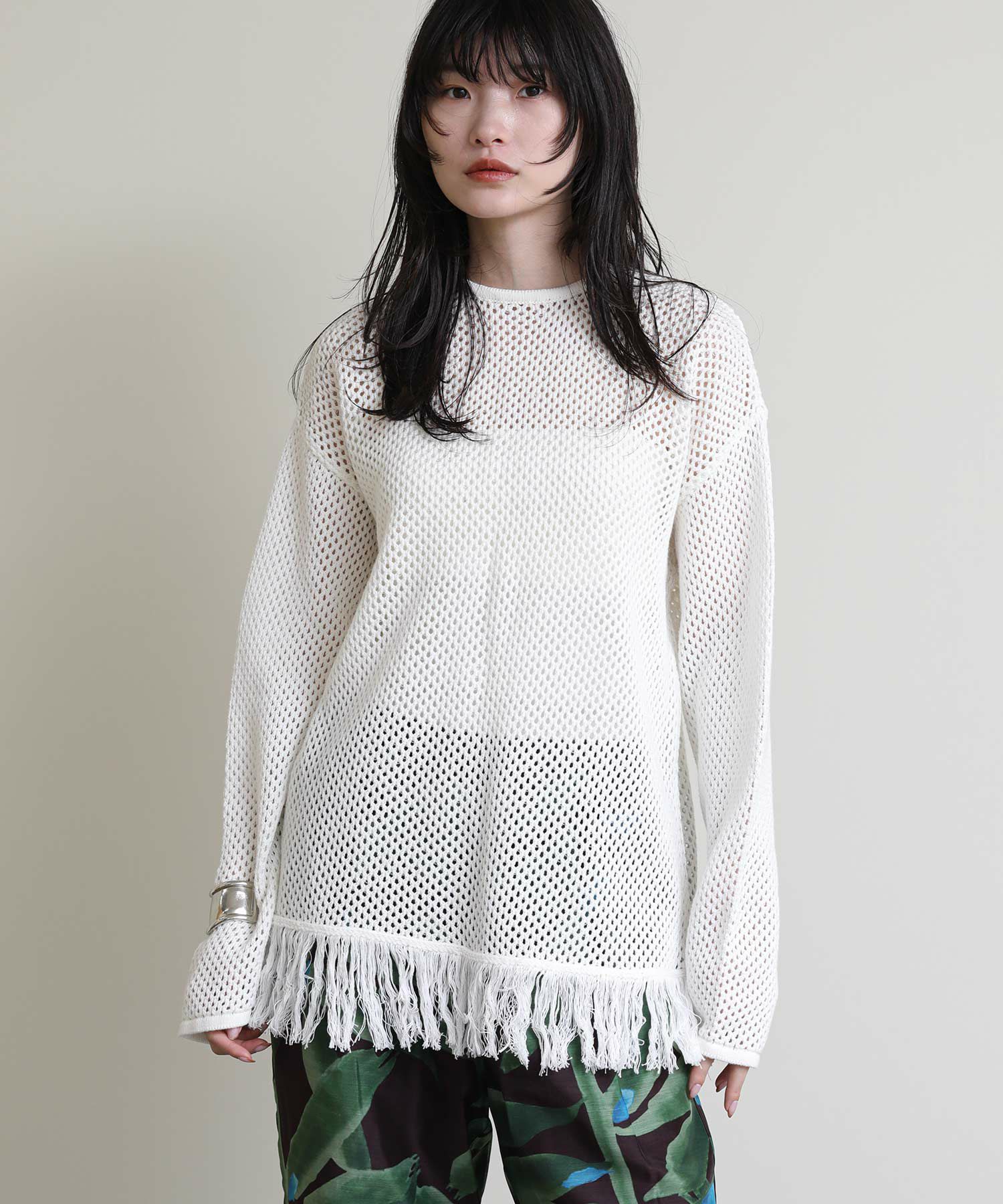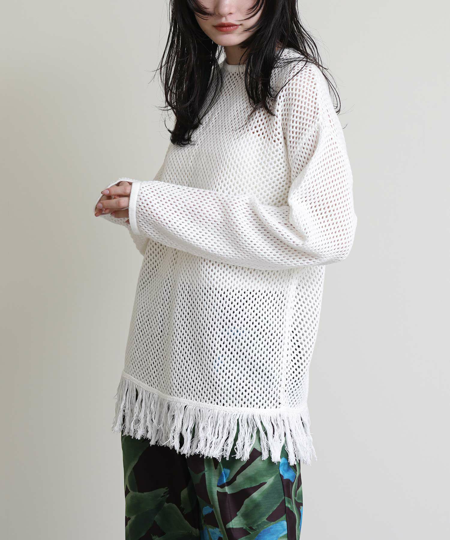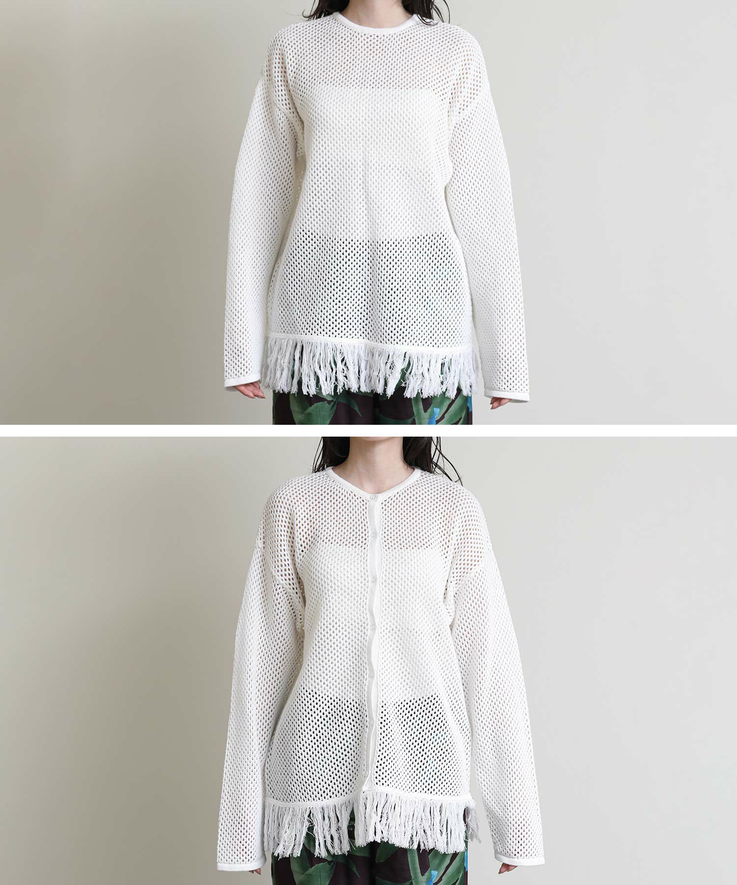 裾にフリンジがあしらわれたメッシュ編みのカーディガン。