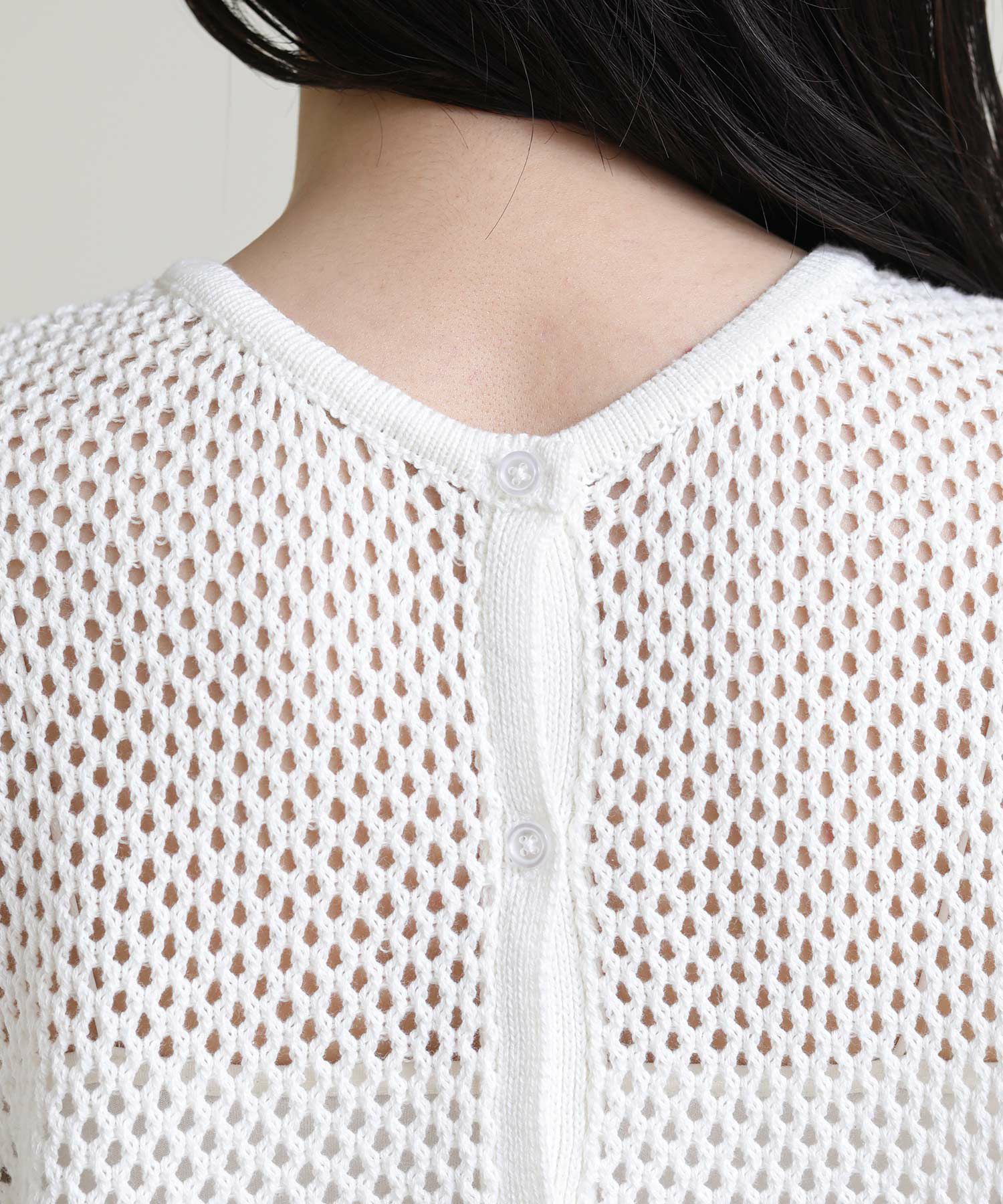 前後2WAYで着用可能。綿100%の軽やかな編地で、通気性と快適さのある一着。メッシュの風合いが程よくカジュアルさを演出しモードになりすぎず、着こなしやすい1枚です。カーディガンとしてはもちろん、スウェットやシャツとレイヤードして、袖や裾をのぞかせるのもおすすめです。