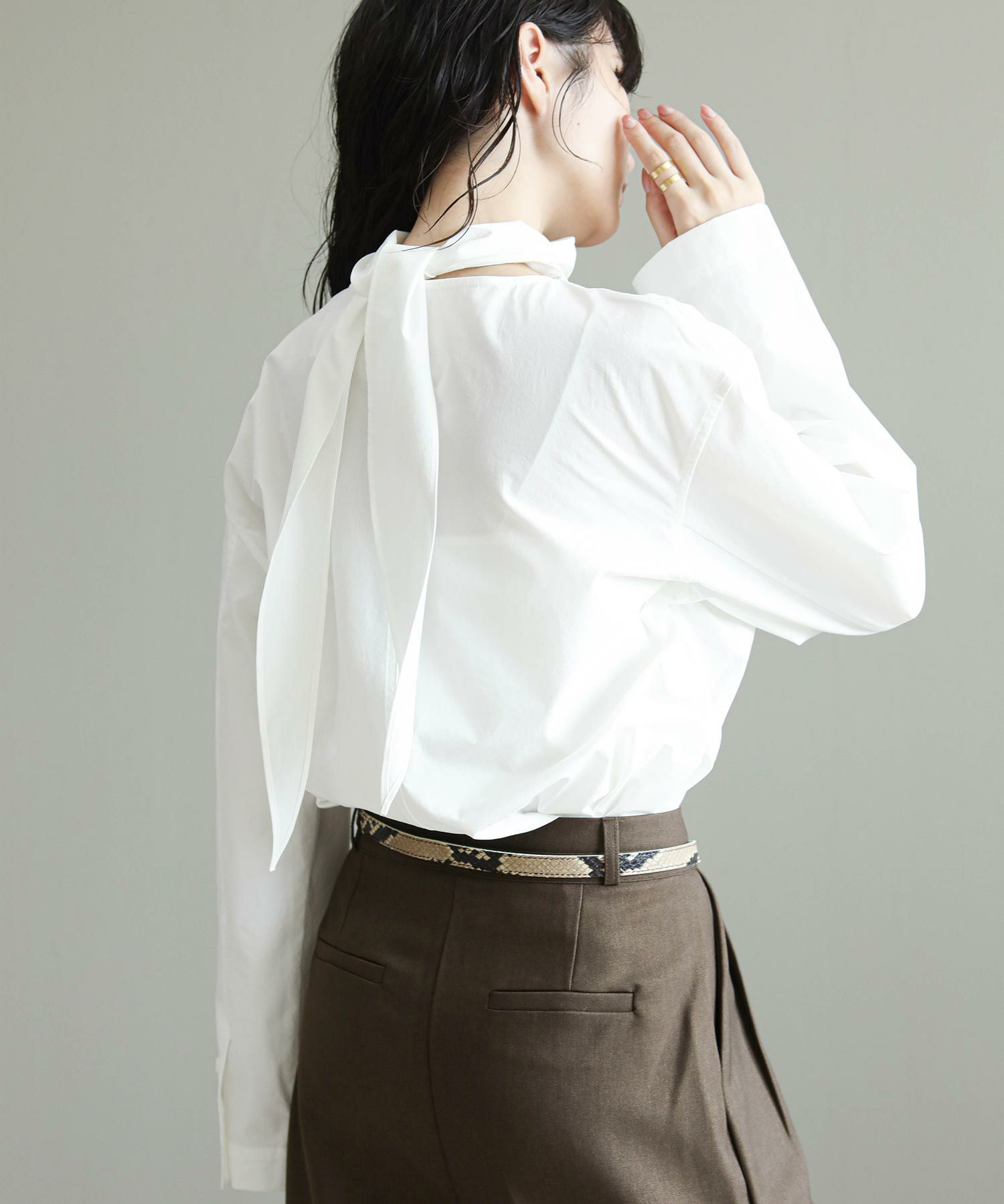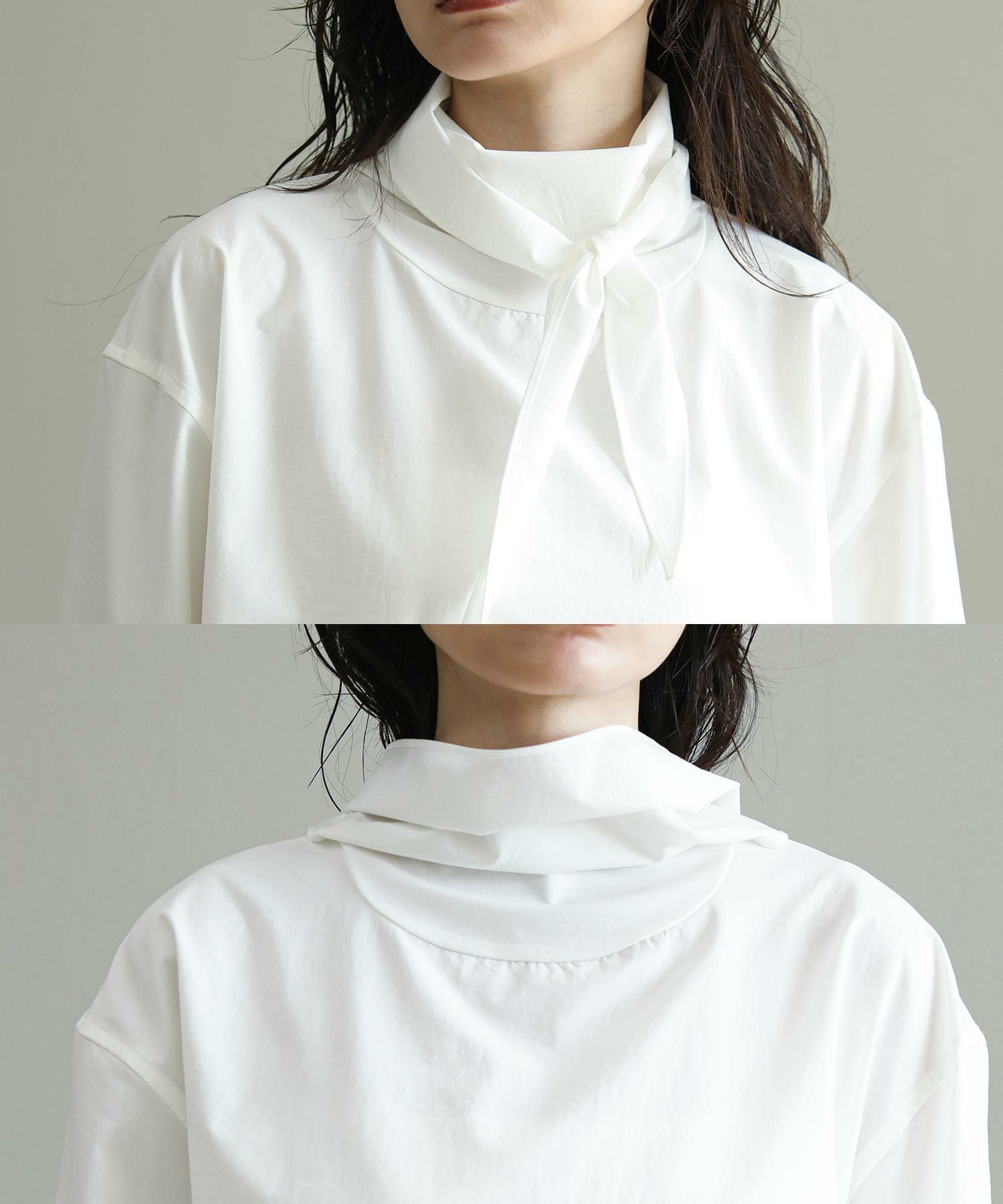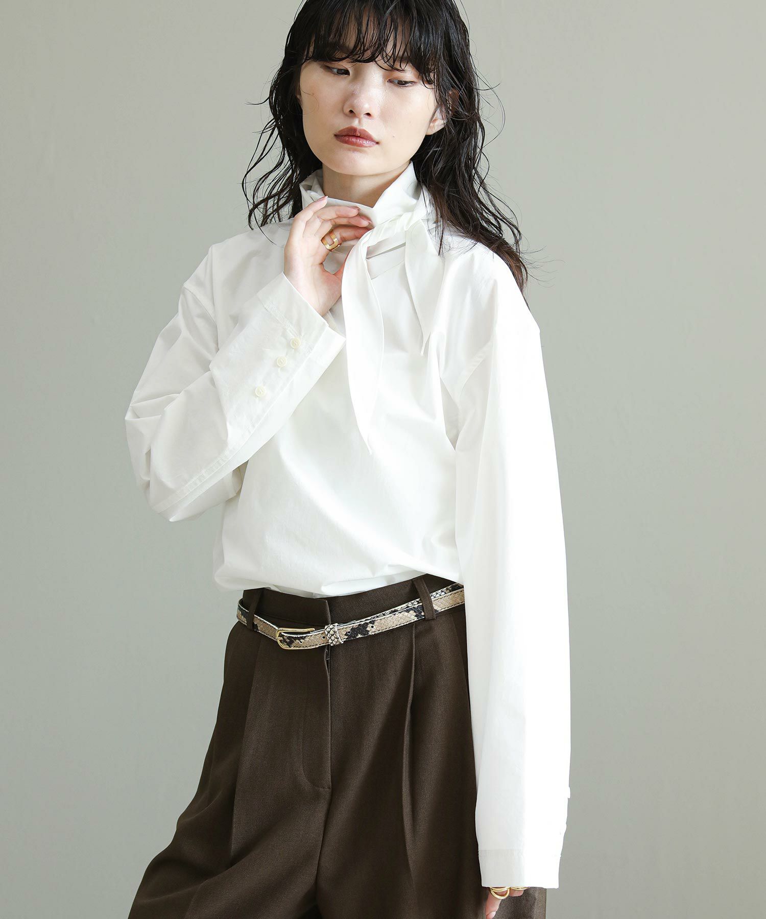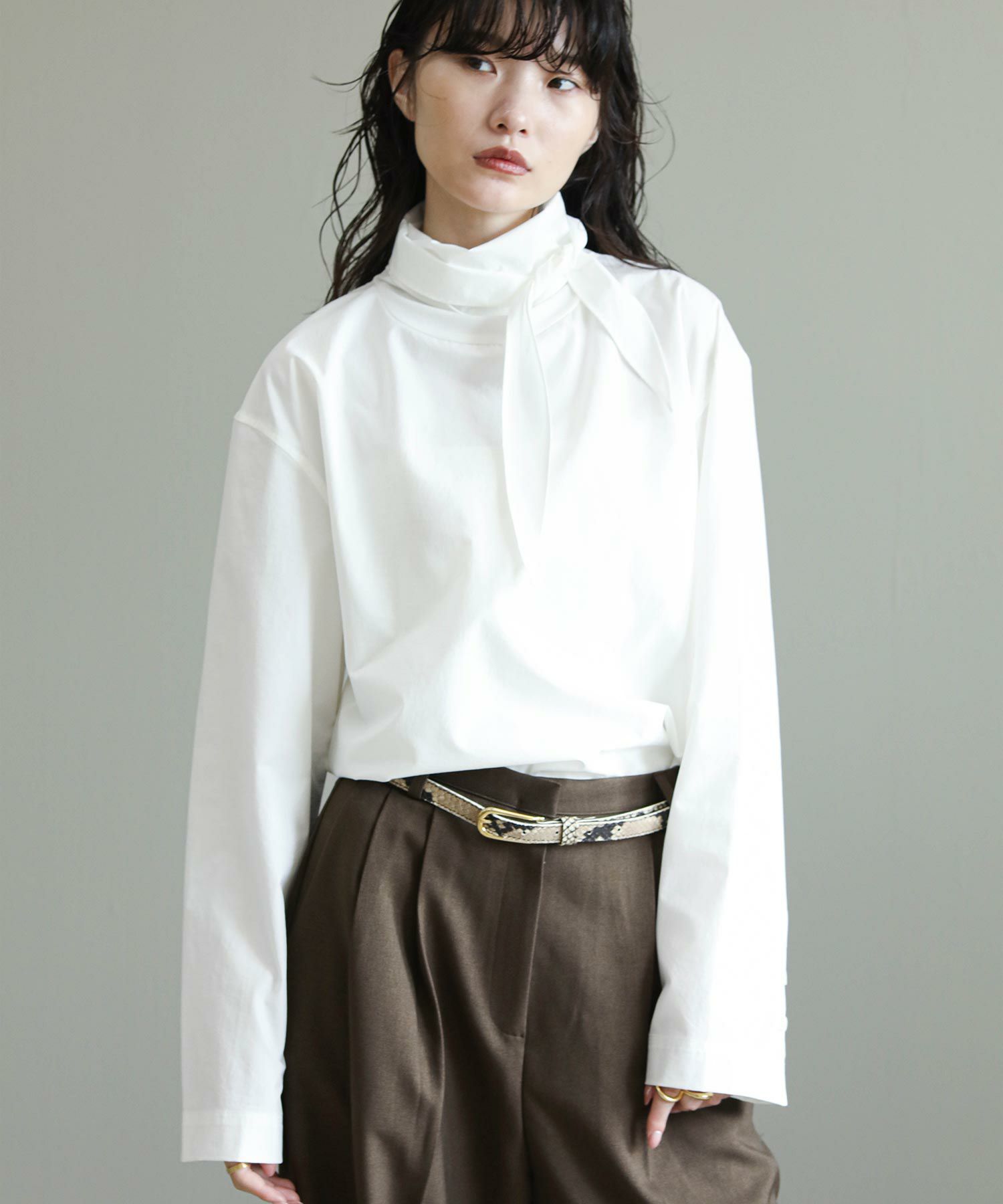 タイネックデザインはスタイリングにさりげないアクセントを加え、ボトムスのシルエットを選ばず様々な着こなしに馴染む一枚。ラウンドヘムの裾がインで着てもアウトで着てもバランスが取りやすくサマになります。