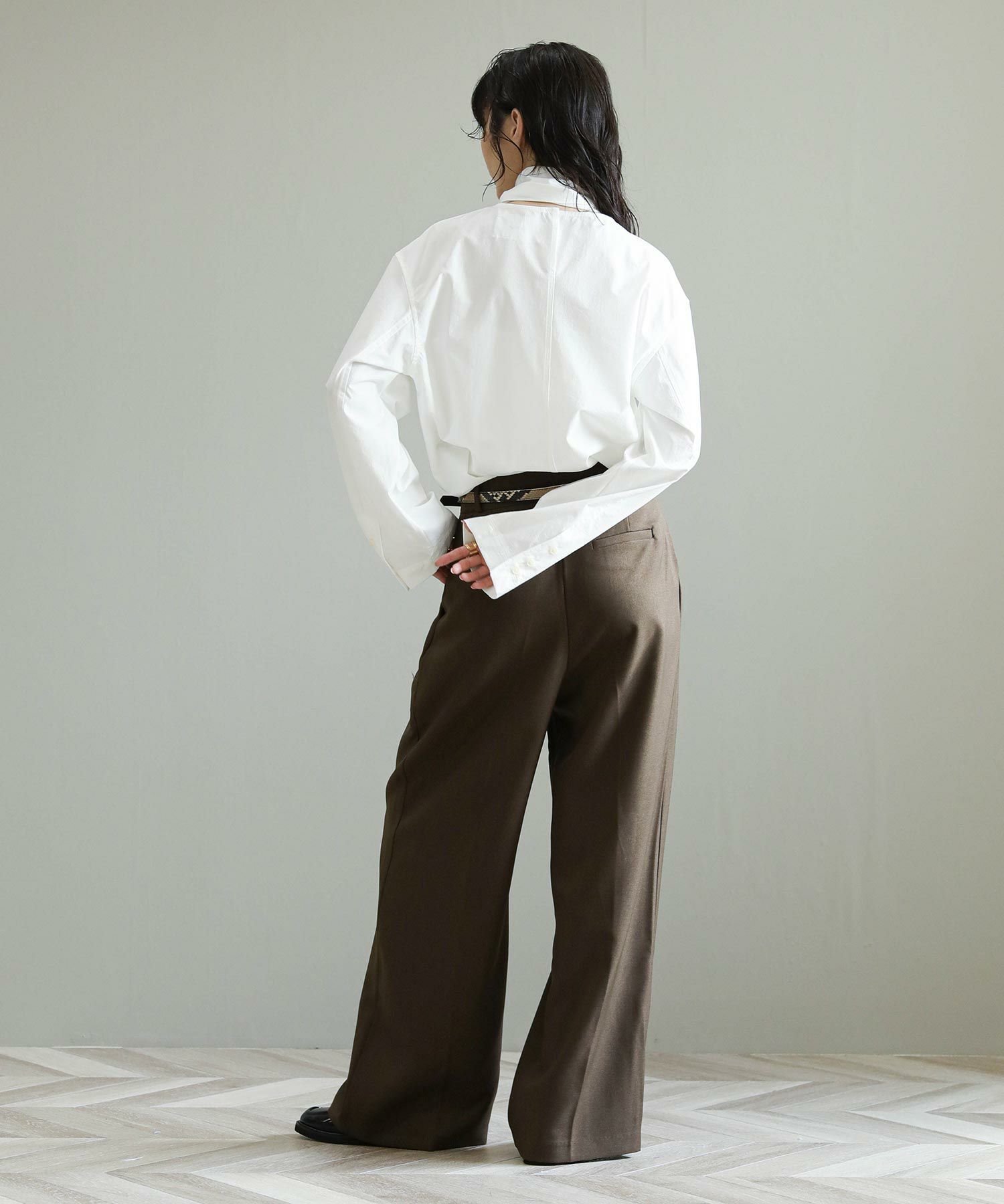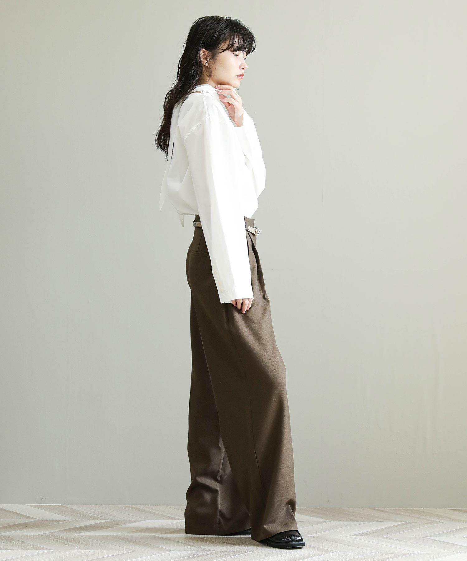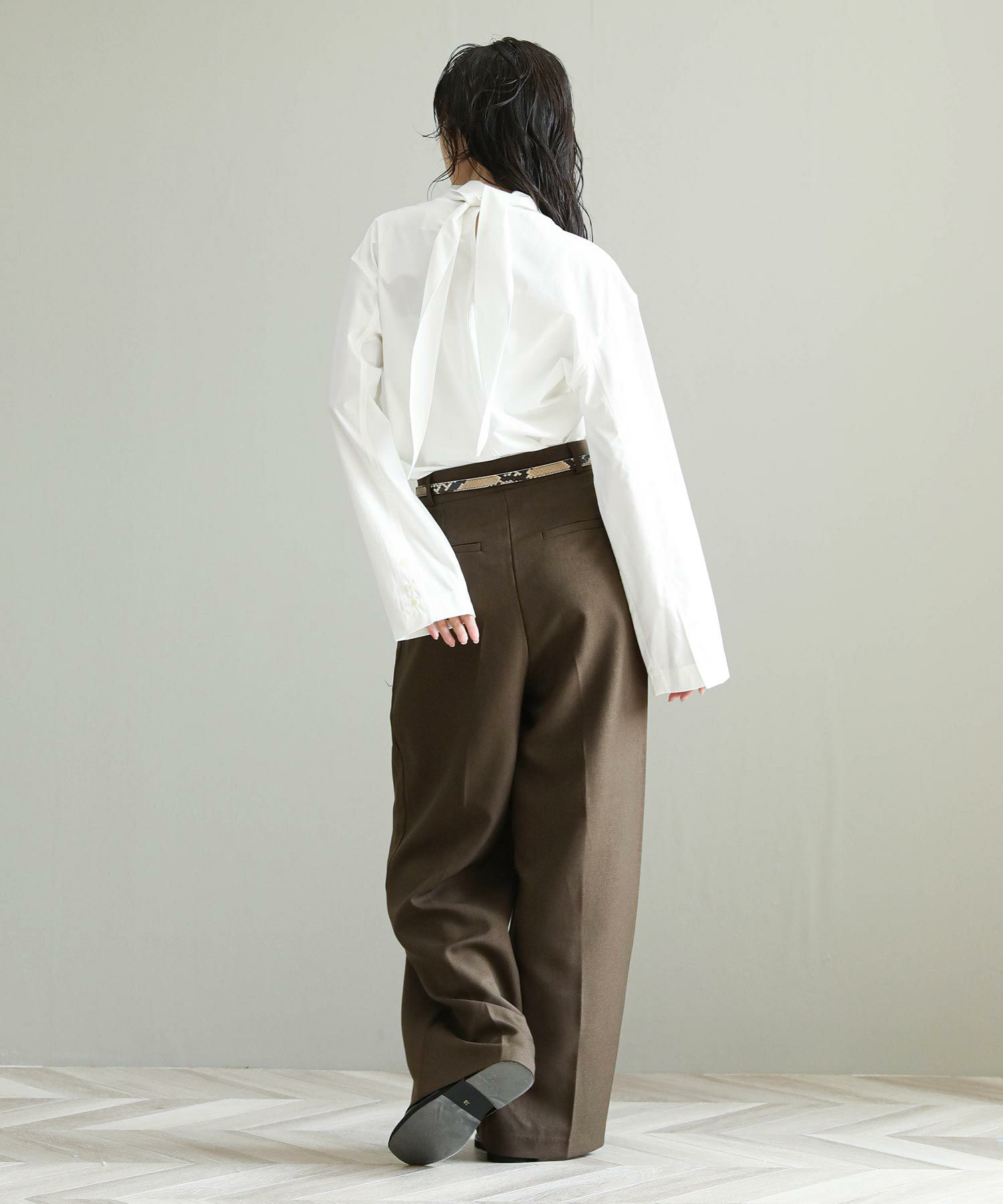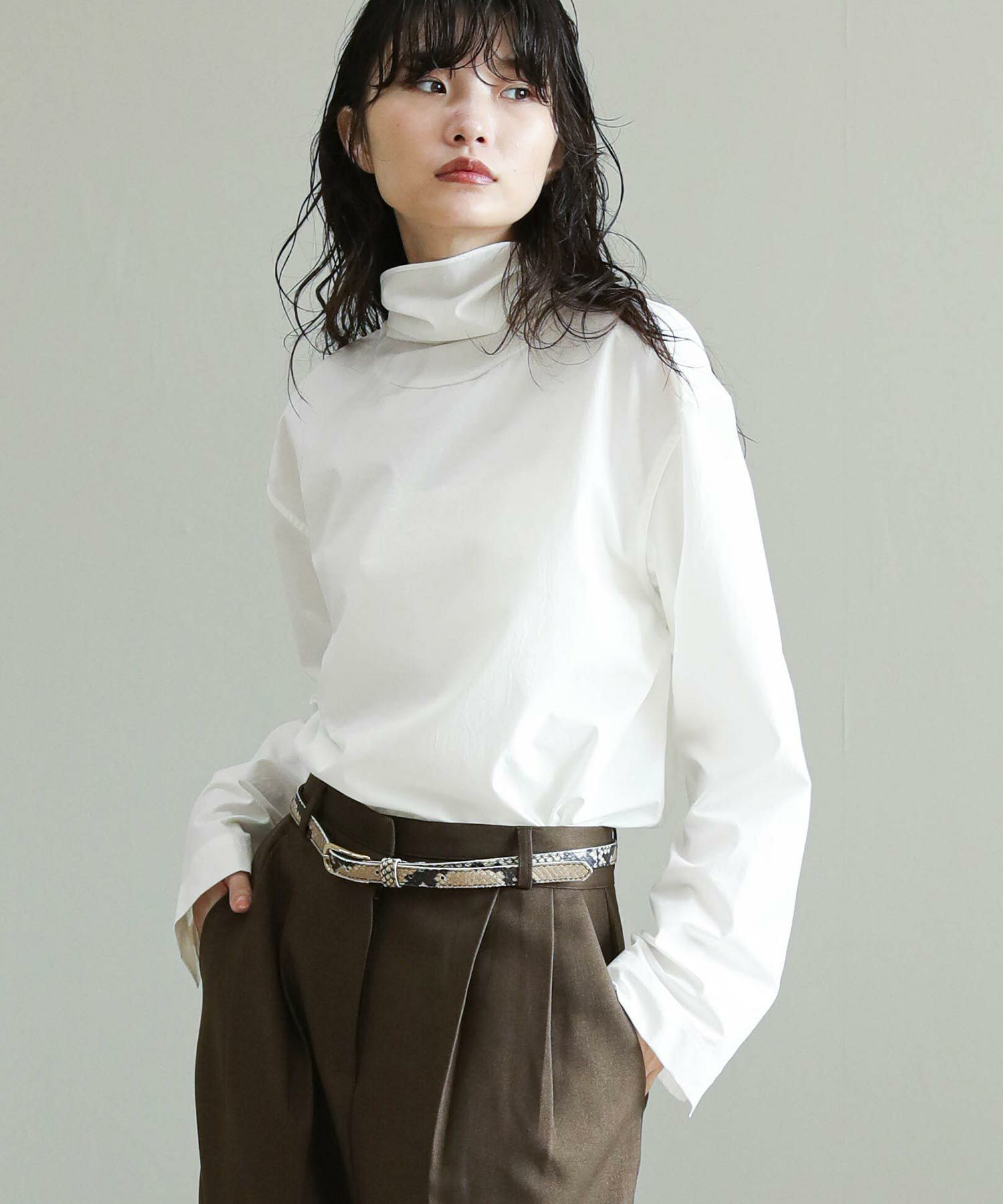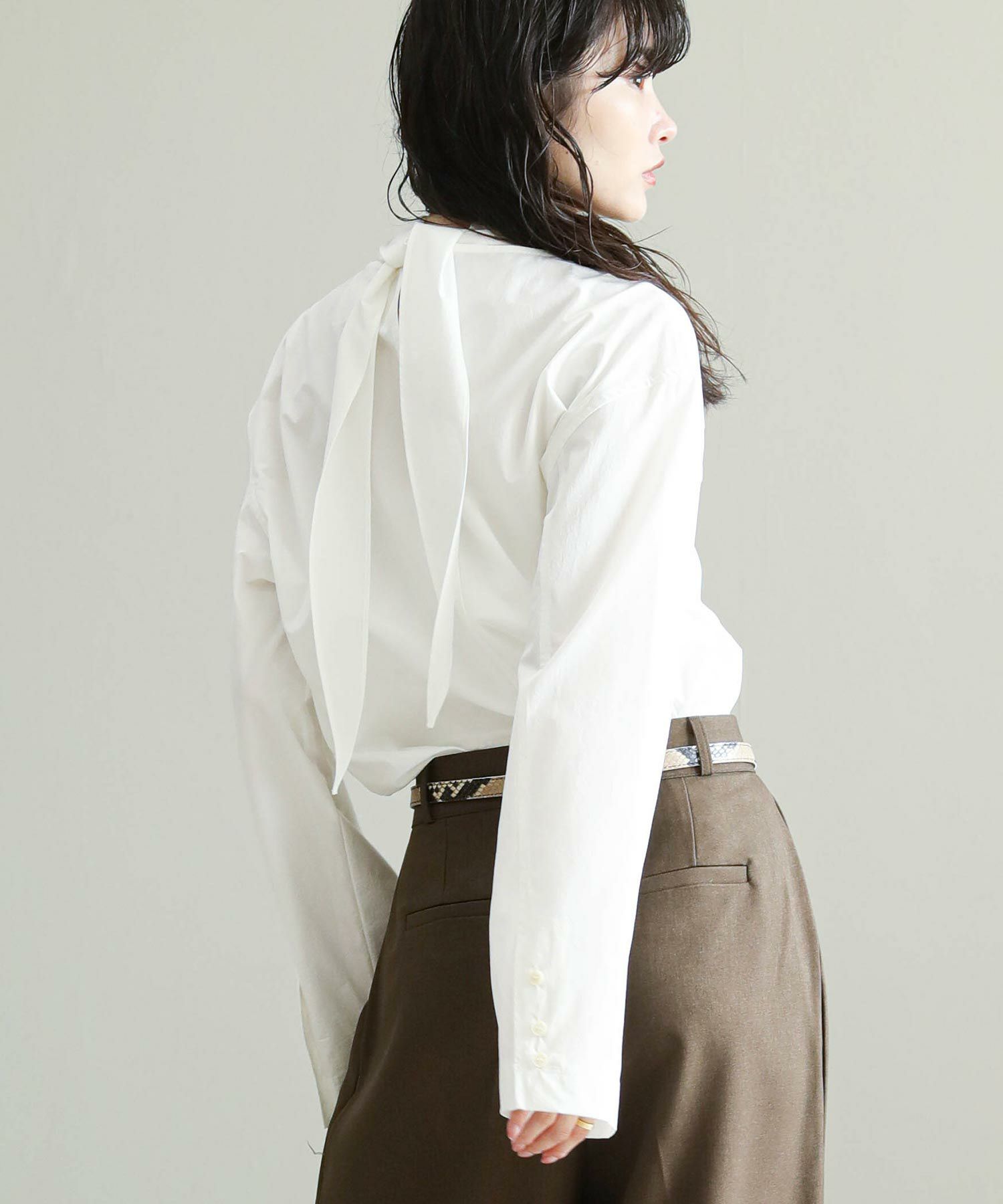 タイネックデザインはスタイリングにさりげないアクセントを加え、ボトムスのシルエットを選ばず様々な着こなしに馴染む一枚。ラウンドヘムの裾がインで着てもアウトで着てもバランスが取りやすくサマになります。