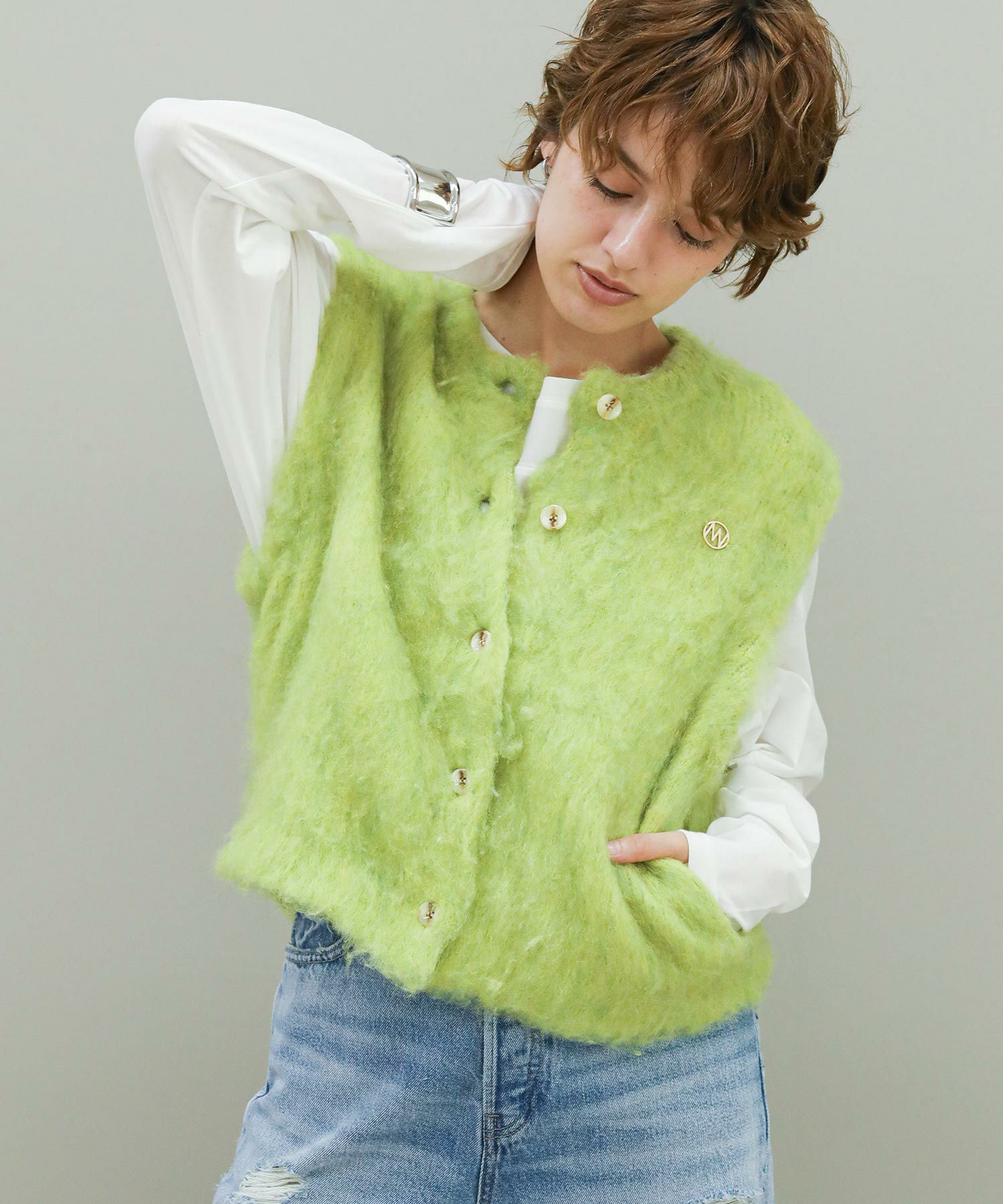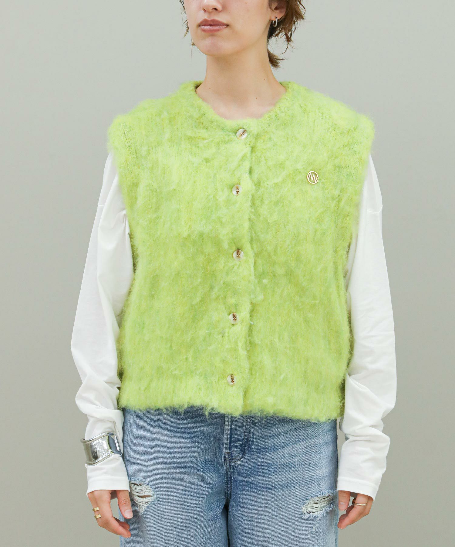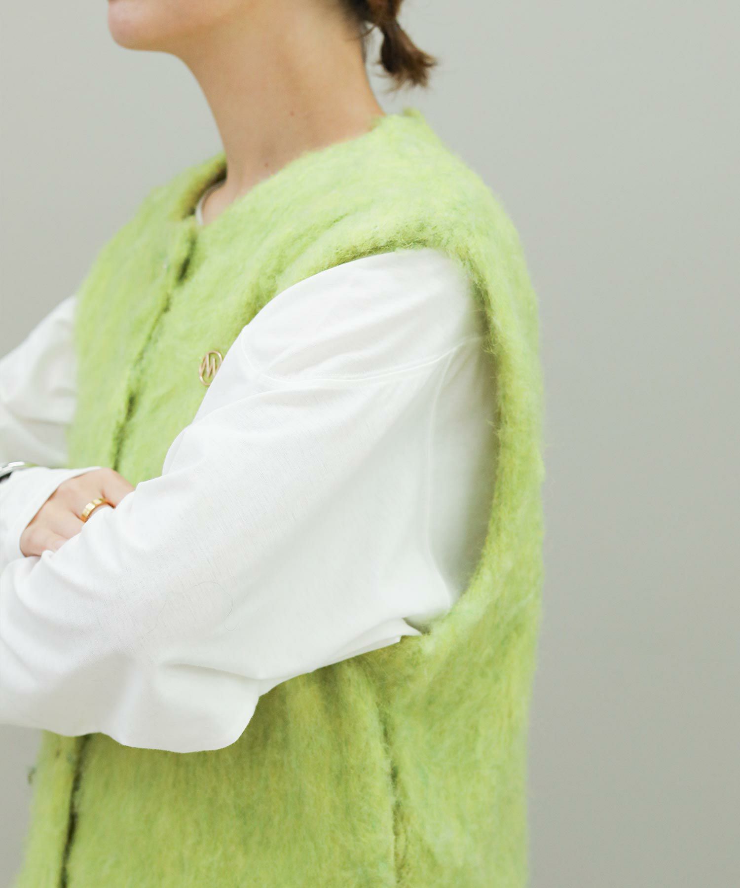 毛がきという工程で毛がフワフワと柔らかく、暖かさのある肌触りの良いニットに仕上がっています。ミニマルなデザインの釦あきベストは合わすものを選ばない、スタイリングにトレンド感をプラスしてくれる万能アイテムです。左胸のロゴチャームと、後衿下のジャカード編みロゴネームがアクセントに。水洗いできるのも嬉しいポイントです。