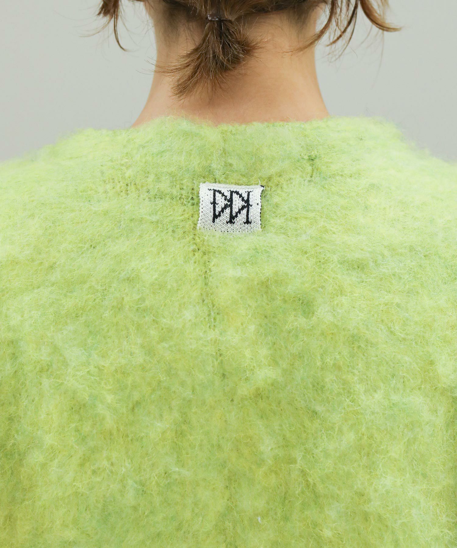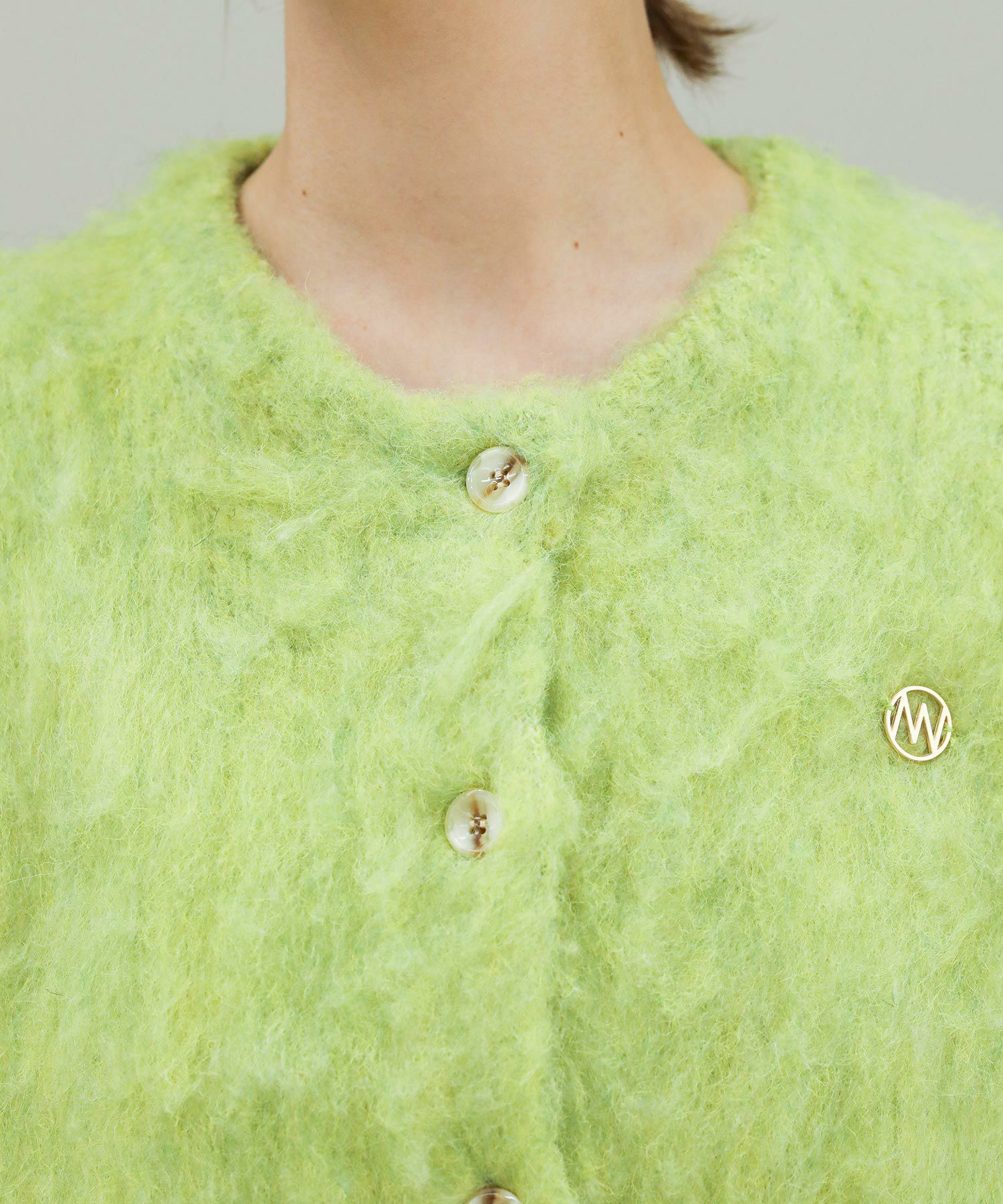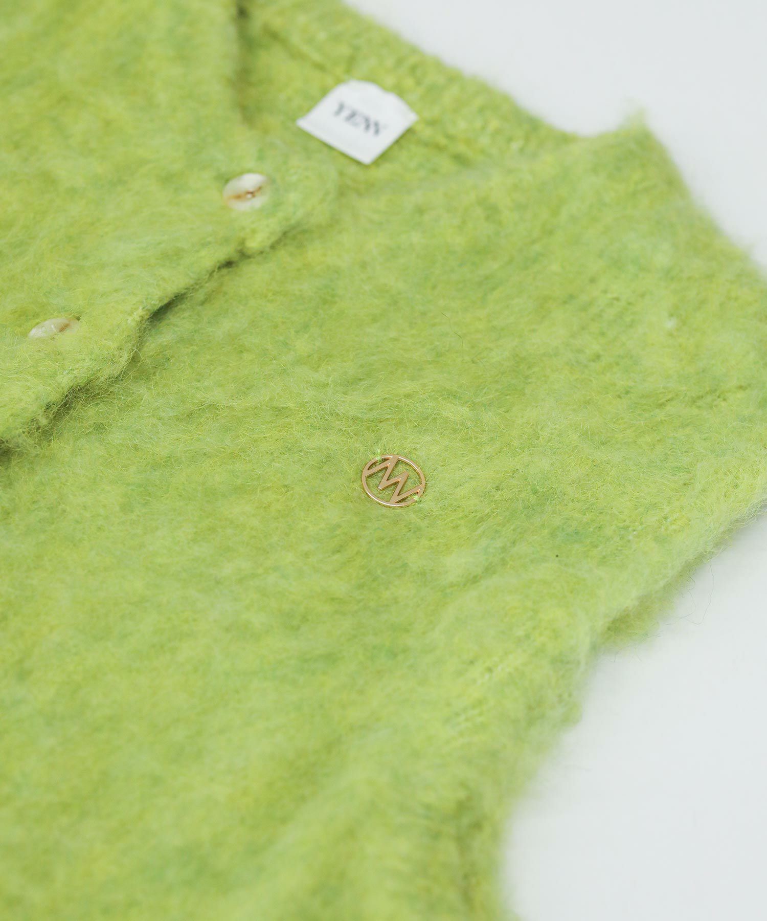 毛がきという工程で毛がフワフワと柔らかく、暖かさのある肌触りの良いニットに仕上がっています。ミニマルなデザインの釦あきベストは合わすものを選ばない、スタイリングにトレンド感をプラスしてくれる万能アイテムです。左胸のロゴチャームと、後衿下のジャカード編みロゴネームがアクセントに。水洗いできるのも嬉しいポイントです。