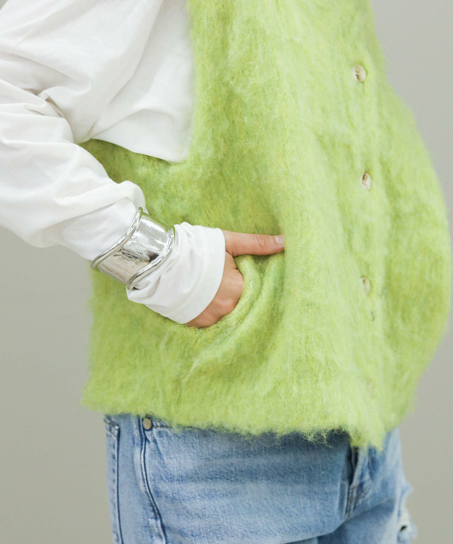 ふわふわの起毛加工が施されたニットベスト。
