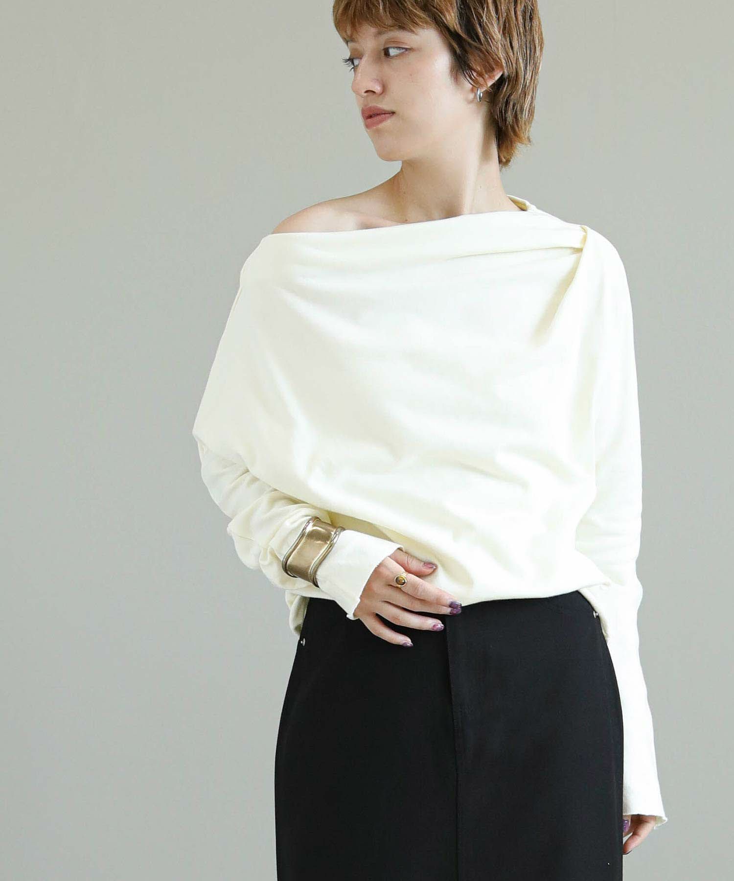 柔らかな素材感が心地よい、アシンメトリーデザインの長袖トップス。