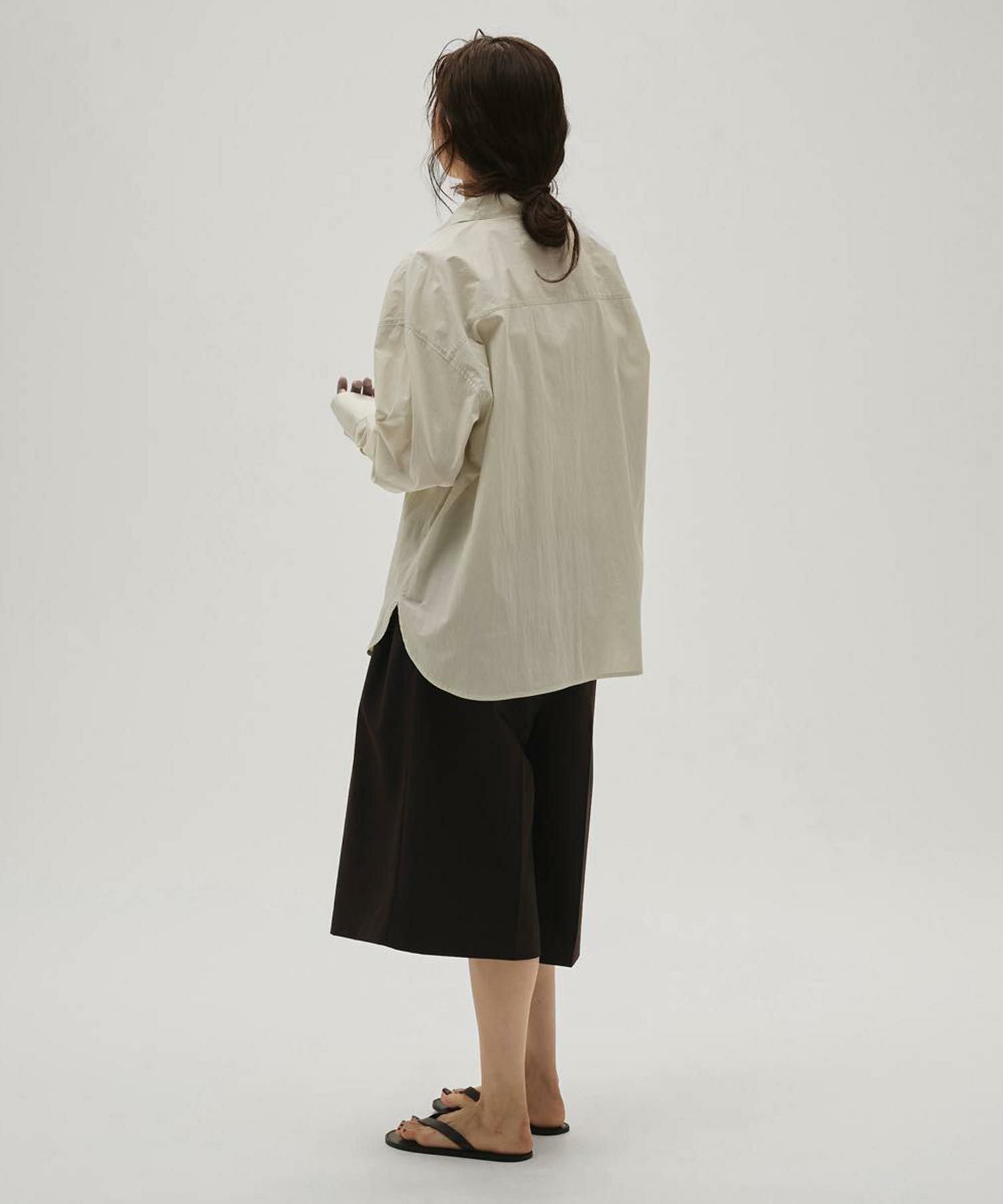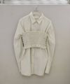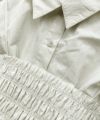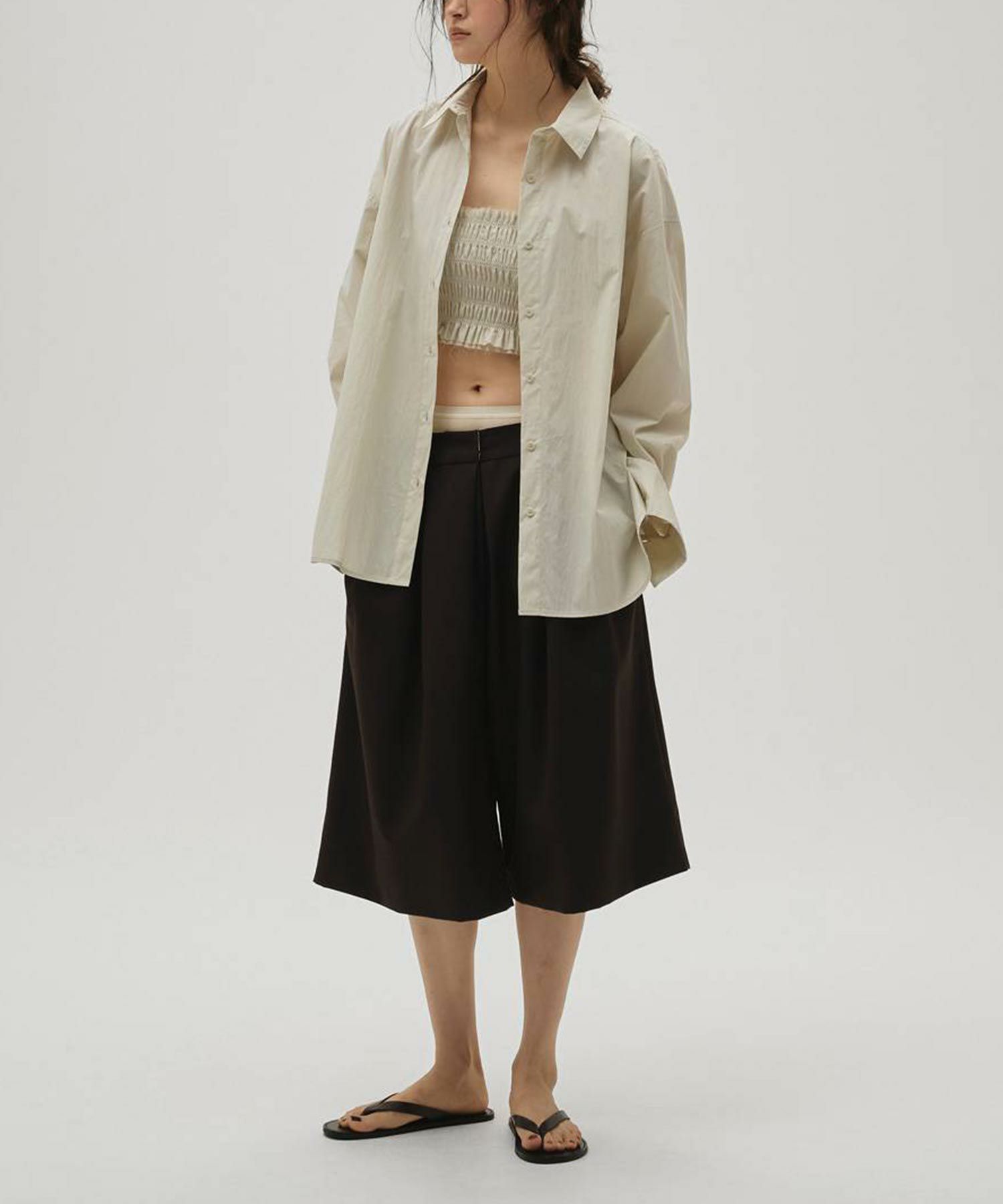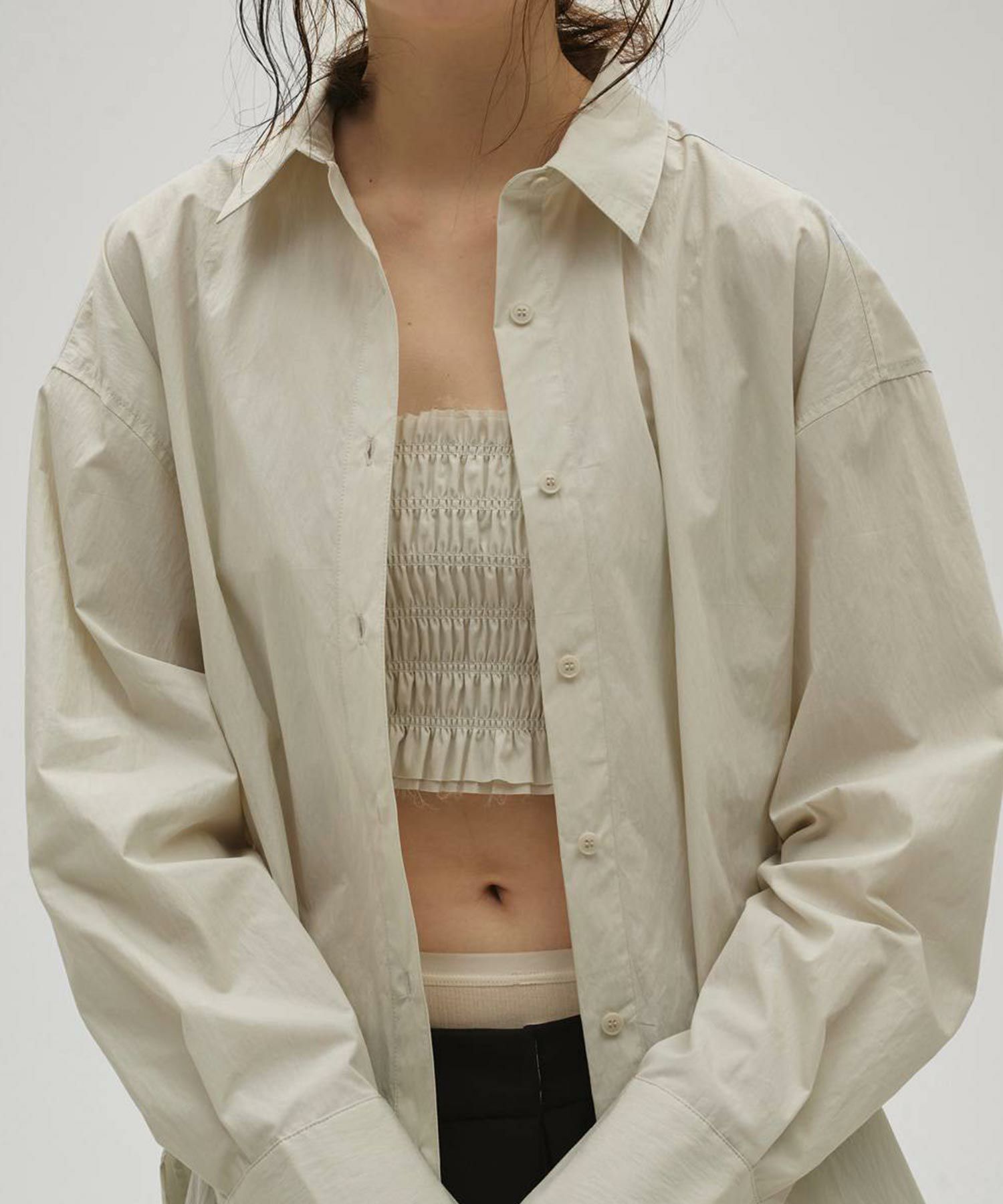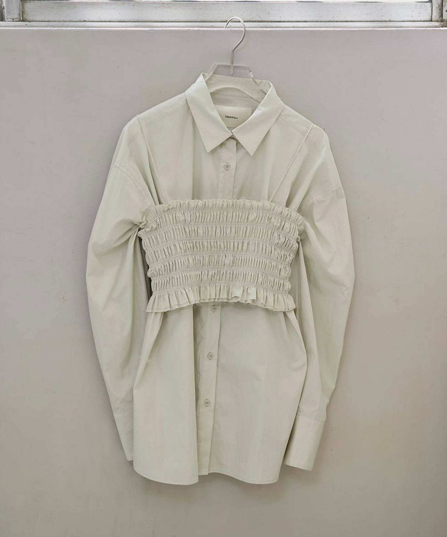 シャーリングを贅沢に施したビスチェは、裾端をカットオフ仕様の二枚仕立てにすることで、程良い抜け感と奥行きをプラス。ミニマルなディテールのシャツと表情豊かなビスチェのコントラストが絶妙なバランスを生み、シンプルなボトムスに合わせるだけでこなれた雰囲気に仕上がる一着。ビスチェとシャツはそれぞれ単品でも着用可能で、お手持ちのアイテムとのレイヤードなど幅広いスタイリングに活躍します。