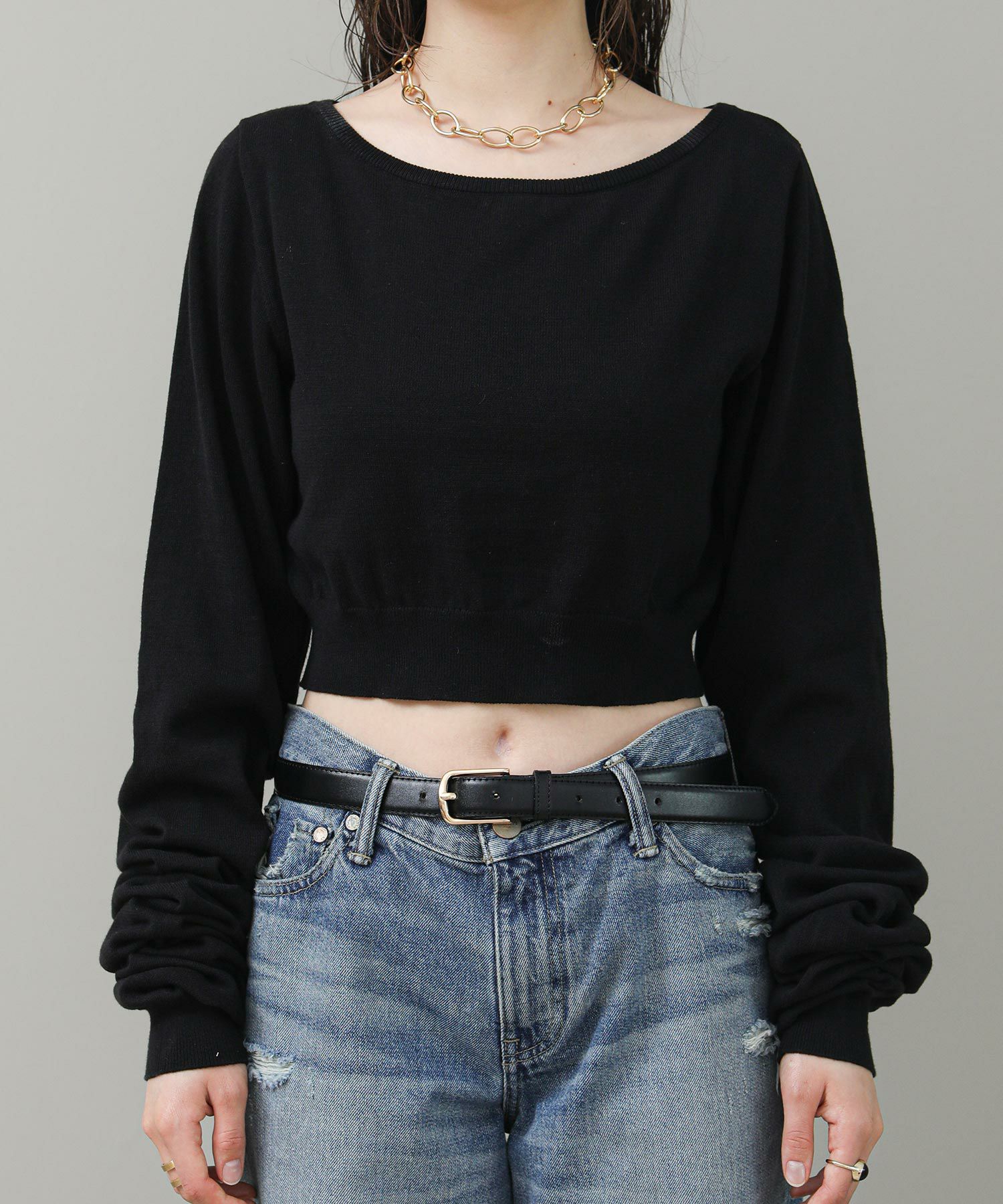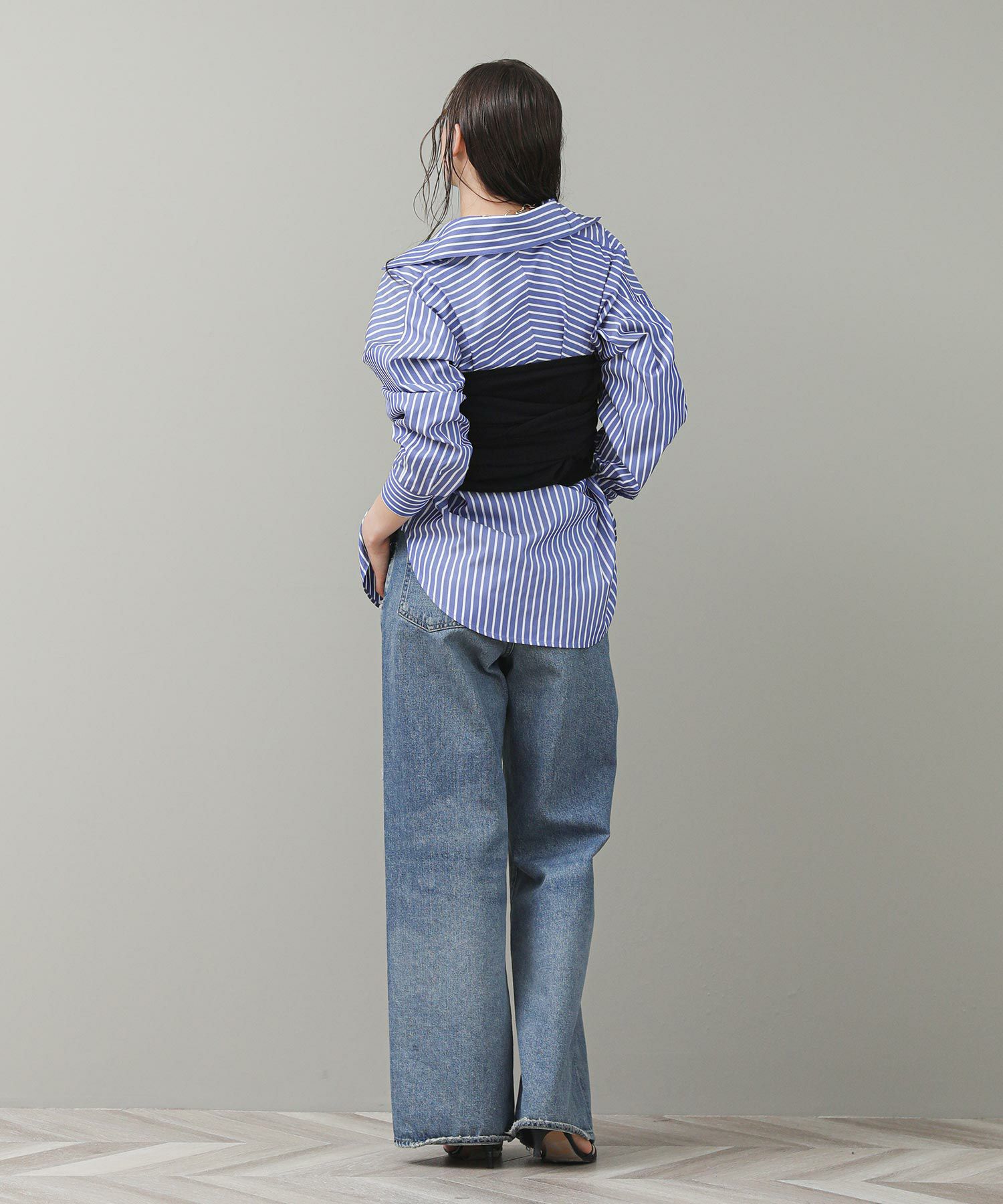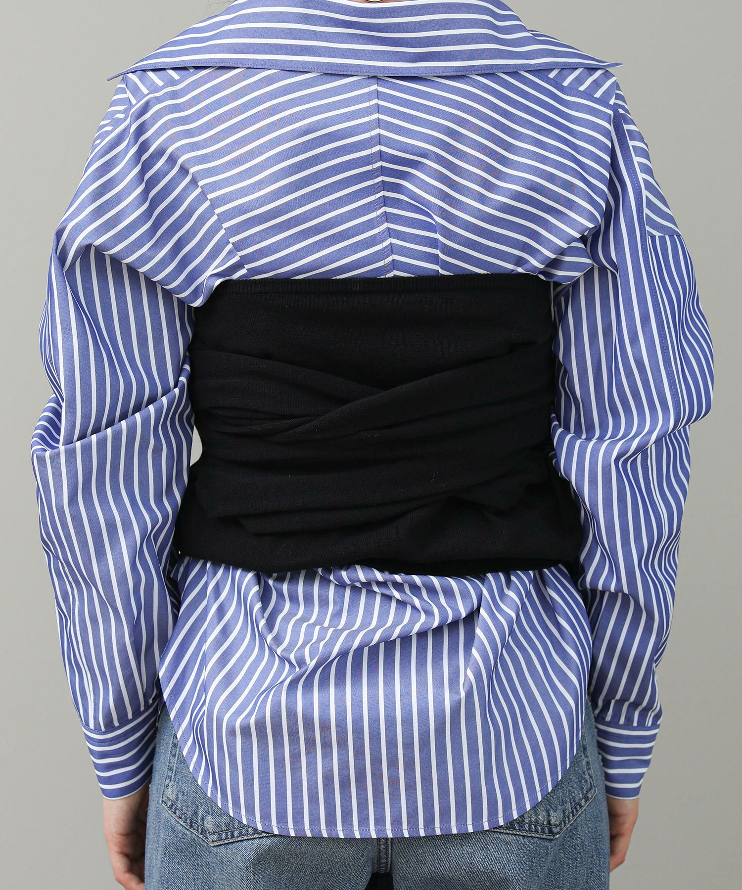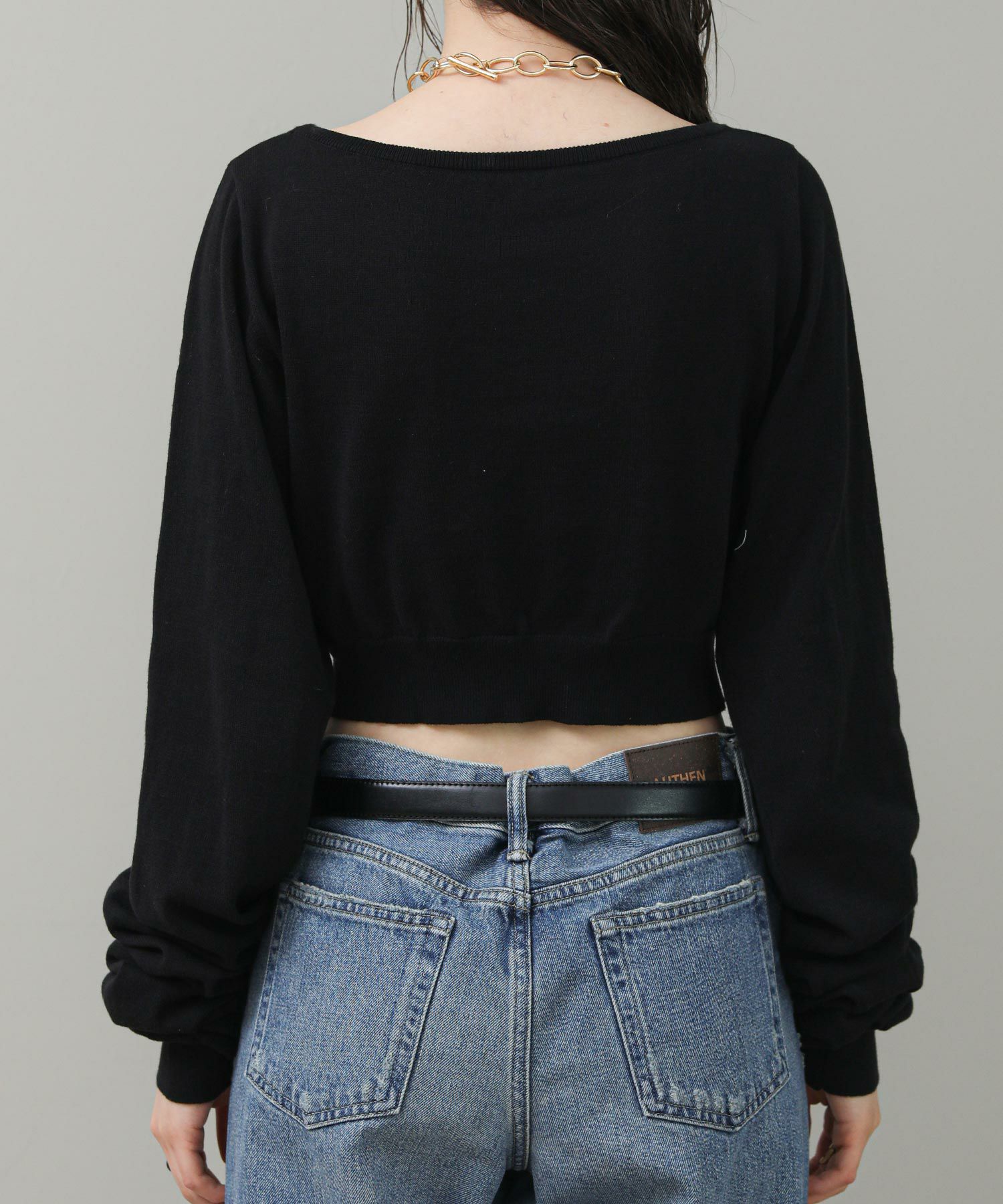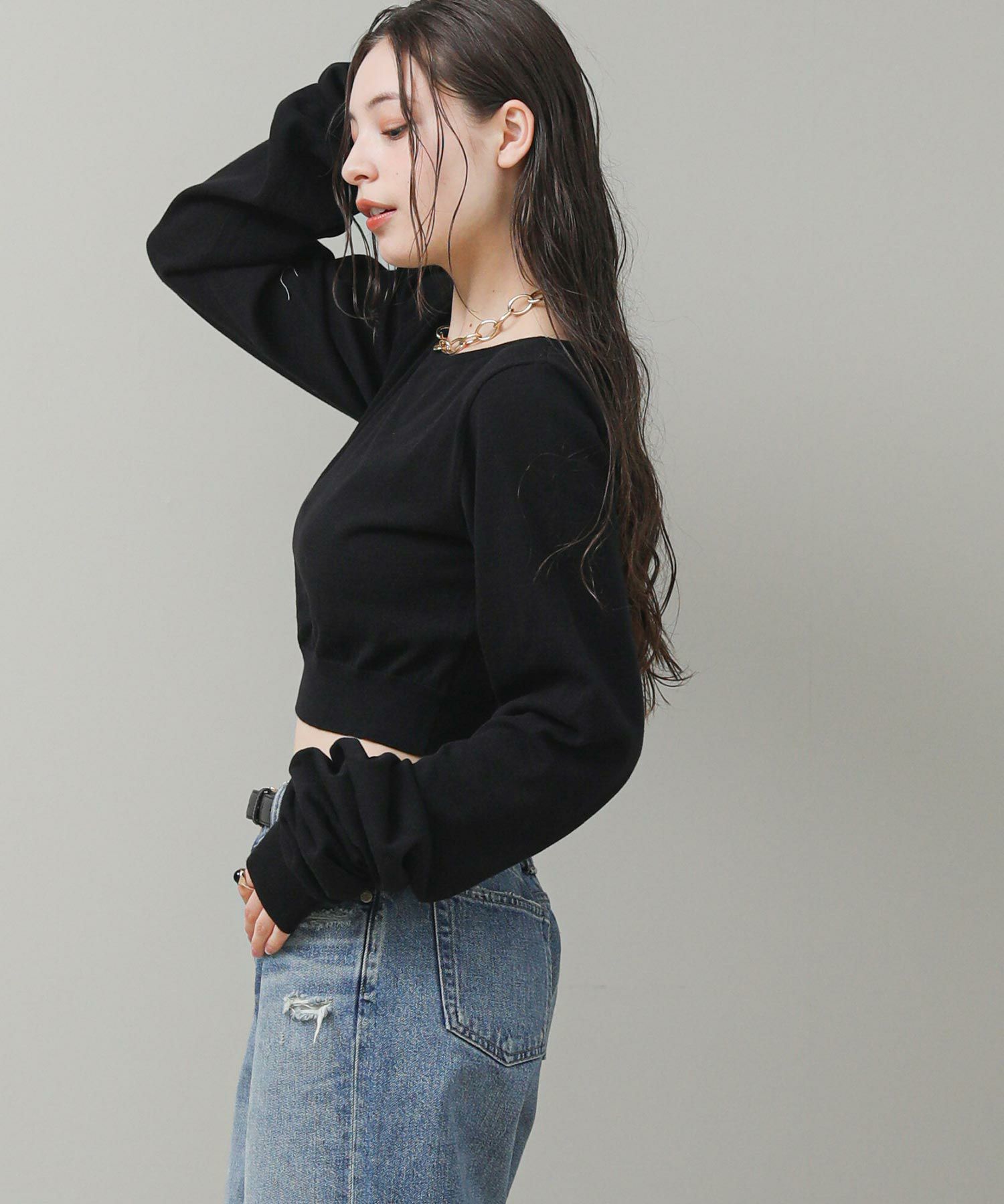 ビスチェにもなる2way仕様です。長い袖はぐるっとボディに前後 どちらでも巻き付けられます。プルオーバーとして着ると、オフショル風にも着られます。長い袖の上からバングルなど小物でアレンジをするのもおすすめ。スタイルの幅が広がるアイテムです。