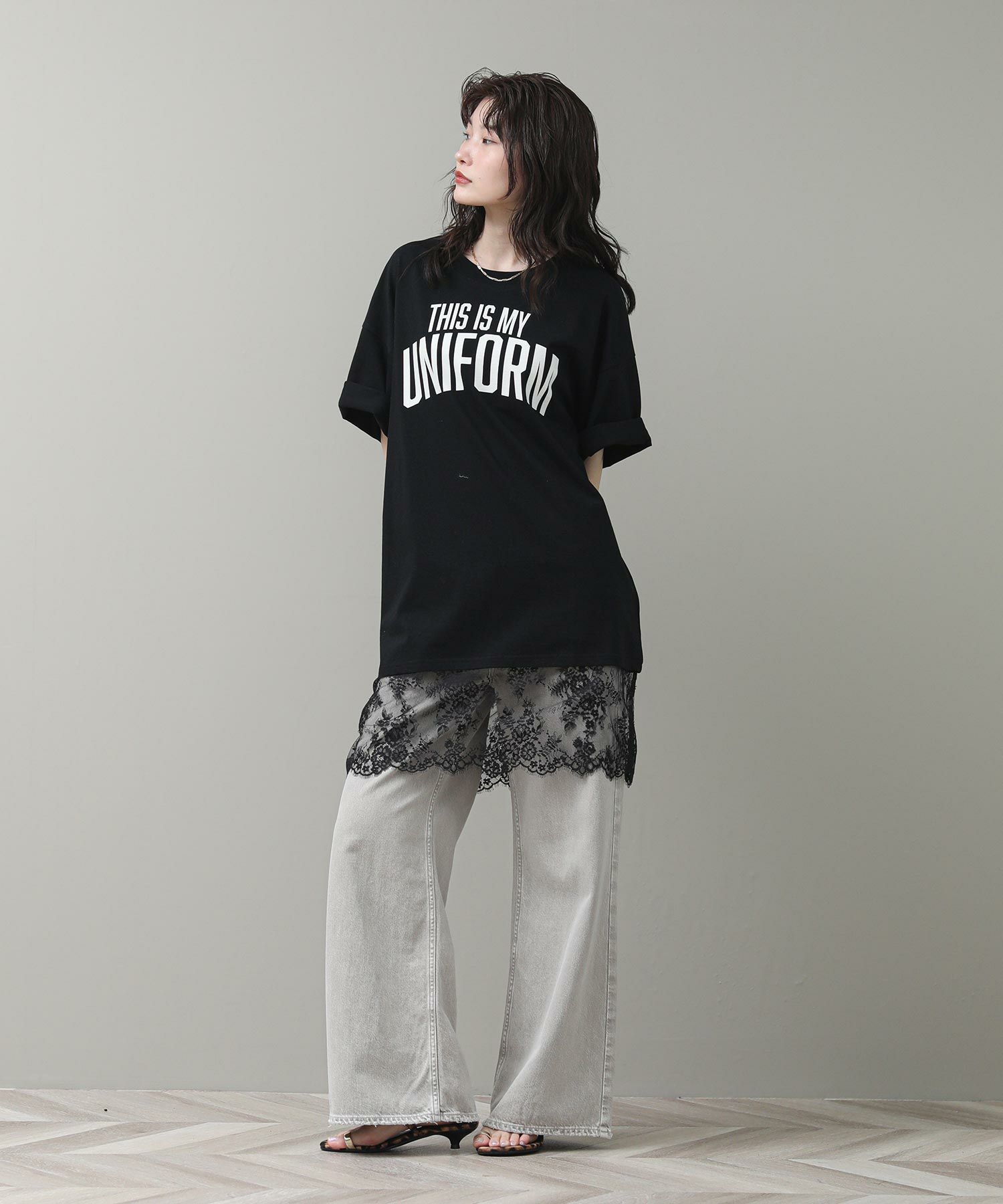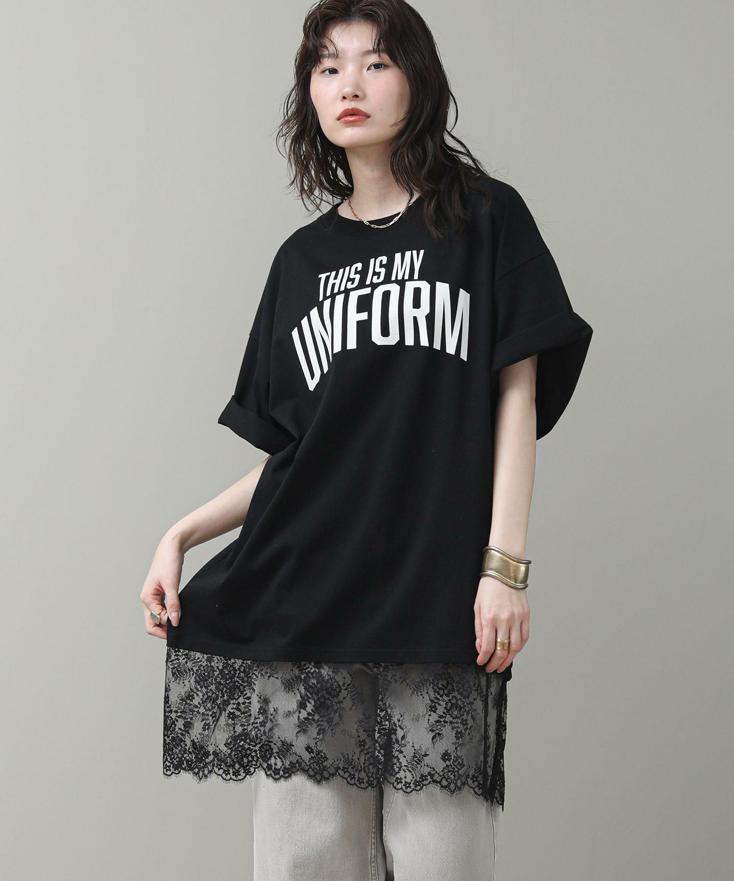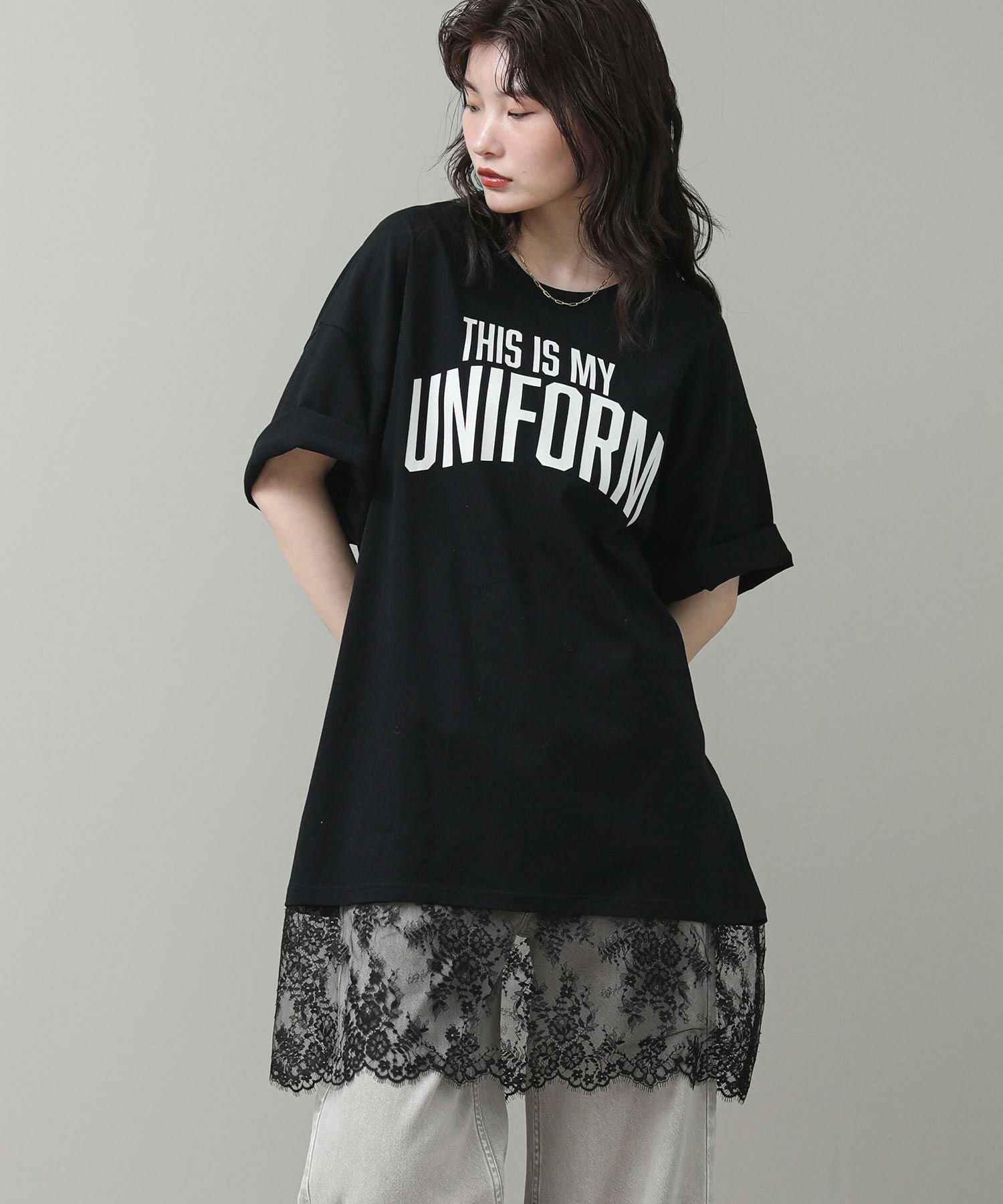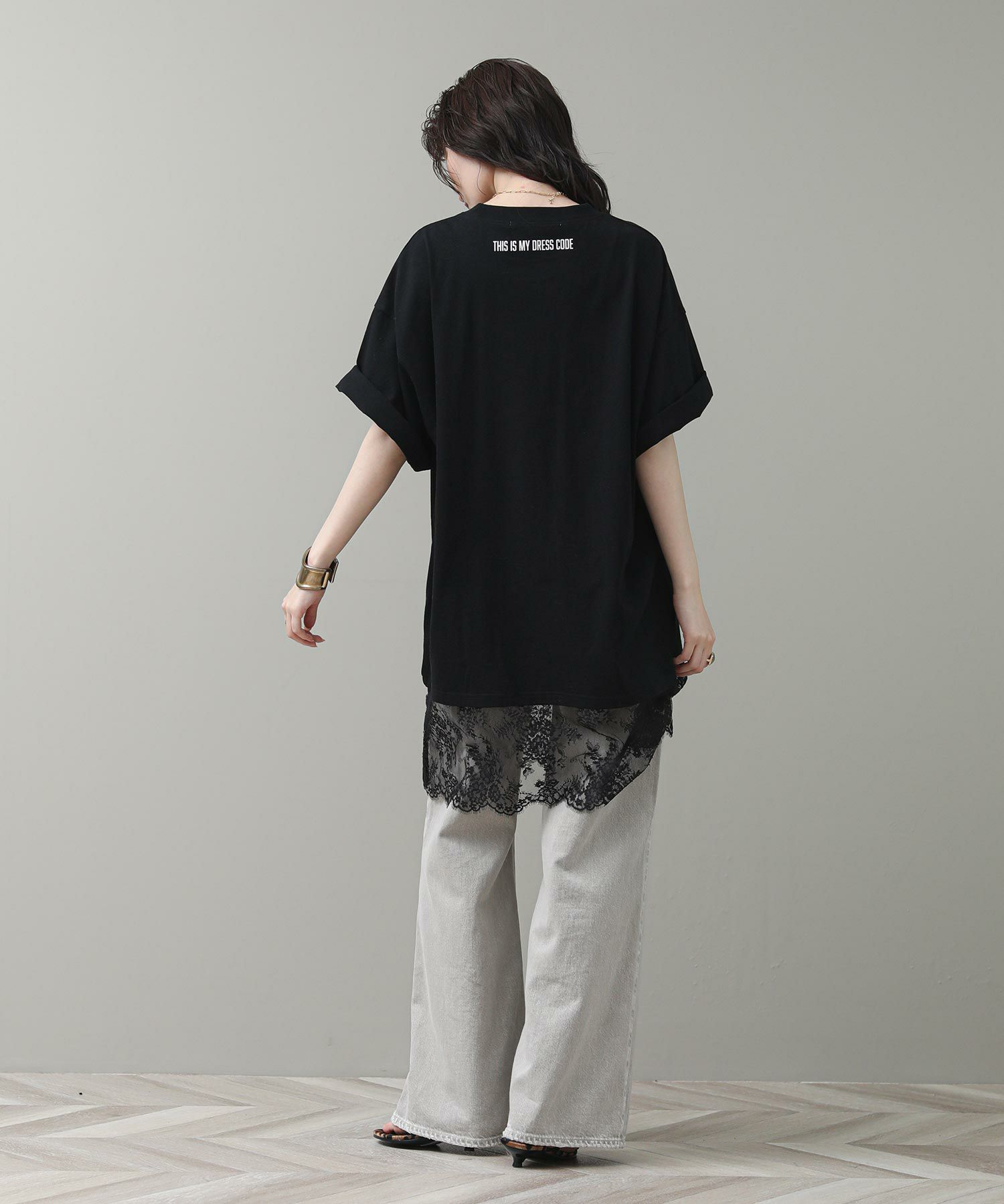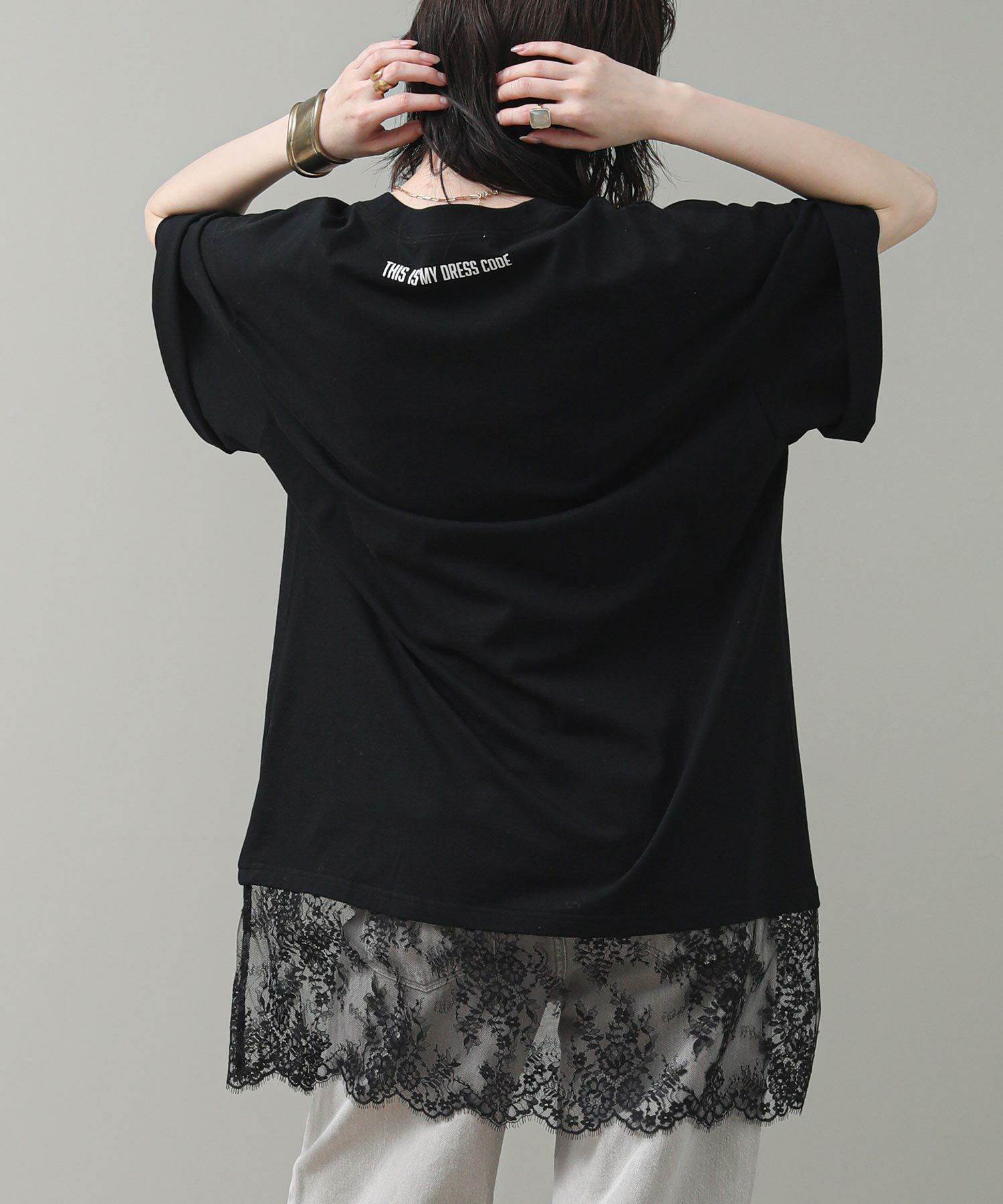 す。甘くなりがちなレースを大人の女性が着てもかっこよく着られるアイテムです。前後のロゴでバックスタイルも決まります。