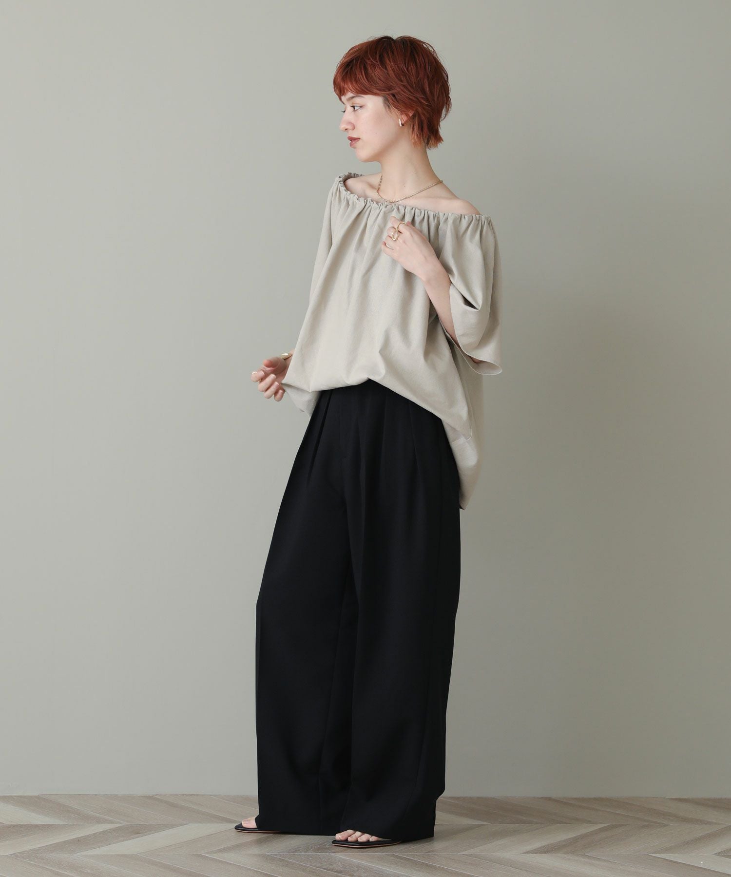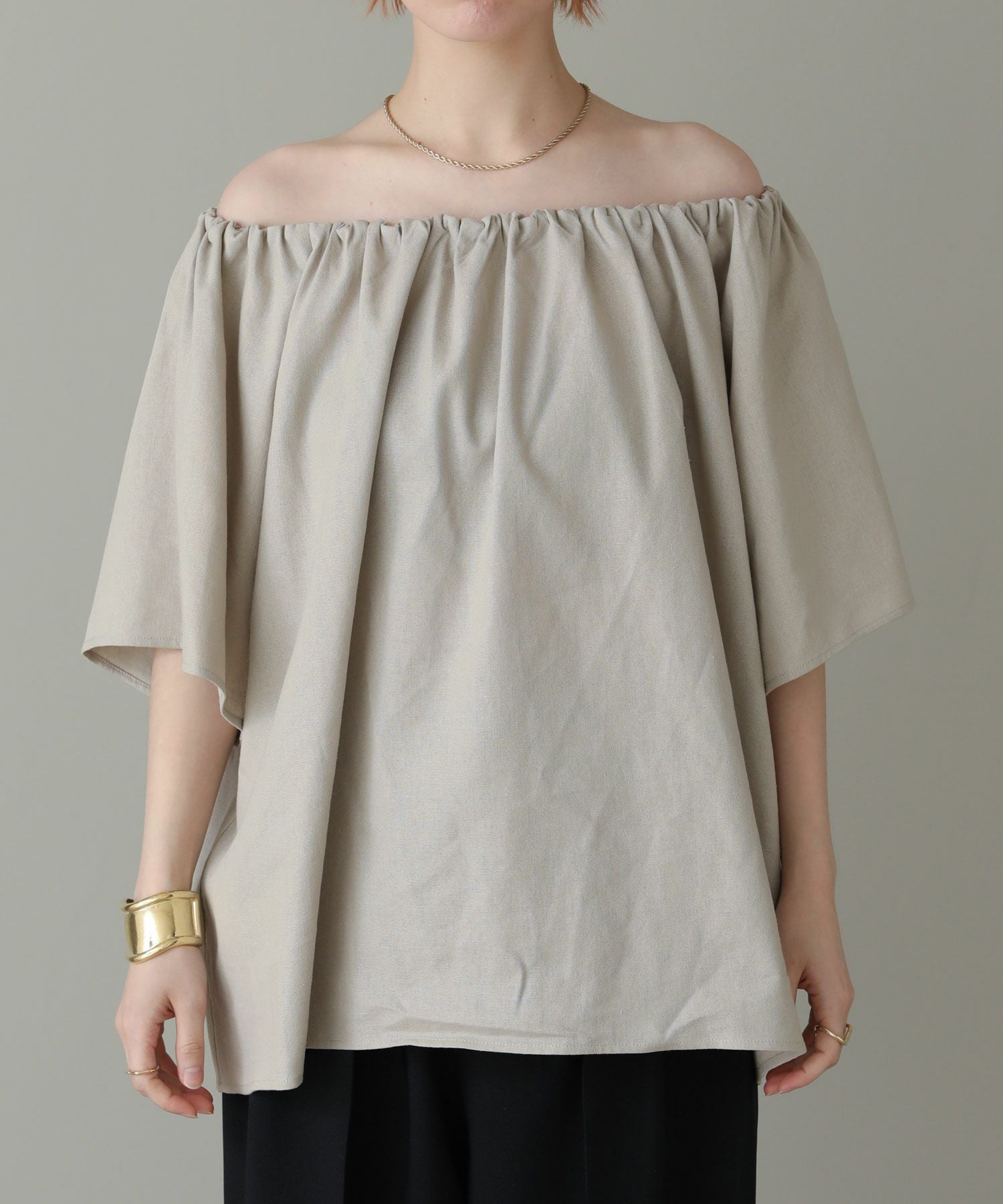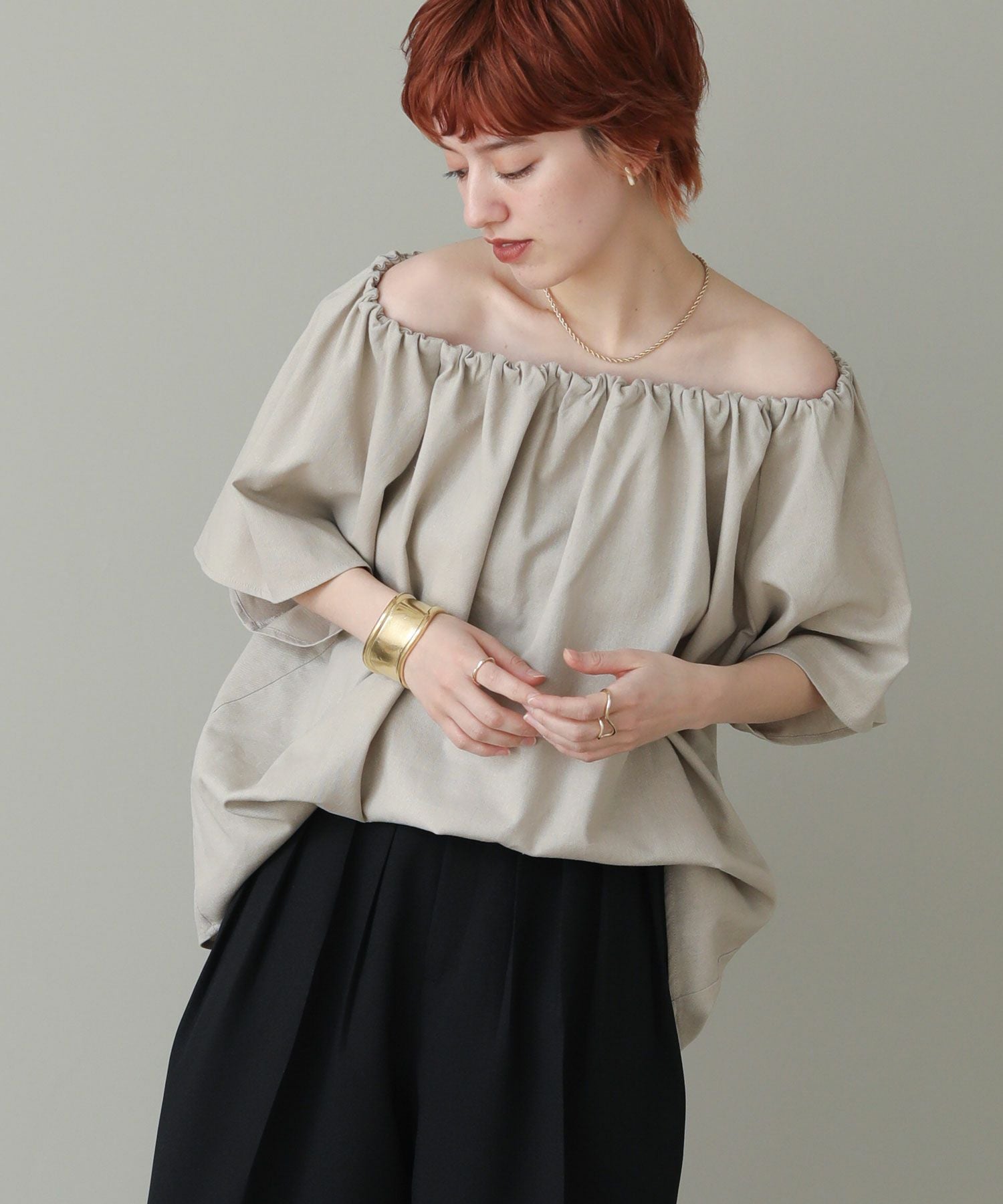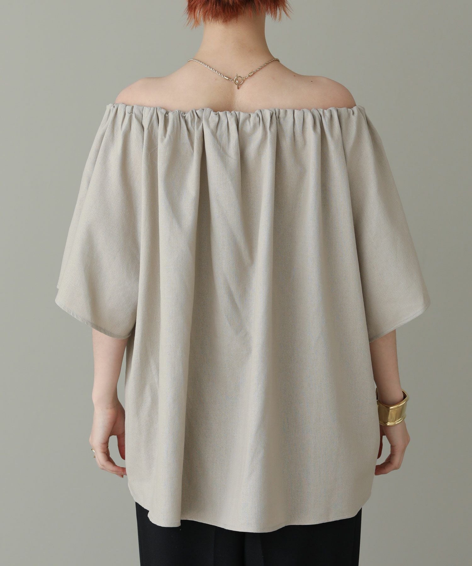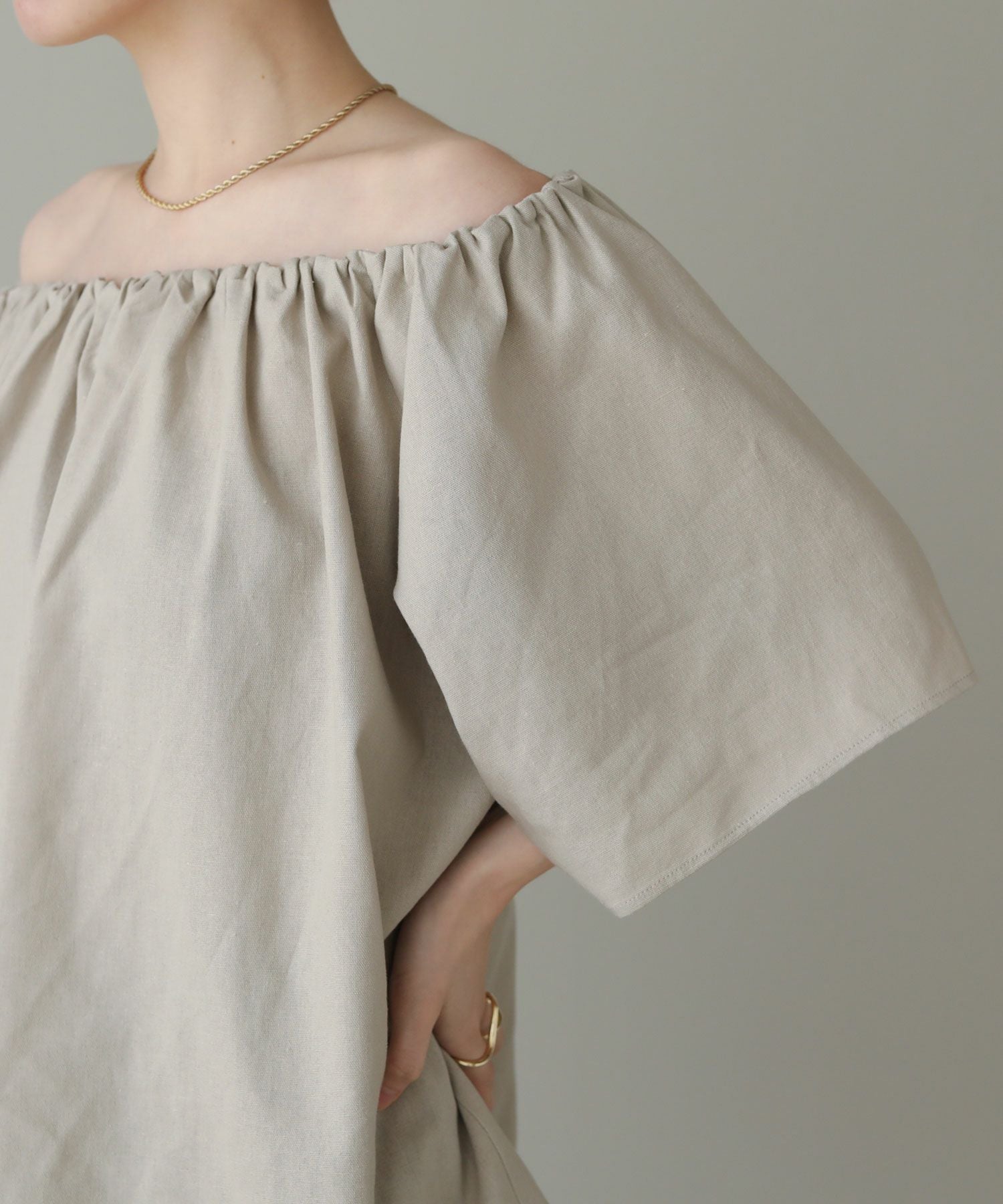 ネックのギャザーでオフショルダーとしても着ていただけます。袖は二の腕をカバーしながら風通しの良いフレアスリーブに。着丈は腰のラインをカバーしてくれるように設定しています。前裾だけタックインしてもニュアンスのあるシルエットをつくります。