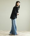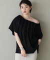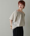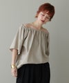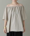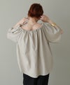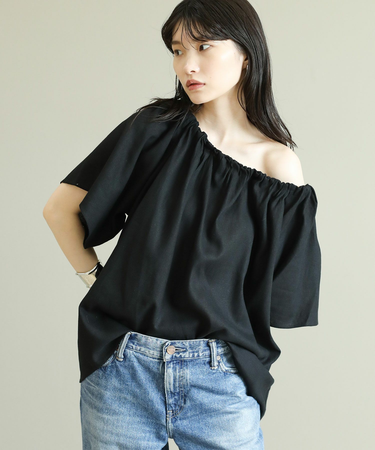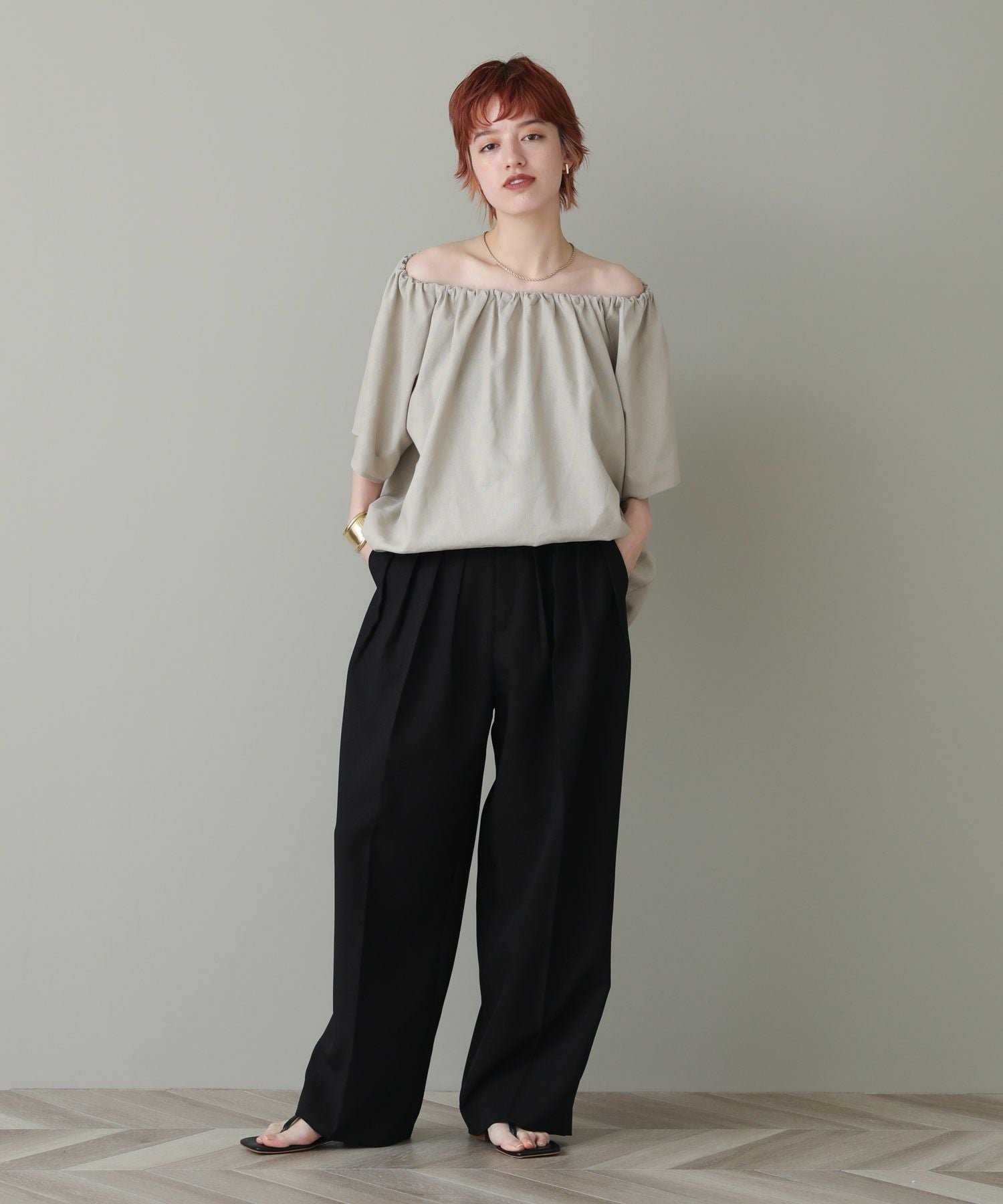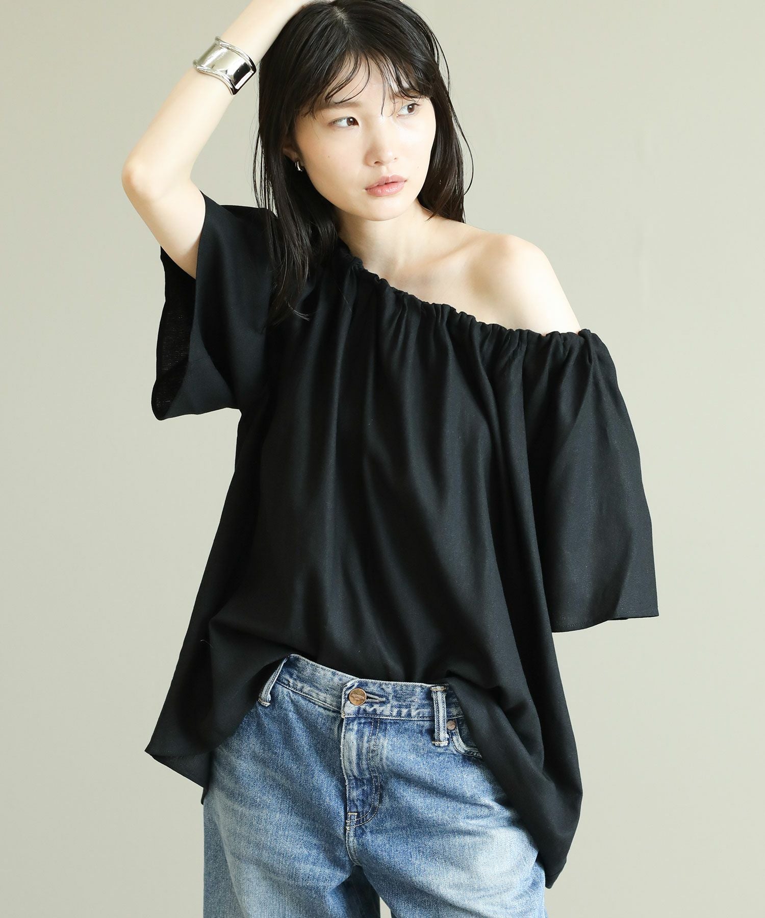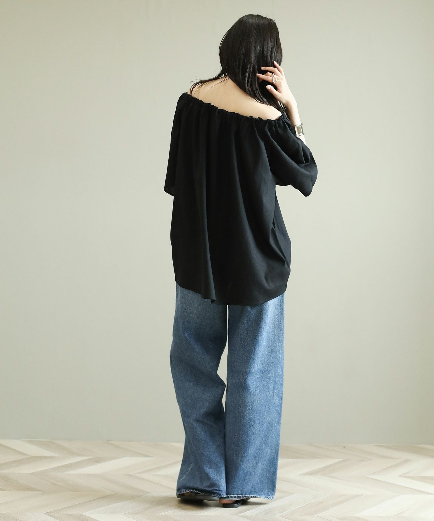 ネックのギャザーでオフショルダーとしても着ていただけます。袖は二の腕をカバーしながら風通しの良いフレアスリーブに。着丈は腰のラインをカバーしてくれるように設定しています。前裾だけタックインしてもニュアンスのあるシルエットをつくります。