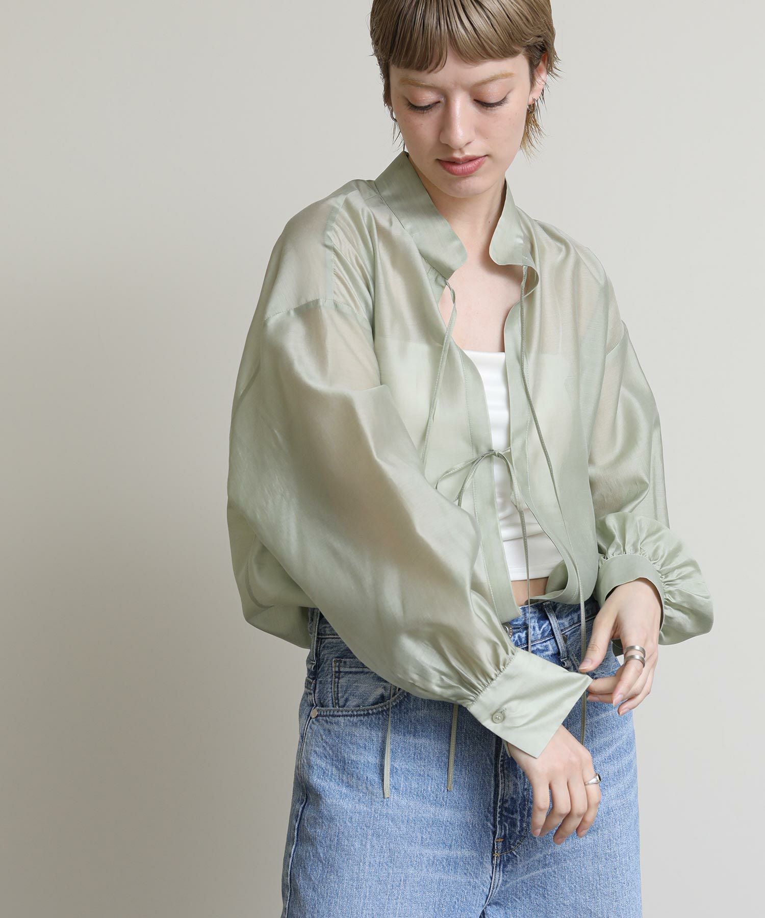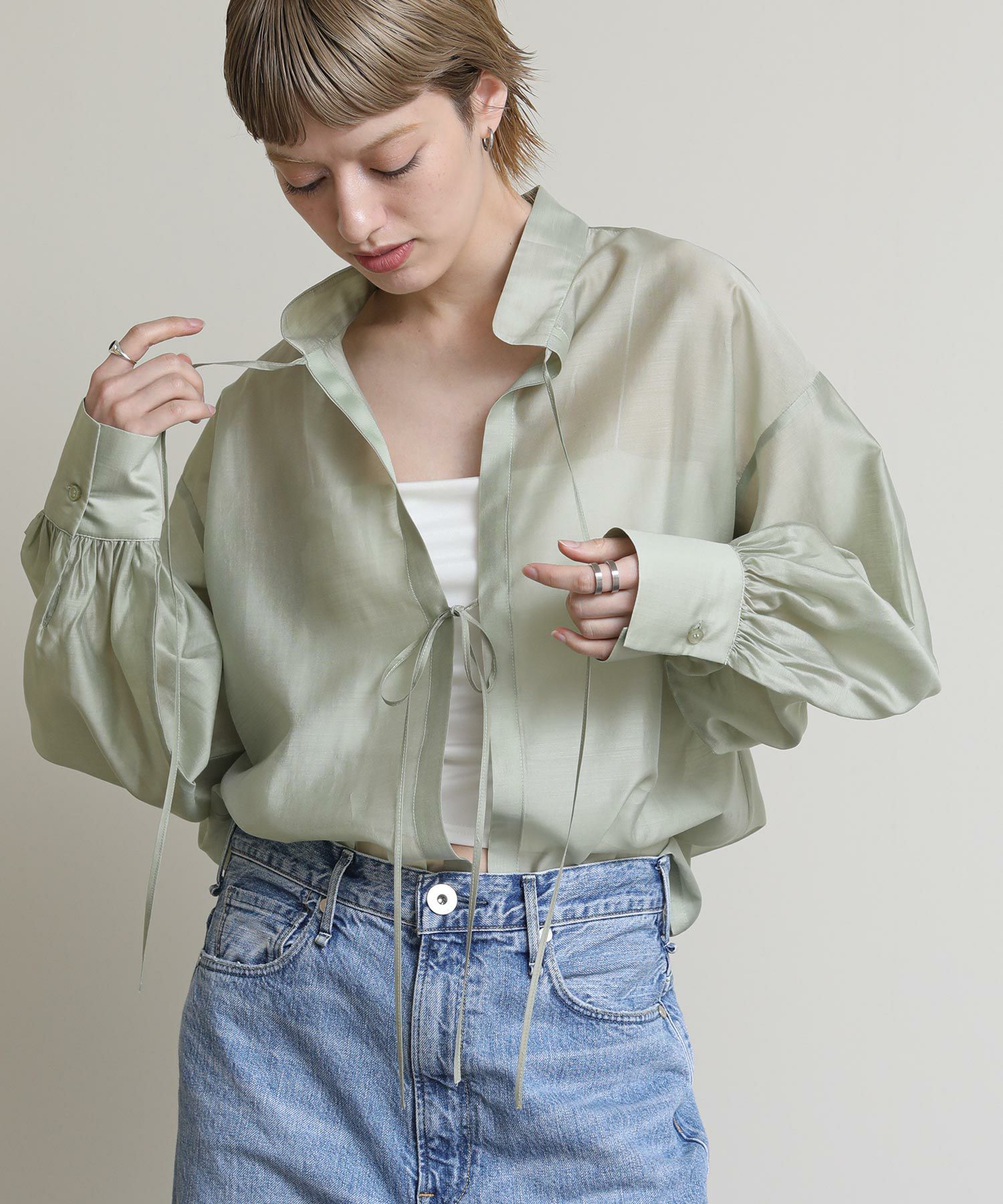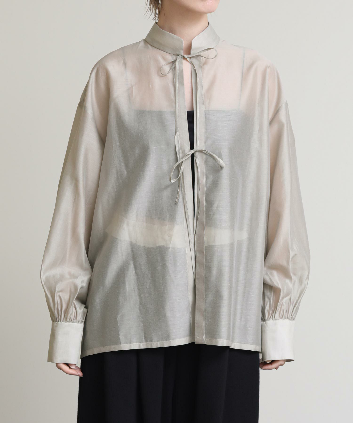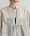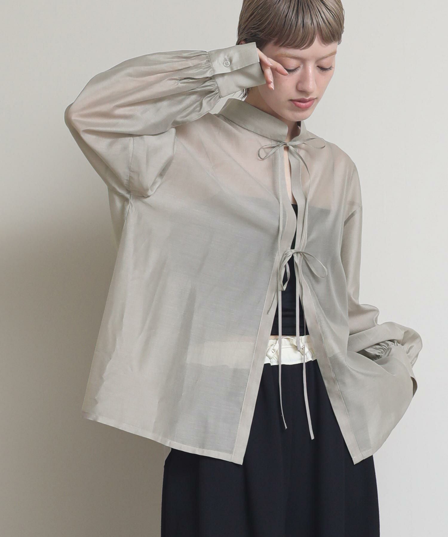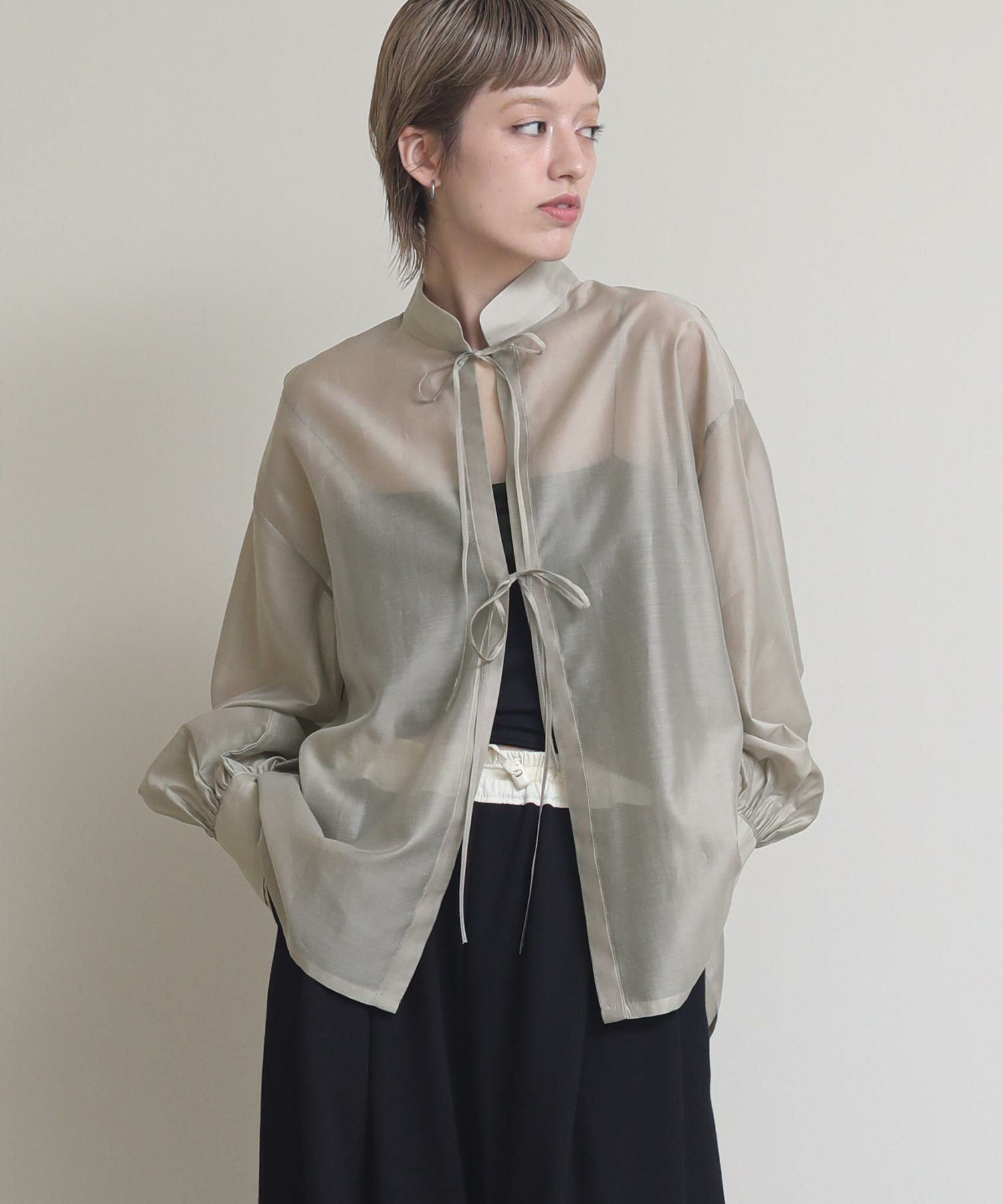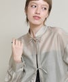 程よい透け感がこなれ感を演出してくれます。流行りのリボンをあしらったデザインですがスタンドカラーで甘すぎない印象です。緩やかな前後差があるデザインなのでおしり回りもカバーしてくれます。リボンをほどいて羽織としても◎春夏に選びたくなるライトグレー、ライトグリーンの2色展開です。