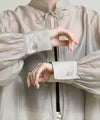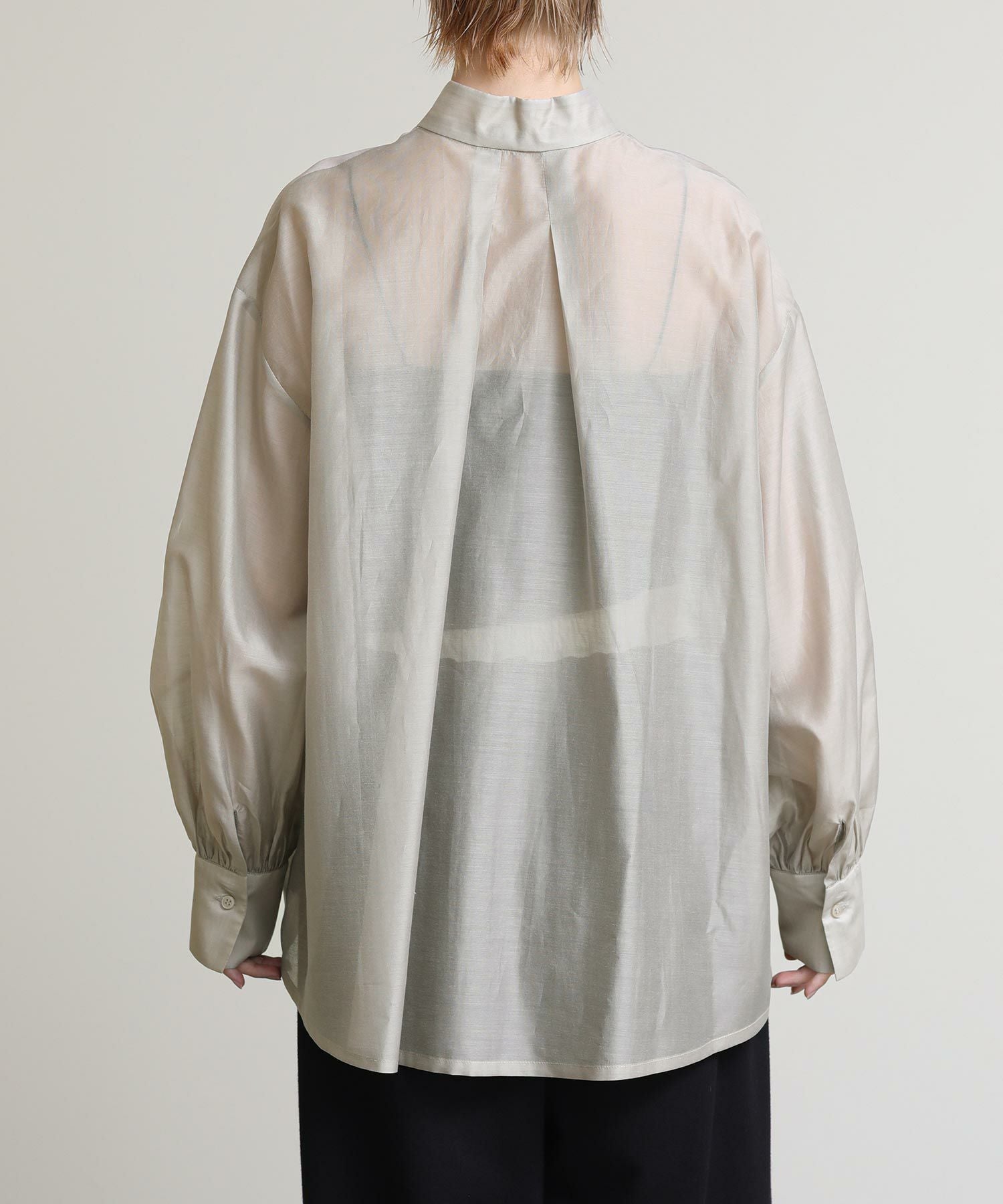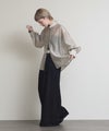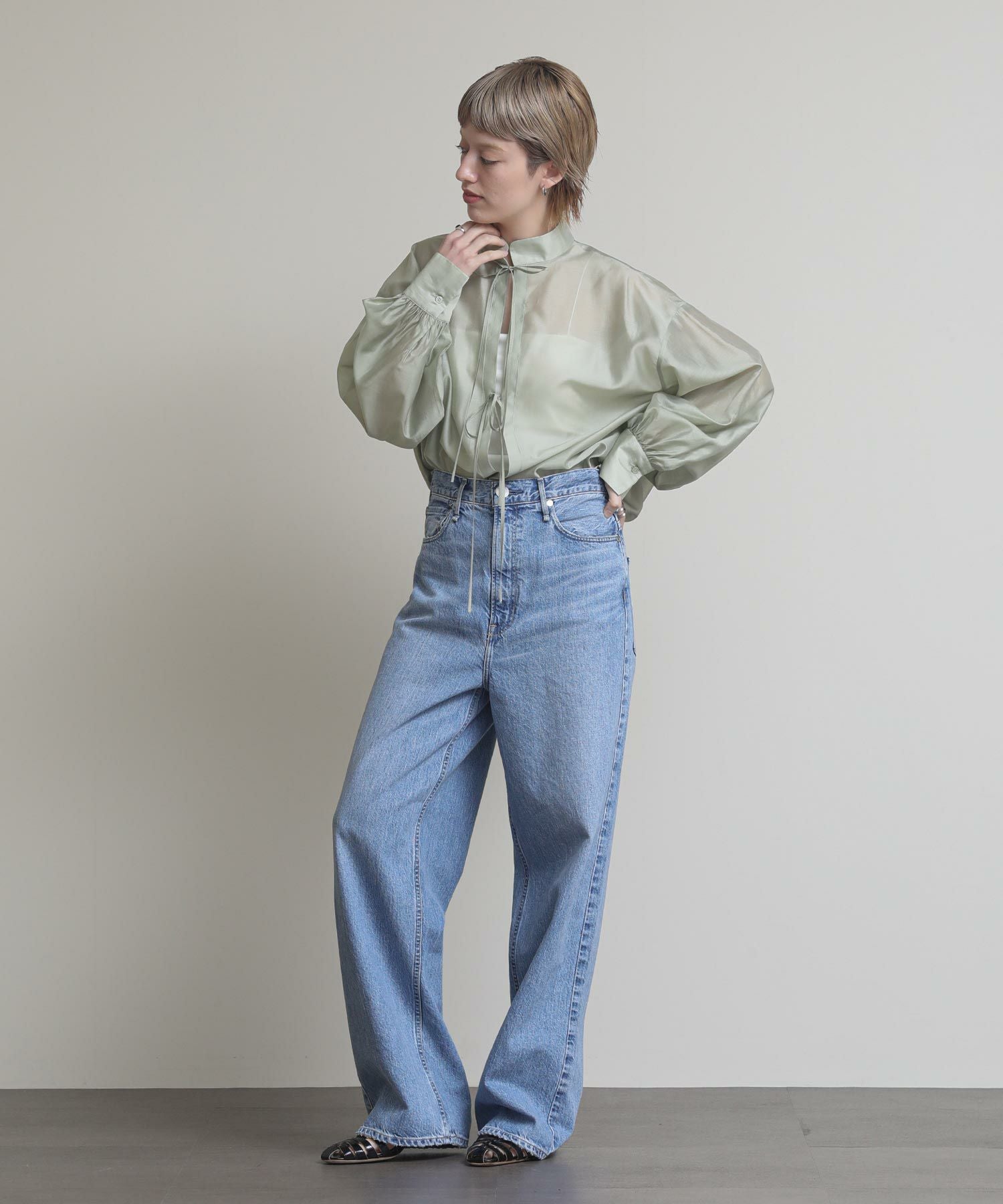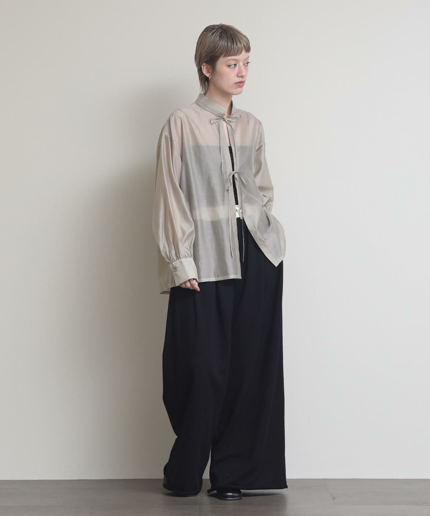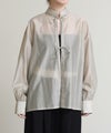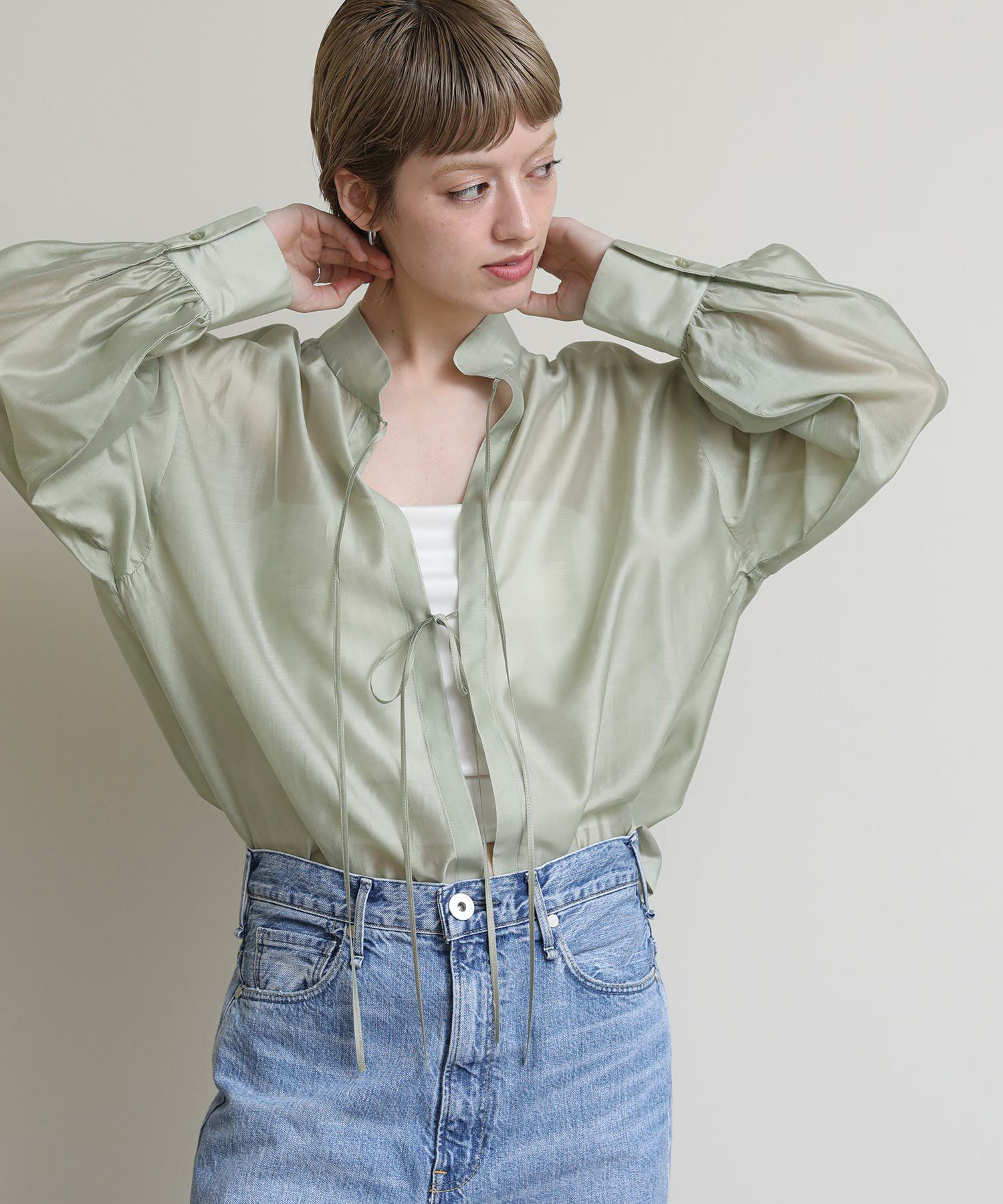 程よい透け感がこなれ感を演出してくれます。流行りのリボンをあしらったデザインですがスタンドカラーで甘すぎない印象です。緩やかな前後差があるデザインなのでおしり回りもカバーしてくれます。リボンをほどいて羽織としても◎春夏に選びたくなるライトグレー、ライトグリーンの2色展開です。