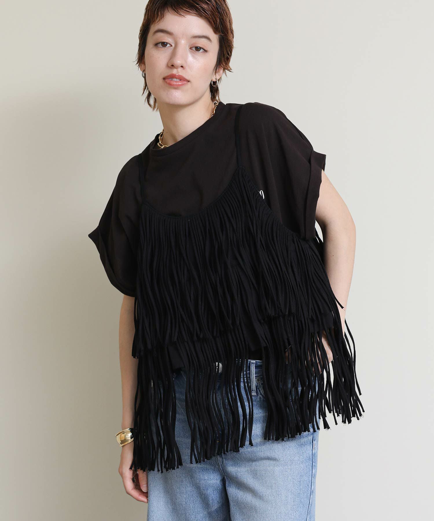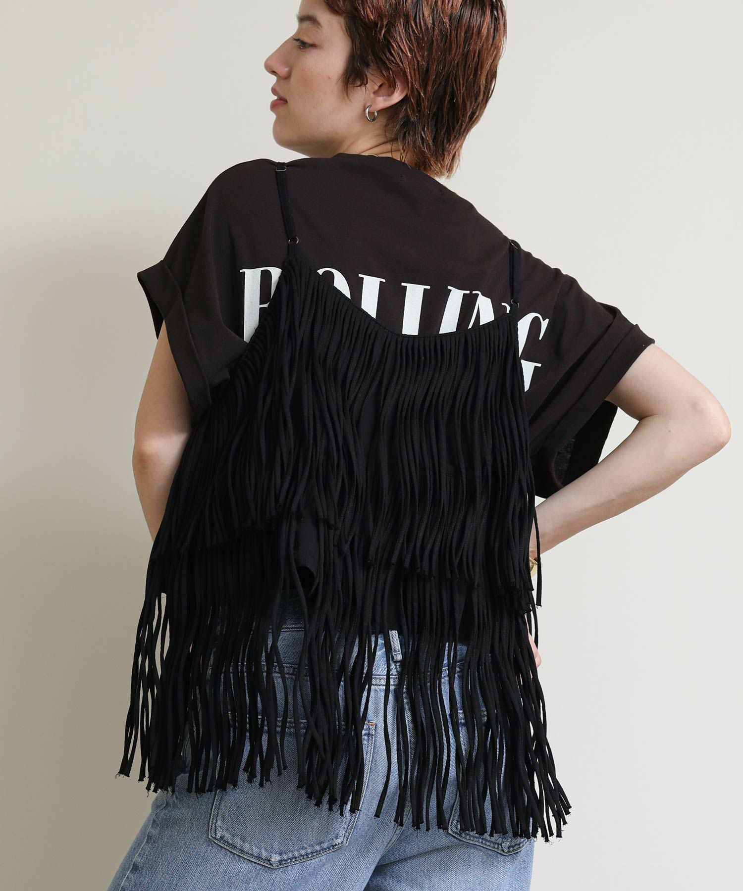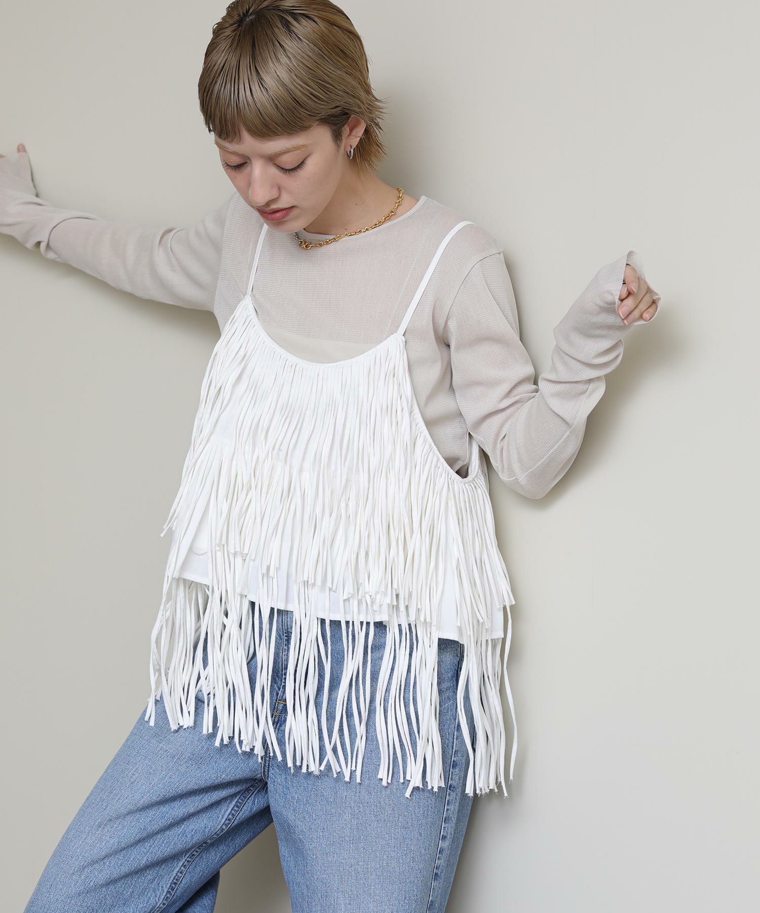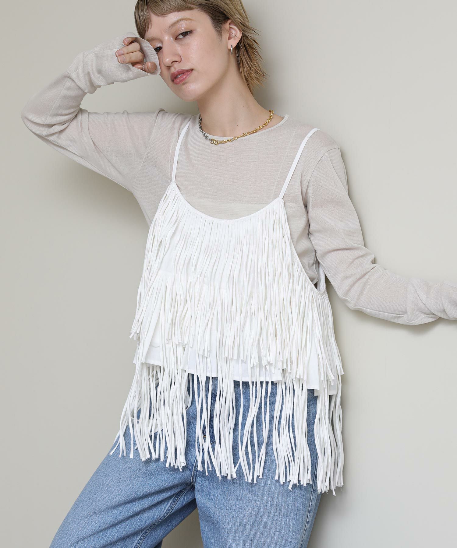 一枚でおしゃれになるフリンジキャミ。