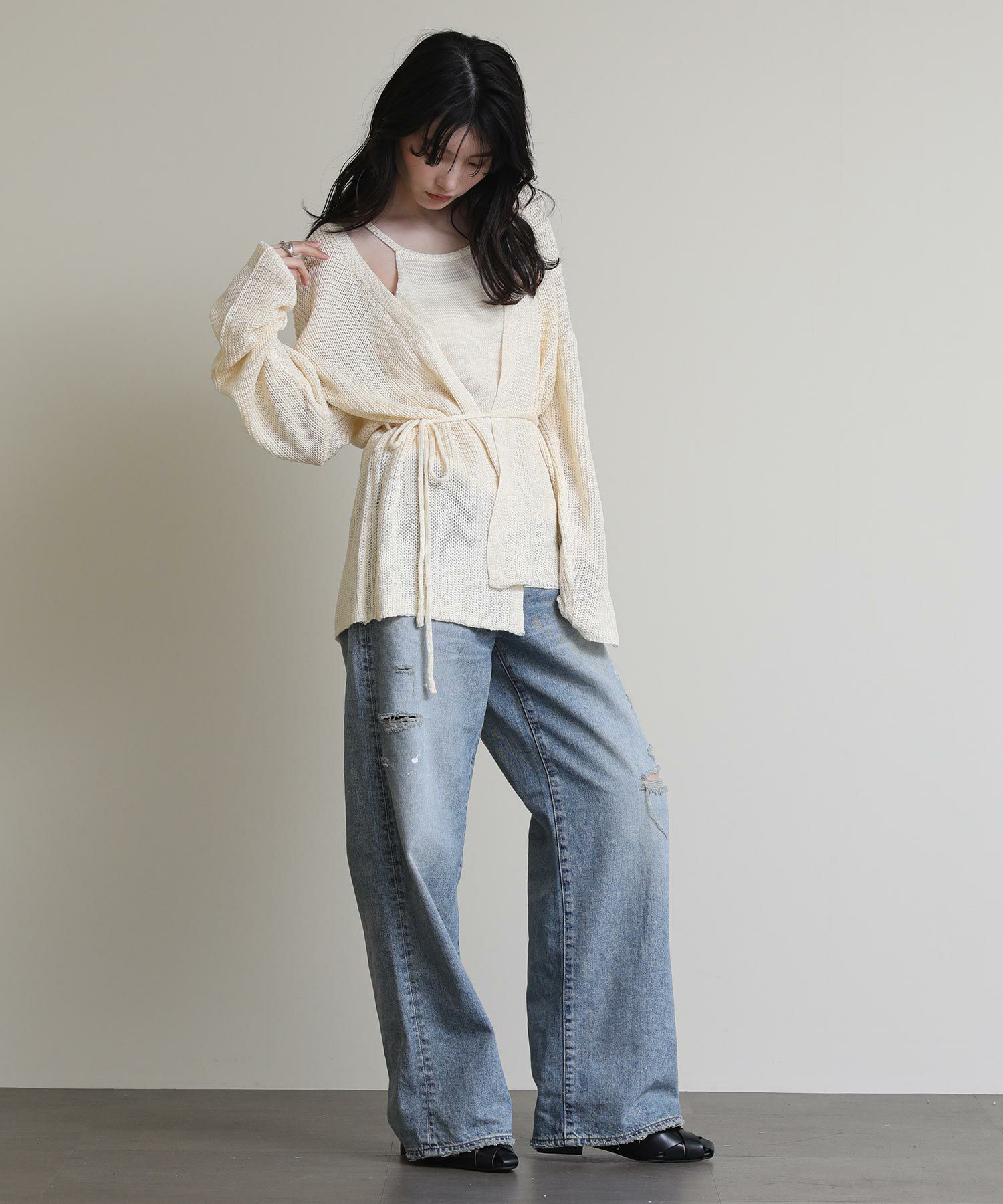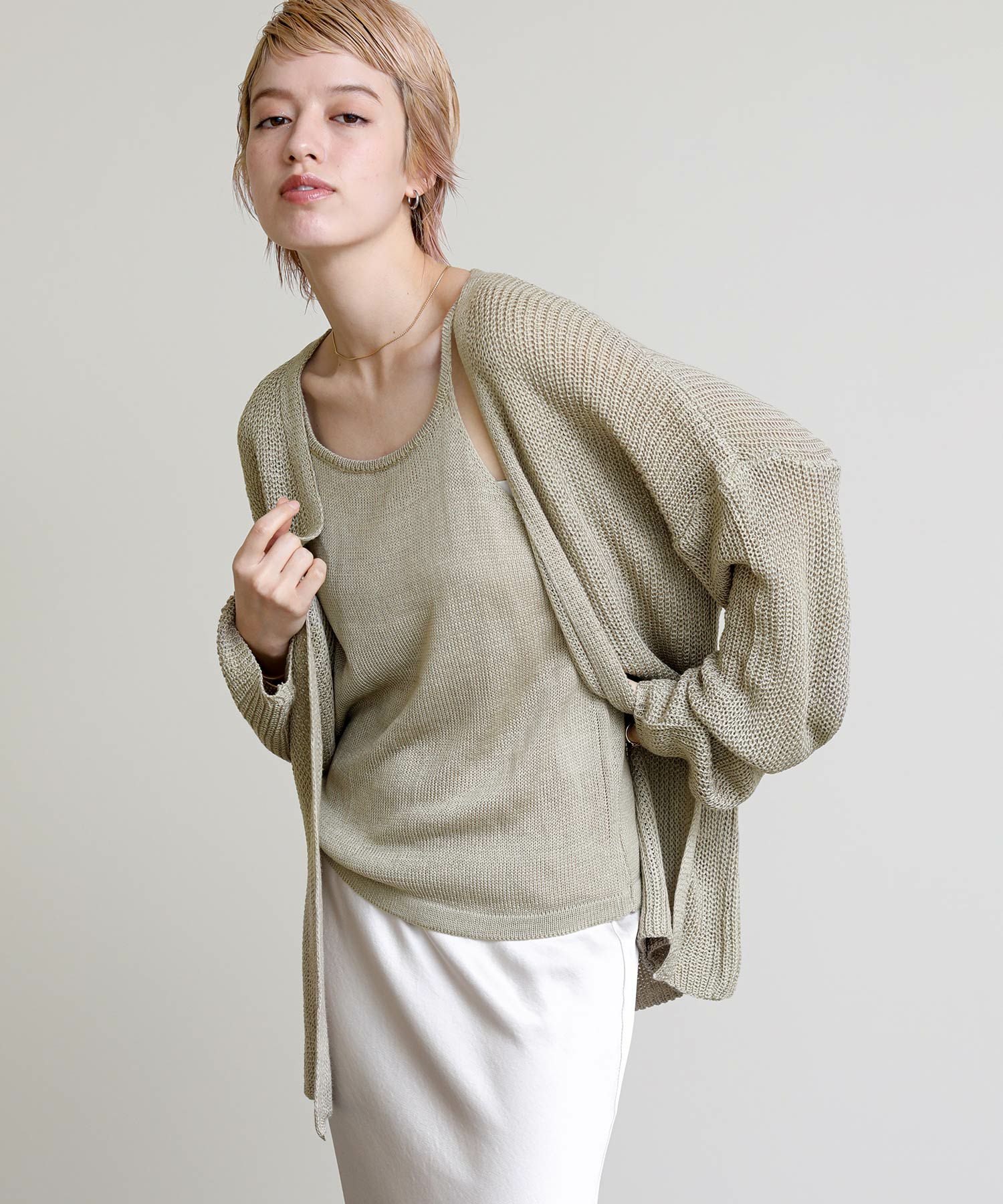 トレンドライクなホルターネックのキャミソールはシャツやカットソーとのレイヤードもオススメ。ミニマルなデザインのカーディガンは付属の紐でウエストマークすることでスタイルアップ効果も◎セットはもちろん単品でもマルチウェイに着回しのできるおすすめアイテムです。