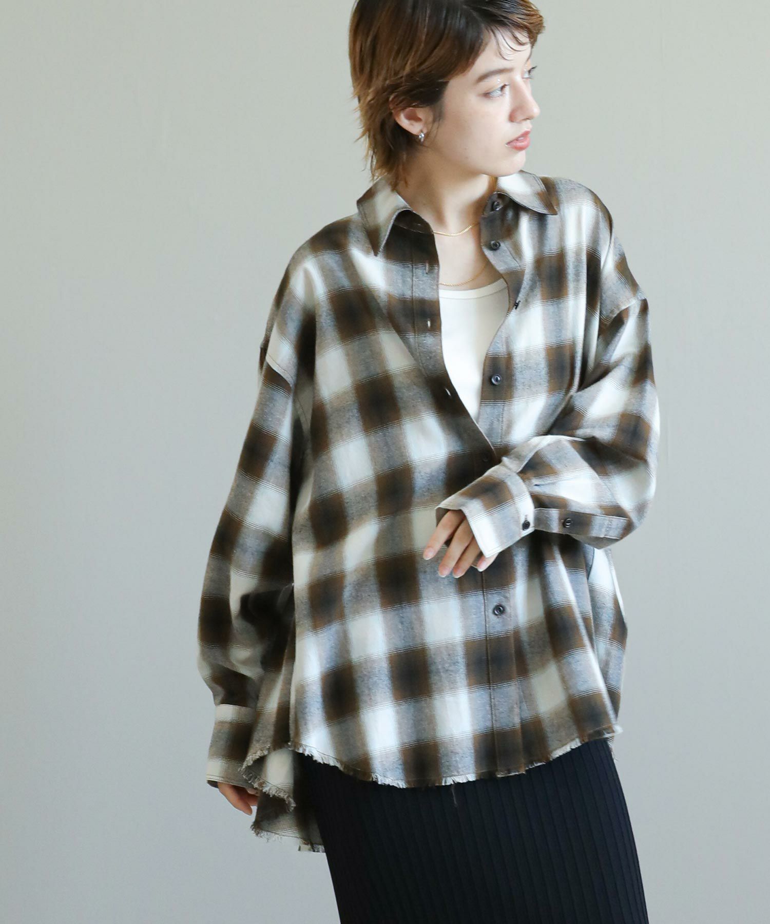 裾を裁ち切りにし、抜け感をプラス。釦をあけても閉めても綺麗に着られるよう、サイジングや衿の形にこだわりました。トレンドのブラウンと定番のブラックの2色展開です。男の子っぽくならないよう、スカートスタイルに