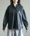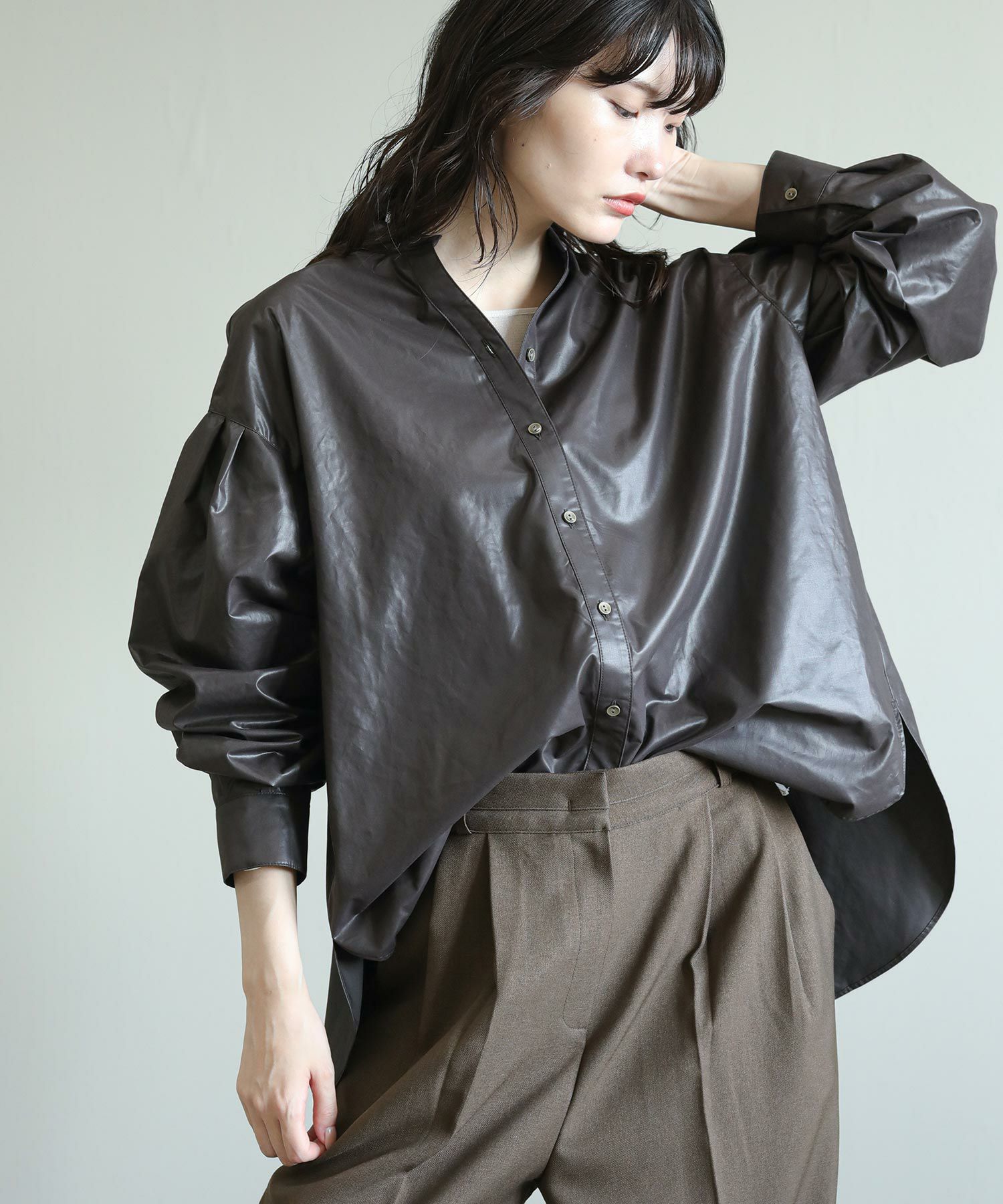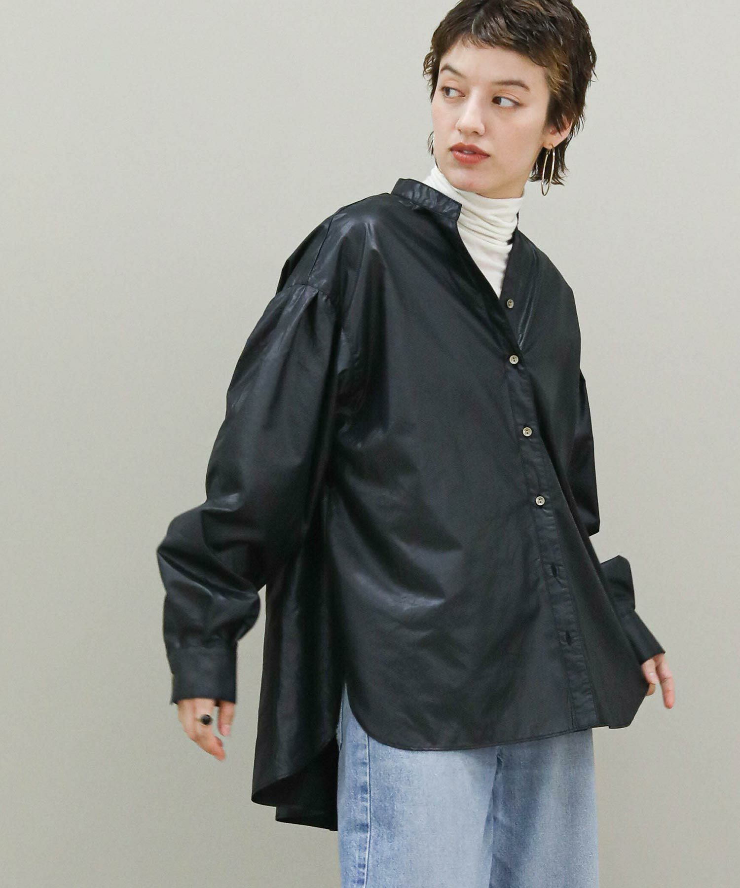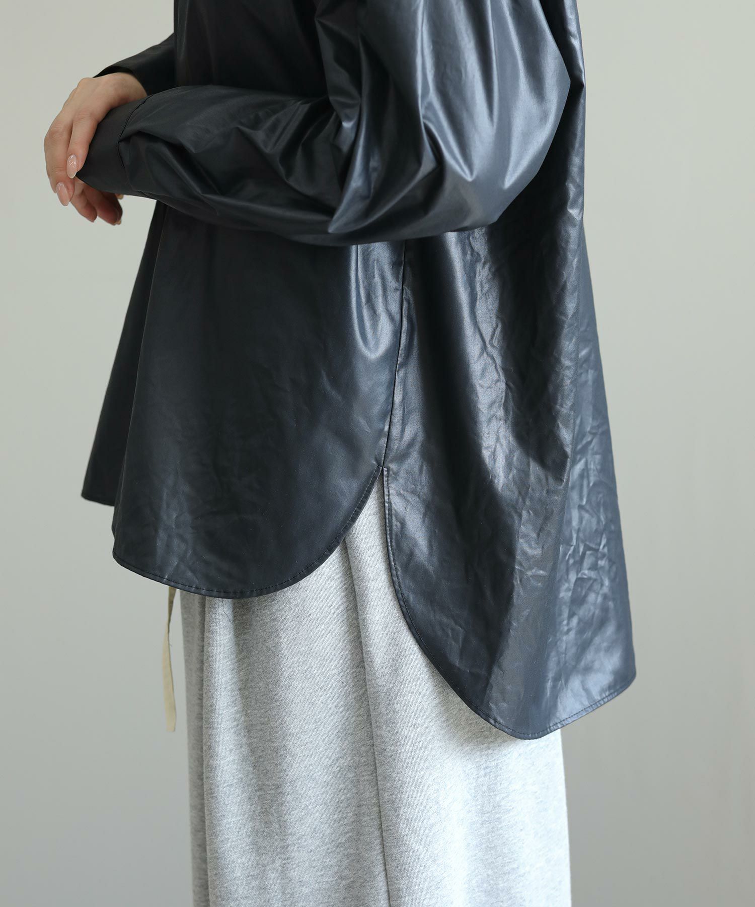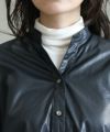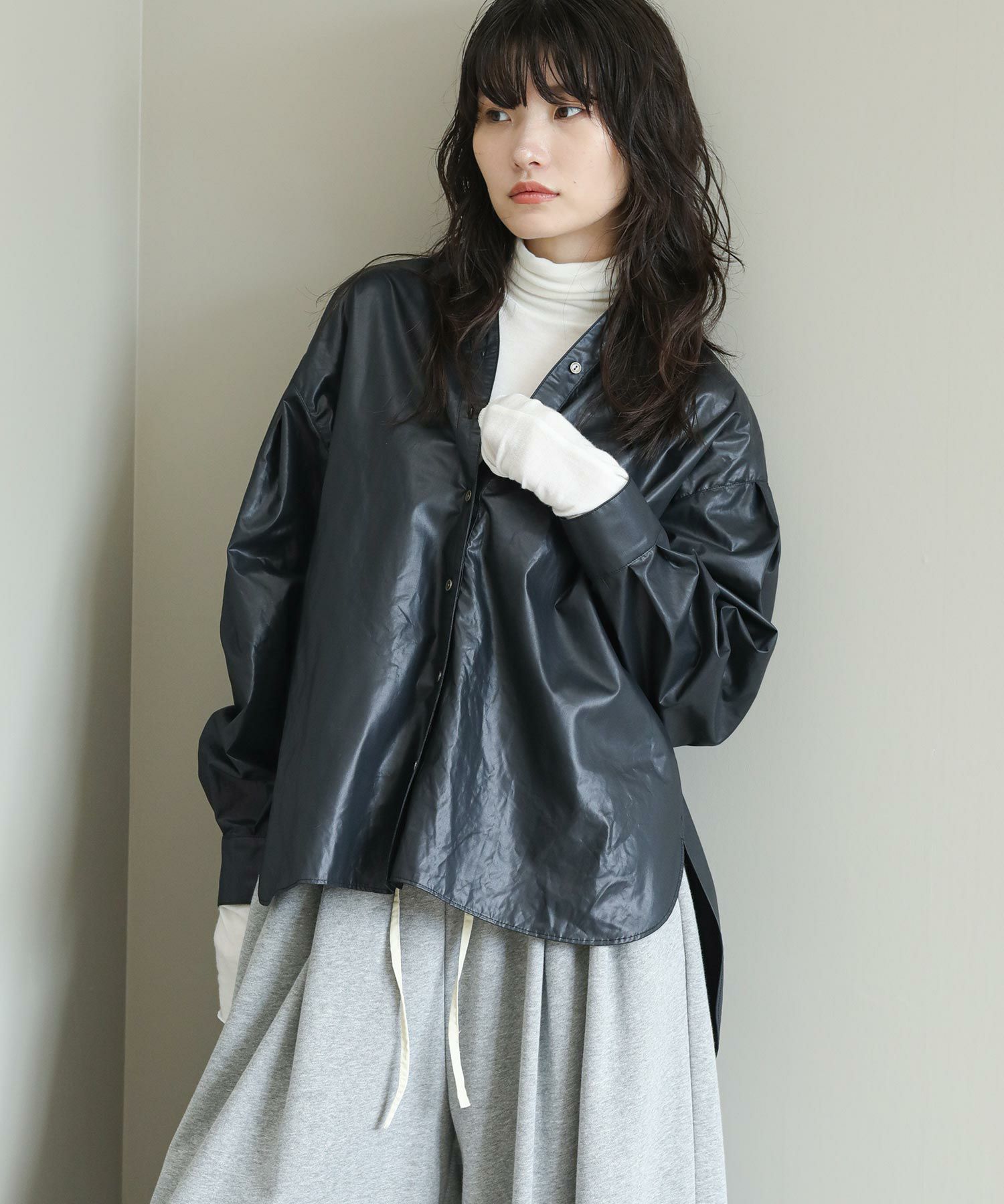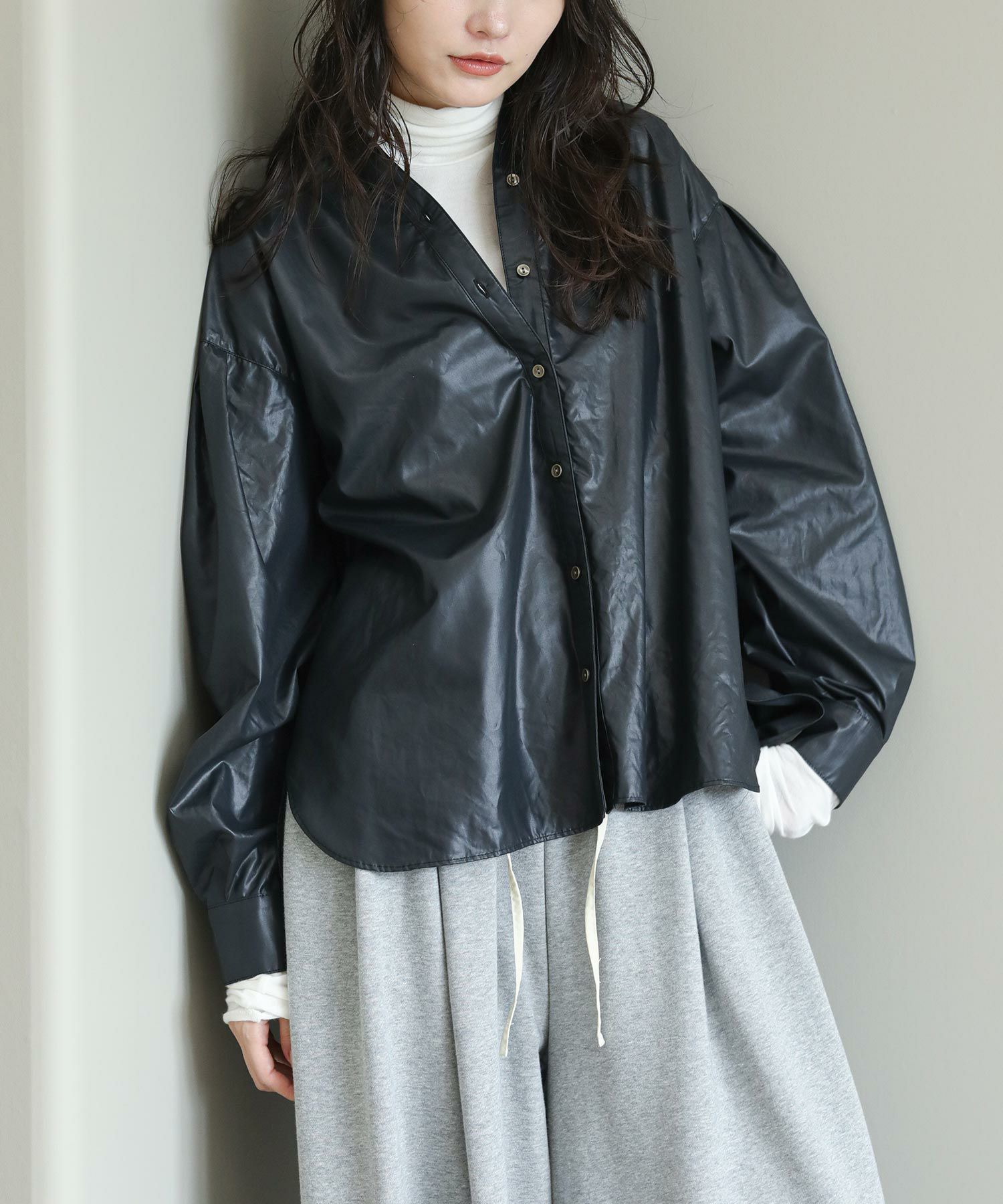 袖にボリュームをもたせることでハードになりがちなレザーアイテムを女性らしく仕上げました。スキッパーデザインを活かしてインナーにタートルやロンT仕込むのもおすすめ。腰回りをカバーしてくれる着丈なのでタイトスカートと好相性。スラックスやワイドパンツとはタックインしてきるとバランスも取りやすいです。
