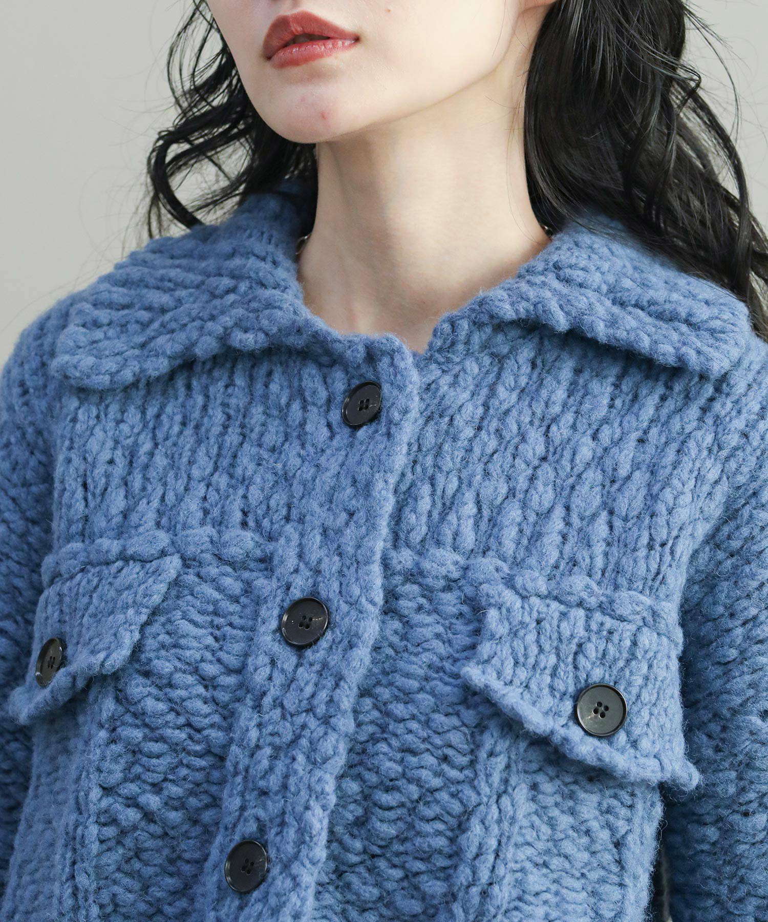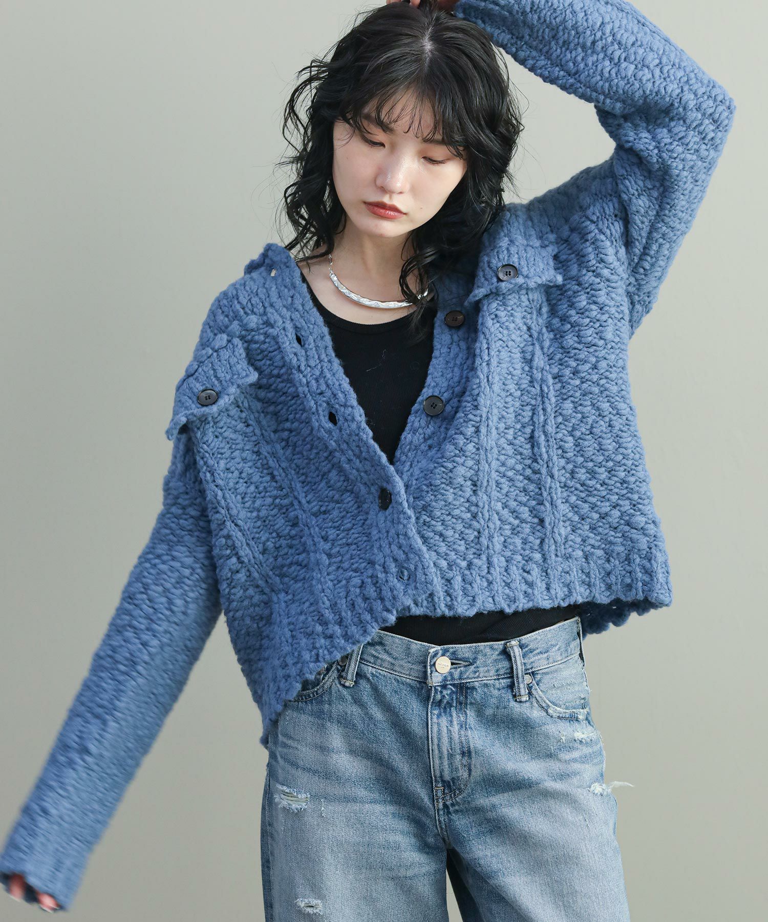 太番手で表情のあるウール混のスラブ糸を使用。スラブ糸の凹凸感と編地の切替がポイントです。程よいサイジングでボトムとバランスが取りやすく、さらっと羽織るだけでサマになります。裾だけ釦を閉じて、衿を抜いてきるとトレンド感もアップ◎