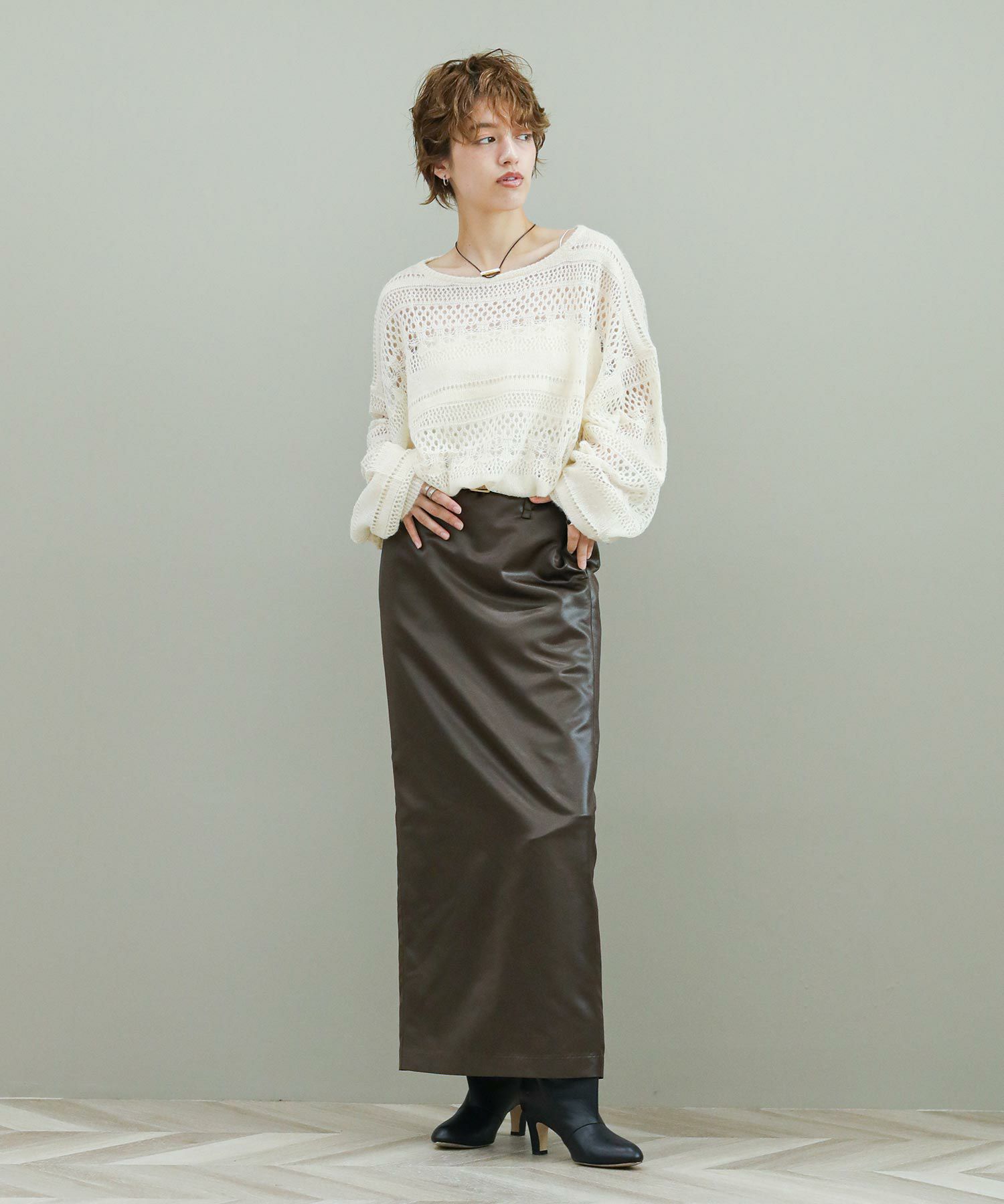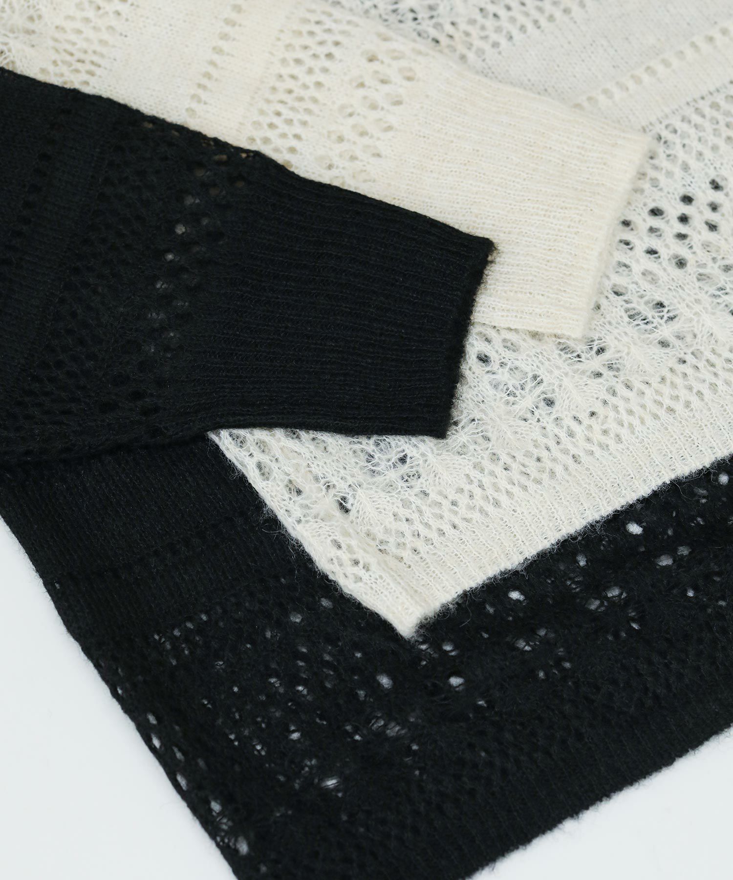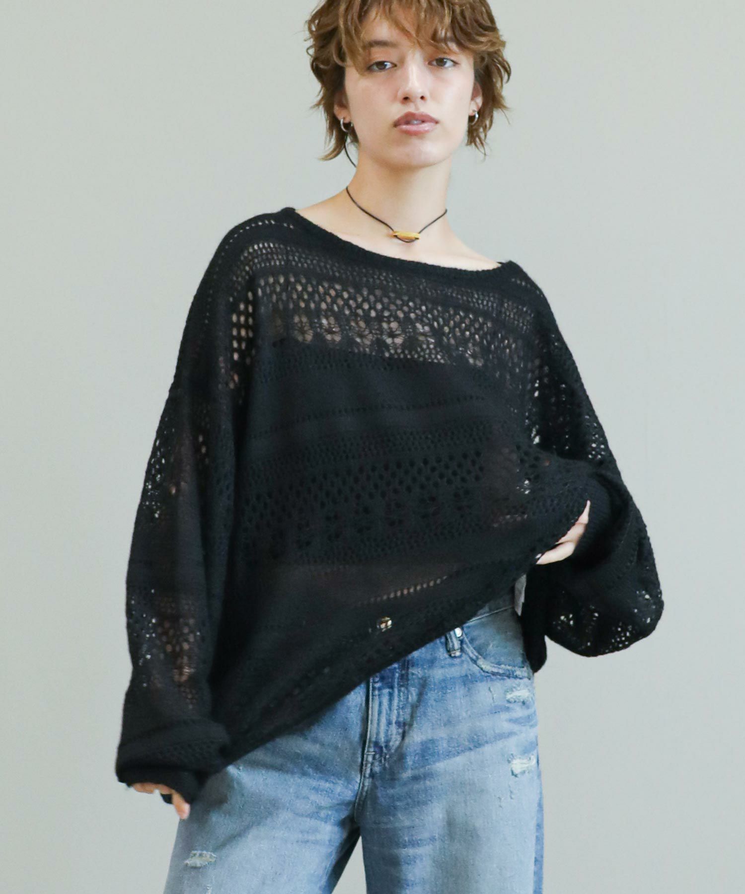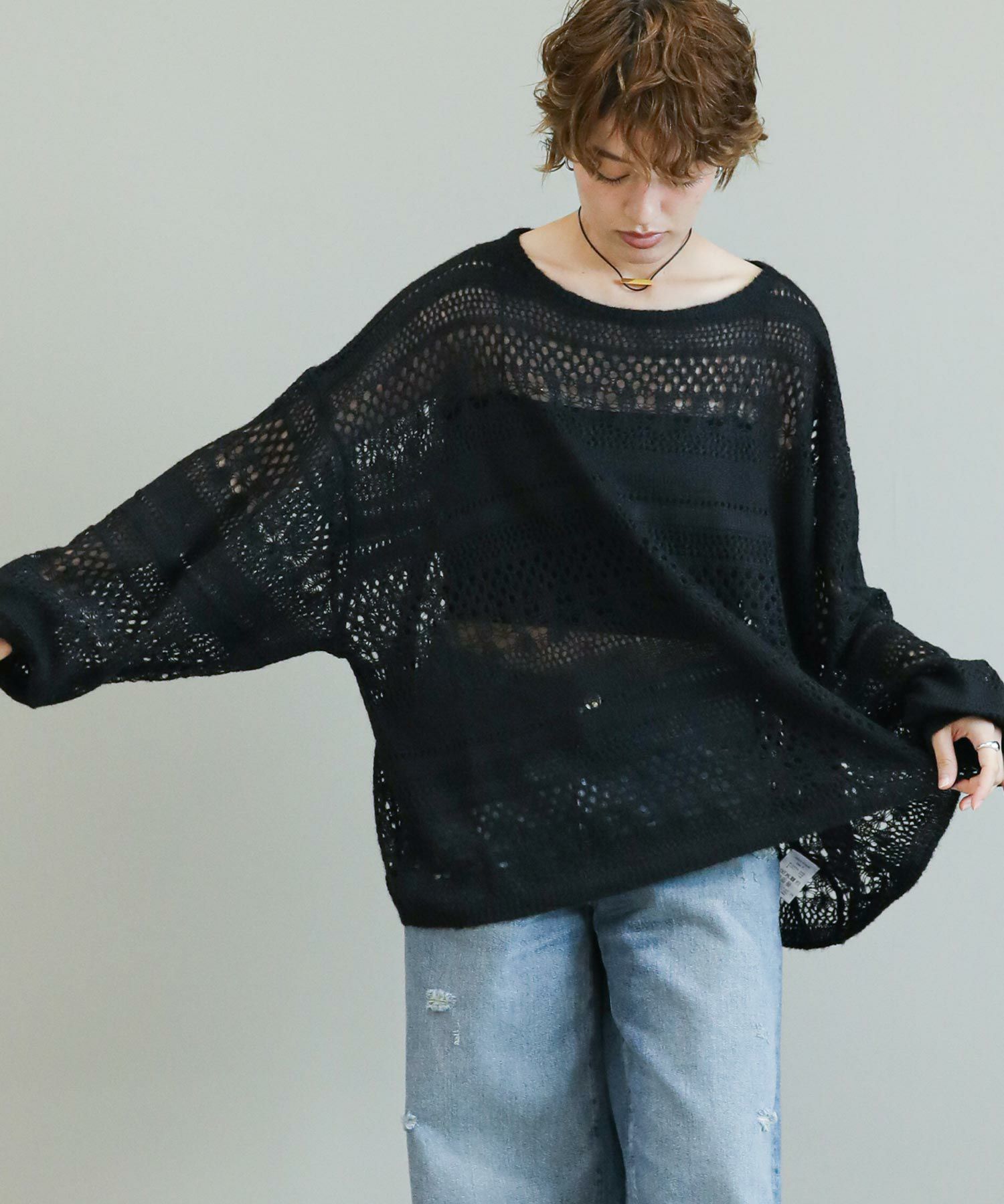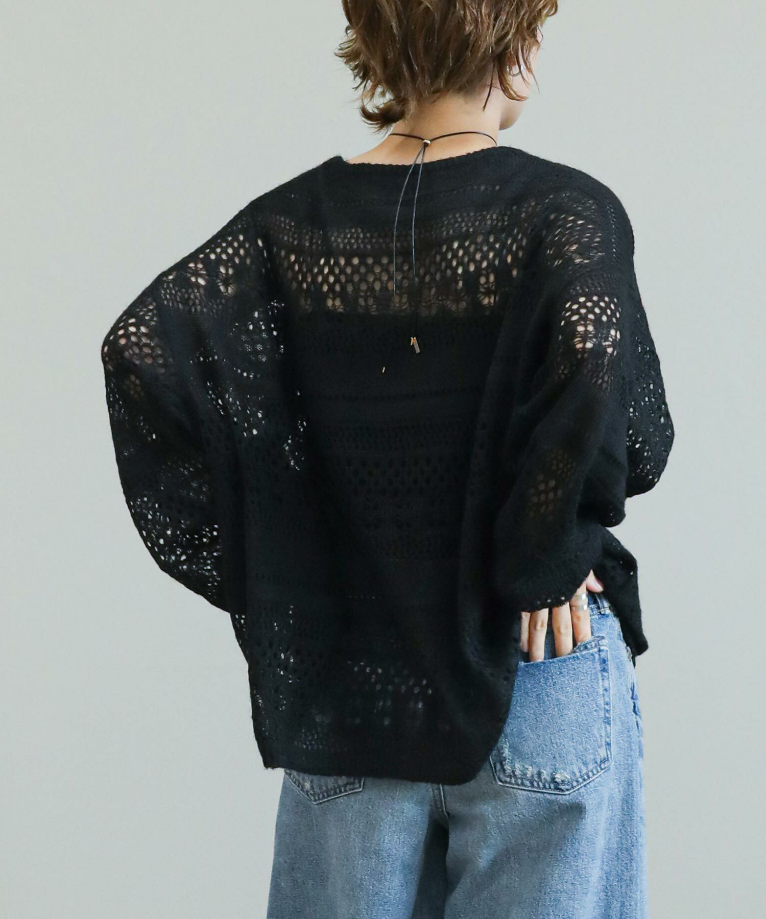 Tシャツやシャツとレイヤードスタイルを楽しめます。繊細なすかし柄が女性らしい雰囲気でデニムスウェットなどカジュアルボトムとも好相性。デコルテをきれいに見せてくれる衿の開きもポイントです。
