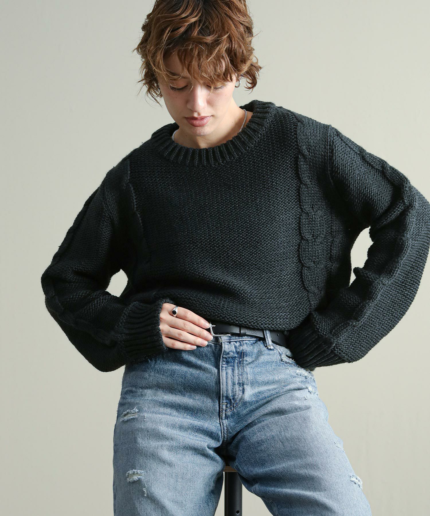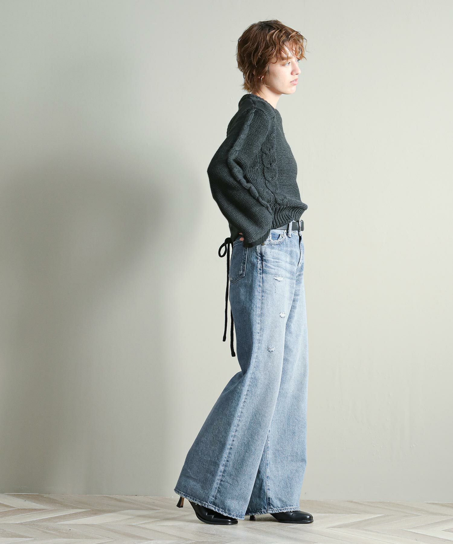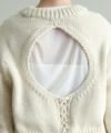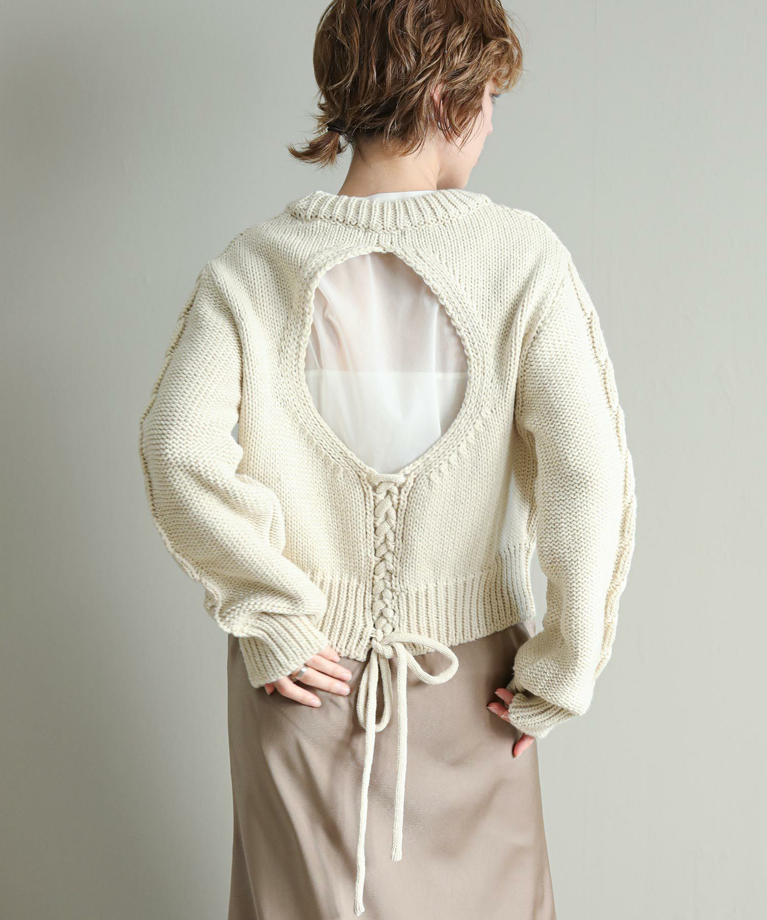 背中の開きとレースアップのリボンがポイントに。シンプルなボトムと合わせてもサマになります。袖のケーブルのさりげないアクセントに。タートネックやシャツはもちろん、シアーのインナーをレイヤードするのもおしゃれ感アップ◎