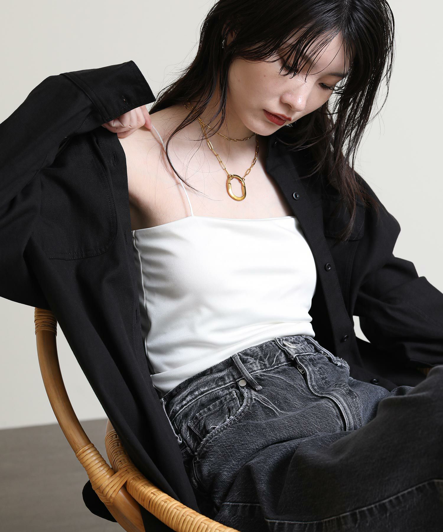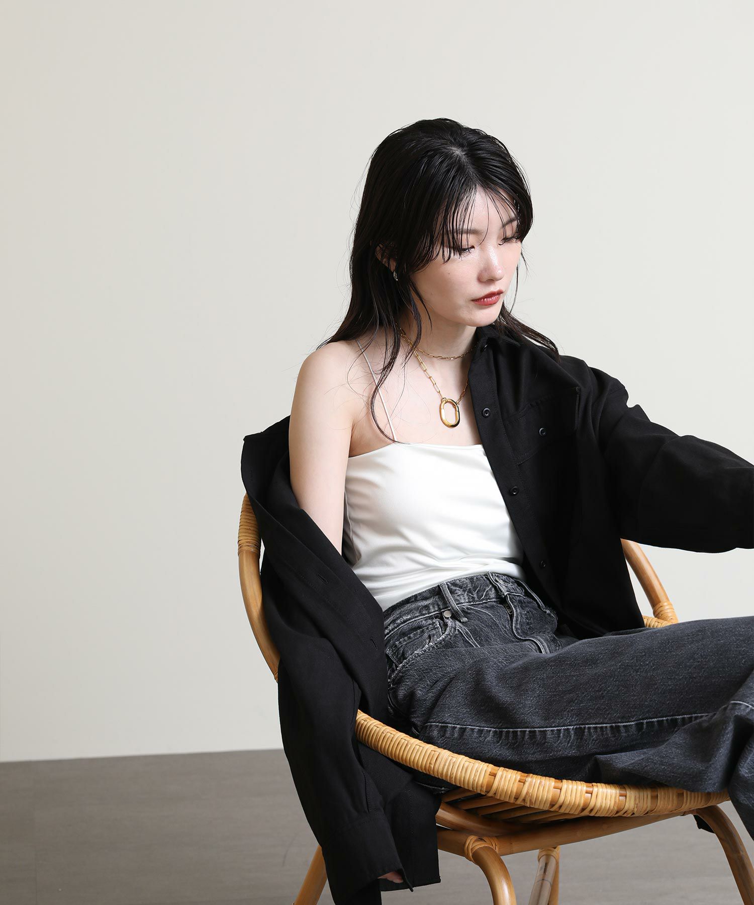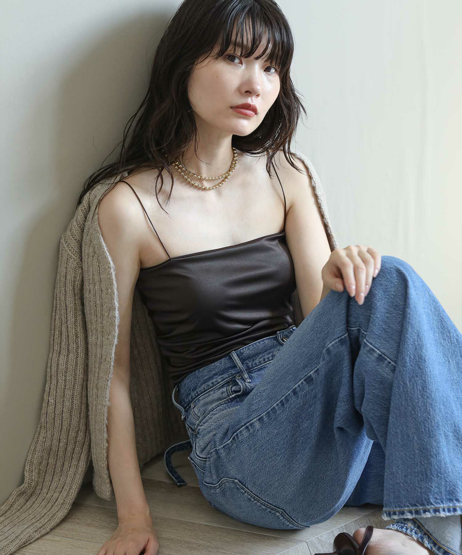 着丈を長くし安心感のあるサイジングになりました。カップはホールド感がありつつも主張しないものを選び、ヘルシーな見え方にこだわっています。サテンの上品な風合いが、深い開きのブラウスやカットソーのインナーにちらっと見えるとアクセントに。シャツをさっと羽織るのだけでも、こなれ感のあるコーディネートが完成します。