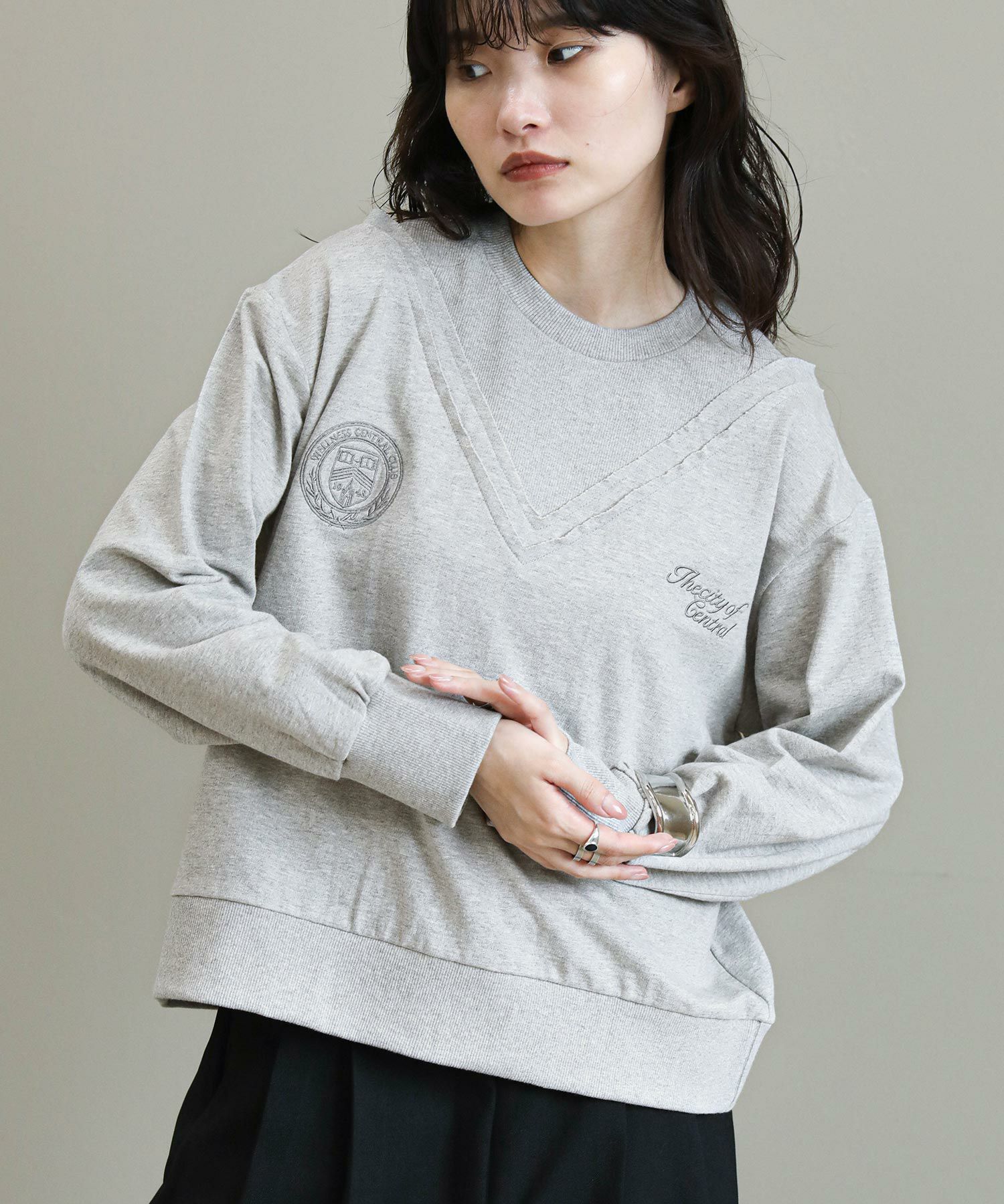 肩部分のさりげない肌見せがポイント。刺繍のエンブレムとロゴがカジュアルすぎず大人ぽい雰囲気に。ベーシックなボトムと合わせてもスタイルが決まるデザイントップスです。