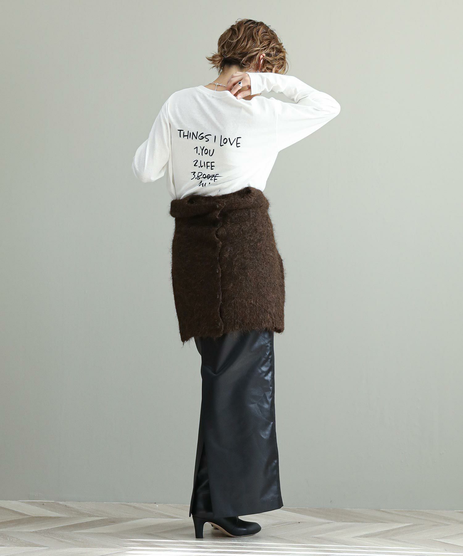 ヴィンテージライクな柔らかい生地を使用しています。裾をラウンドにしているのでニットやスウェットとレイヤードして裾から覗かせても◎今シーズンのロゴテーマは80’Sニューヨーク。フロントのロゴの「あなたの好きなもの教えて」の問いに架空のニューヨーカーの女の子がバックプリントで答えています。