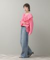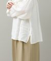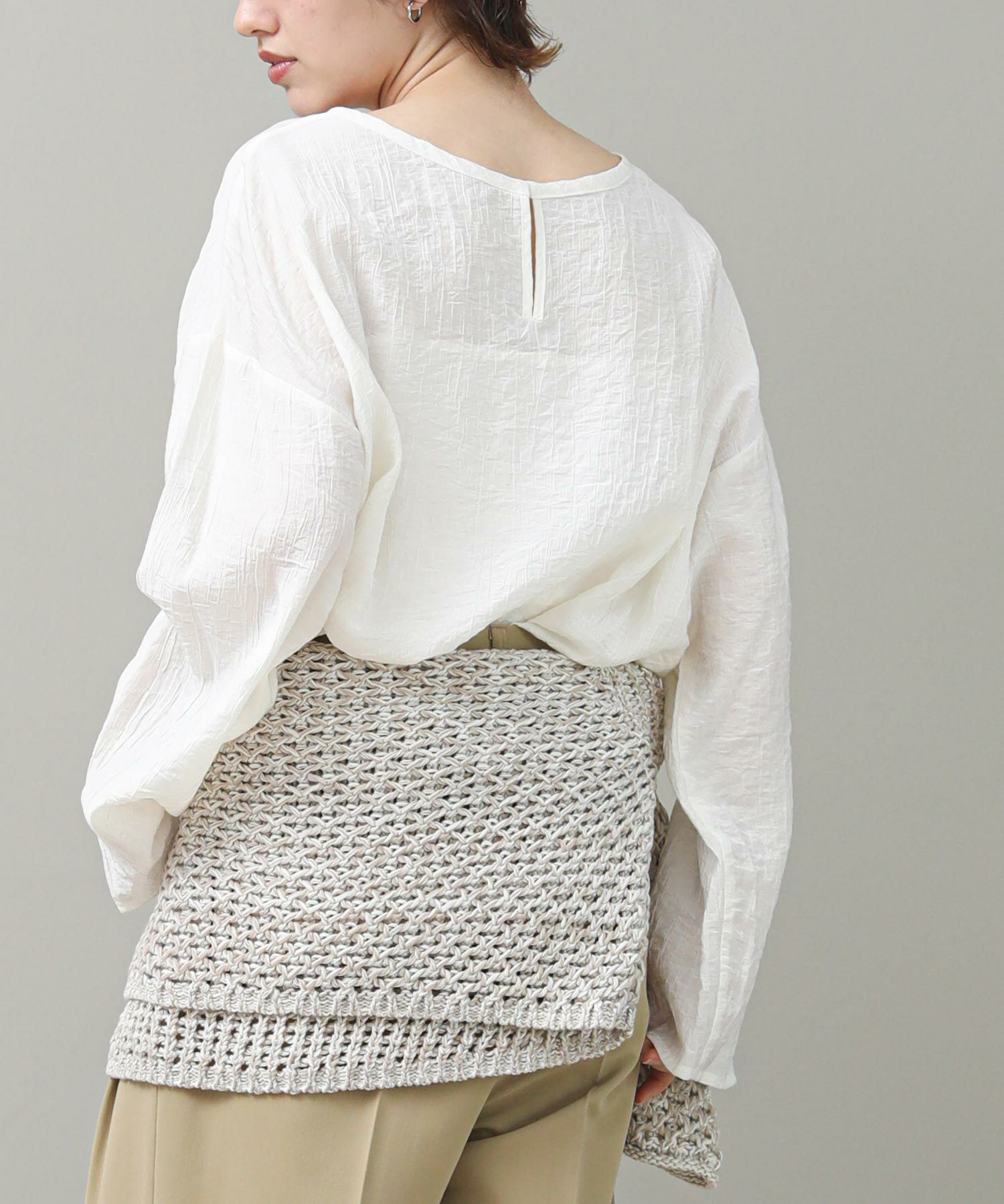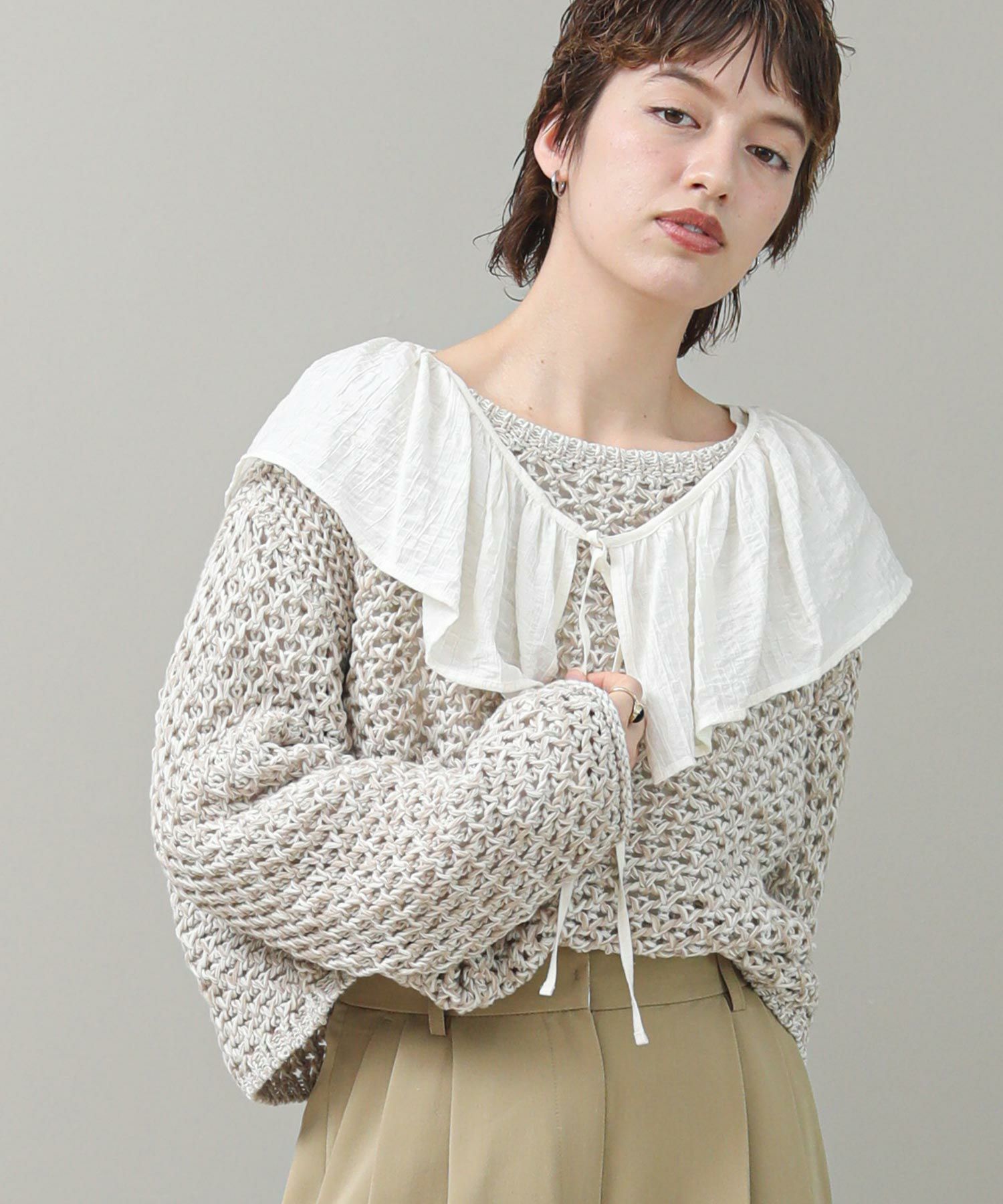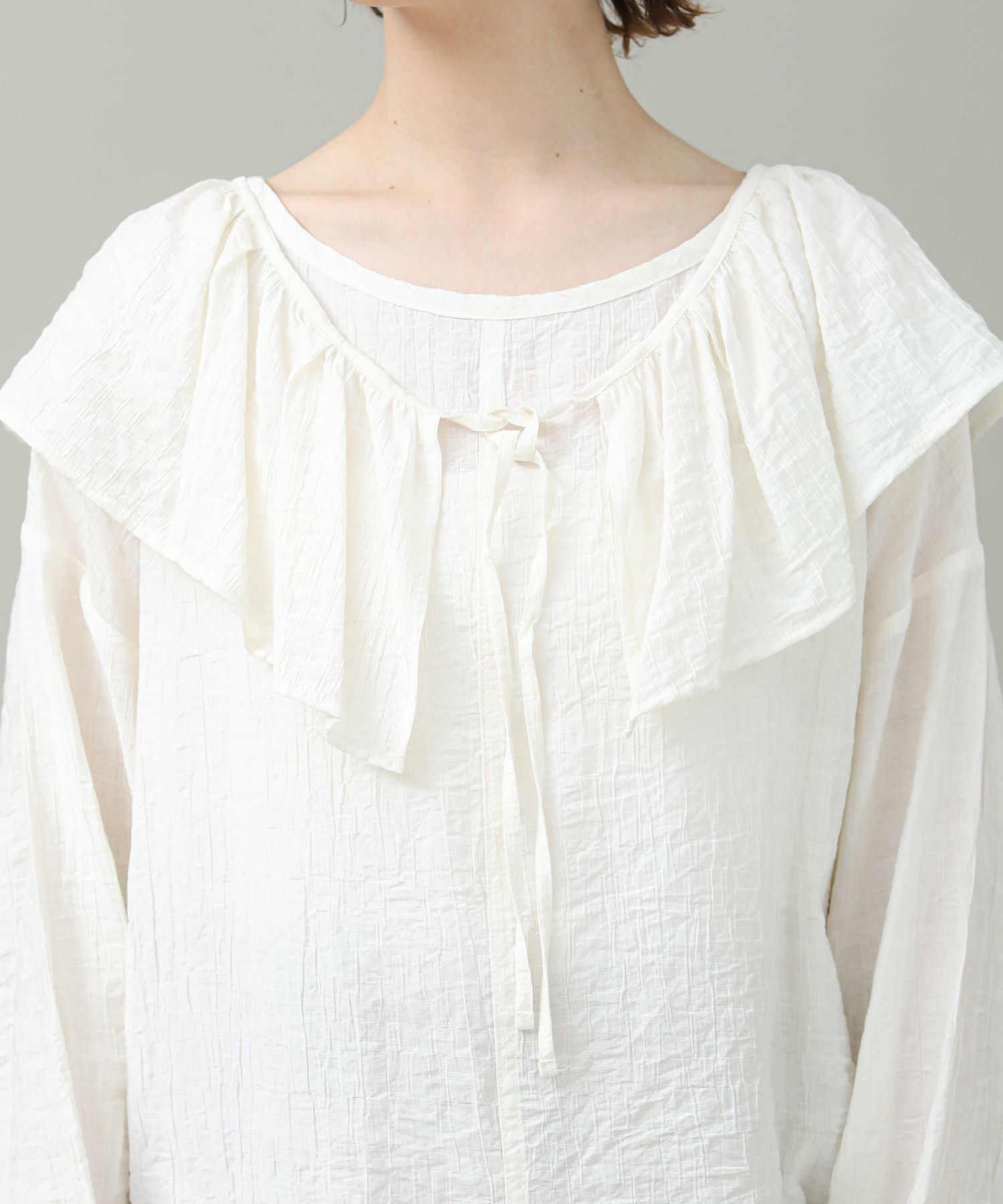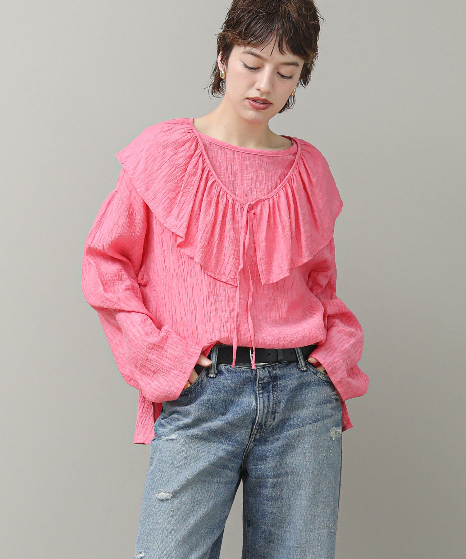 大きなフリル衿は着脱が可能でマルチWAYで使用できます。肩に垂らしてラッフルカラー風にしたり、腰の位置で巻けばペプラムデザインのブラウスにも。ブラウスだけで着るとTシャツ感覚で着られてジャケットやカーディガンのインナーにも重宝します。目を惹くビビットなピンクが春の気分を高めてくれる1枚です。
