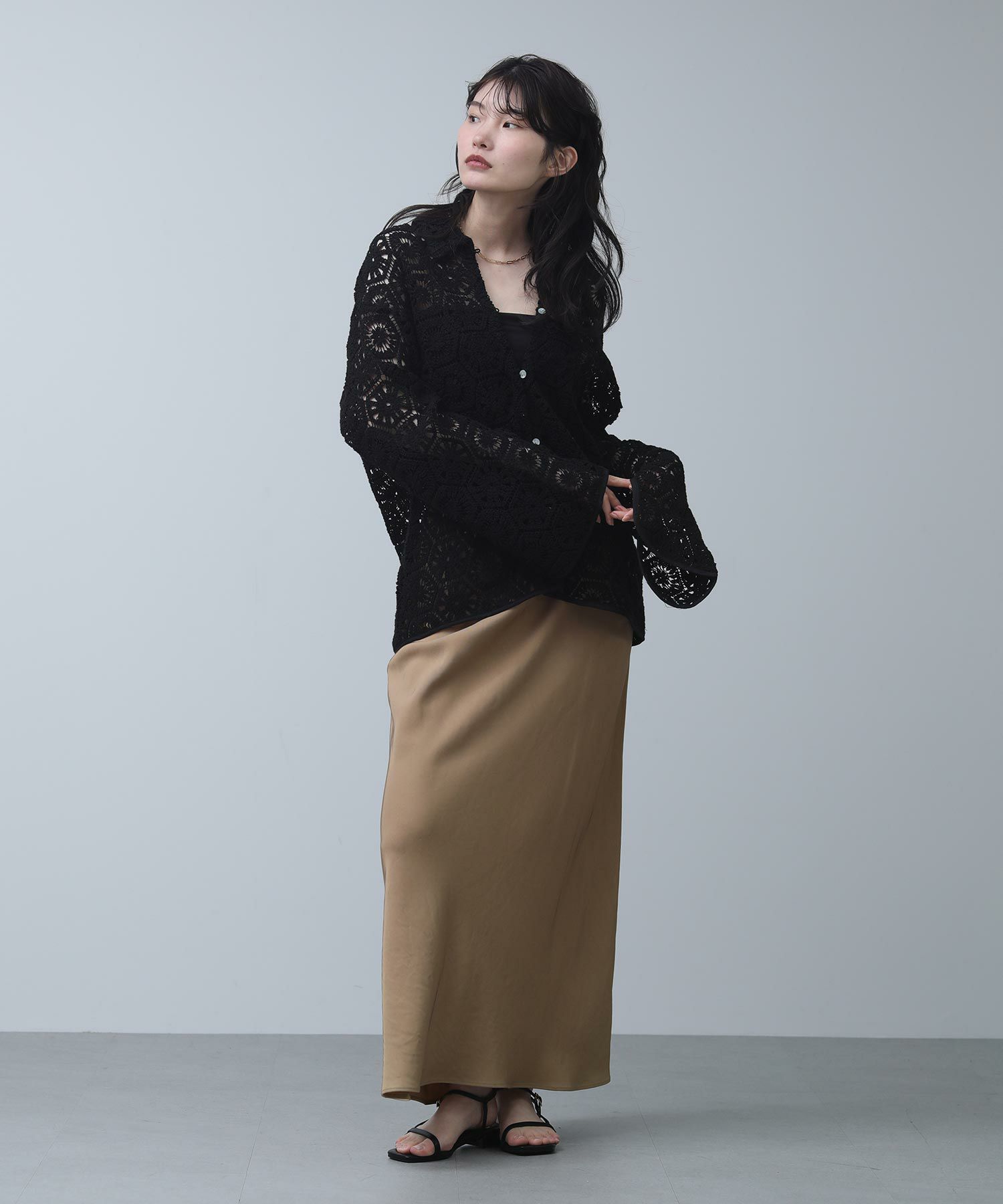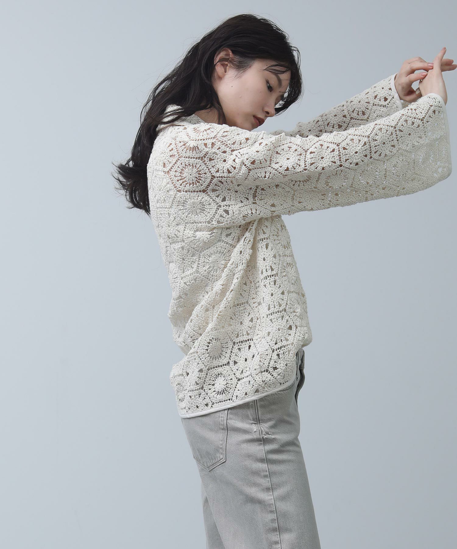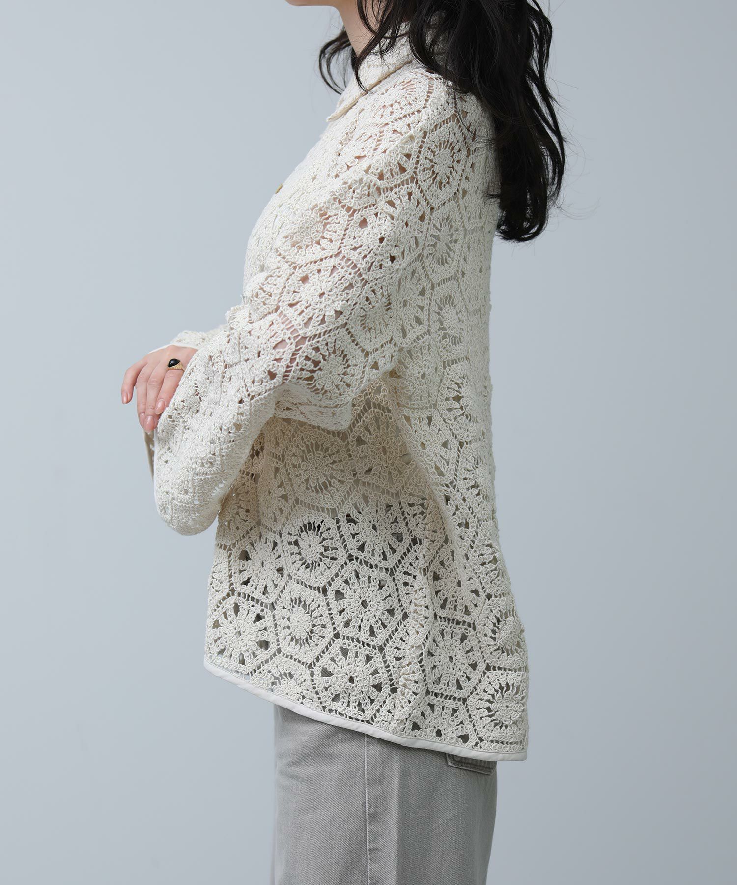 繊細なレースで旬な着こなしが叶います。程よくゆとりのあるサイジングなので、ラフに羽織ってもバランス良く着ていただけます。まだ肌寒い時期やロンTなどの上に羽織としてもおすすめ。季節が進めば、キャミやタンクをインナ―に大人の肌見せスタイルをお楽しみいただけます。