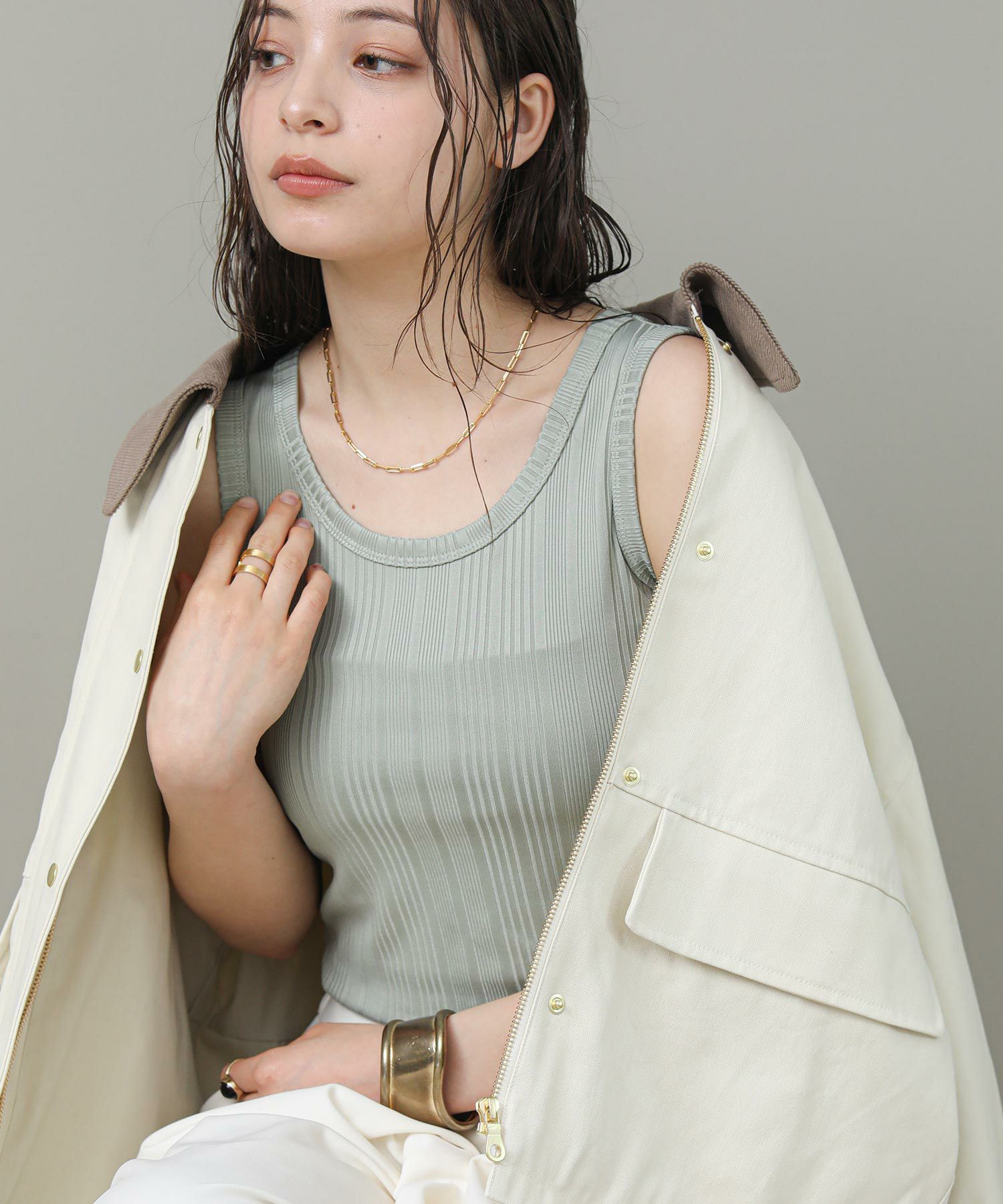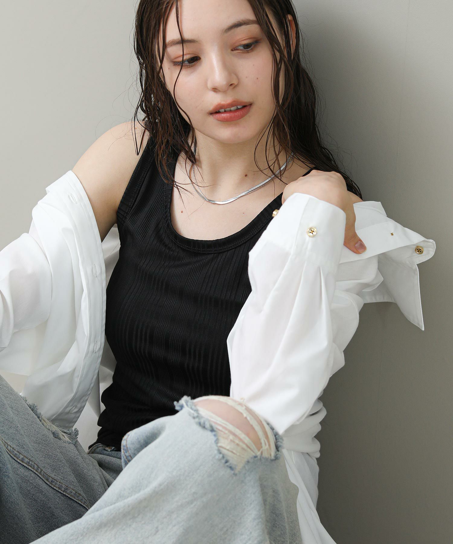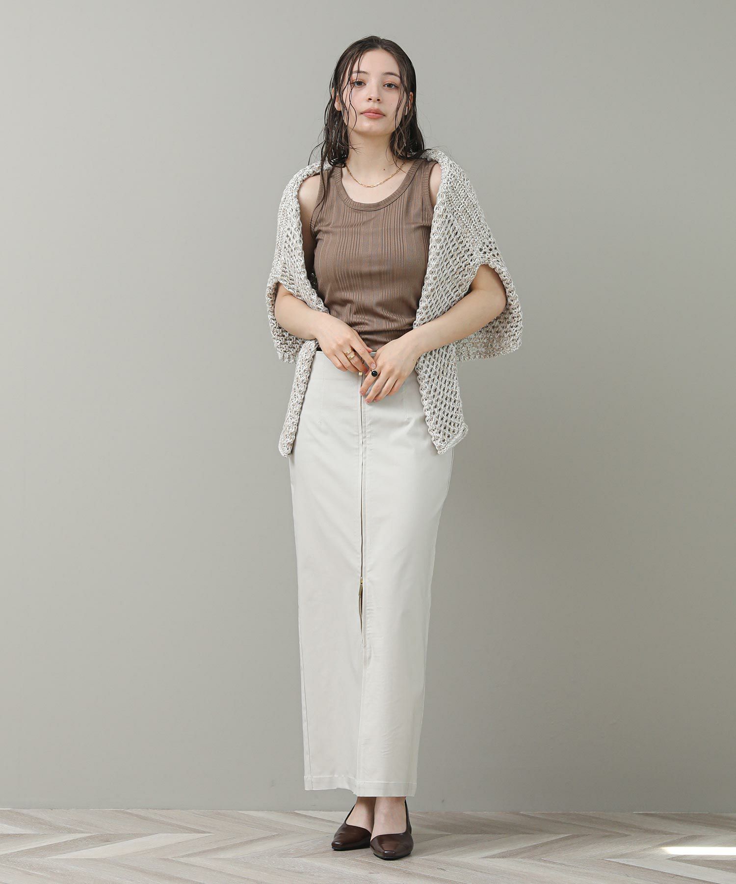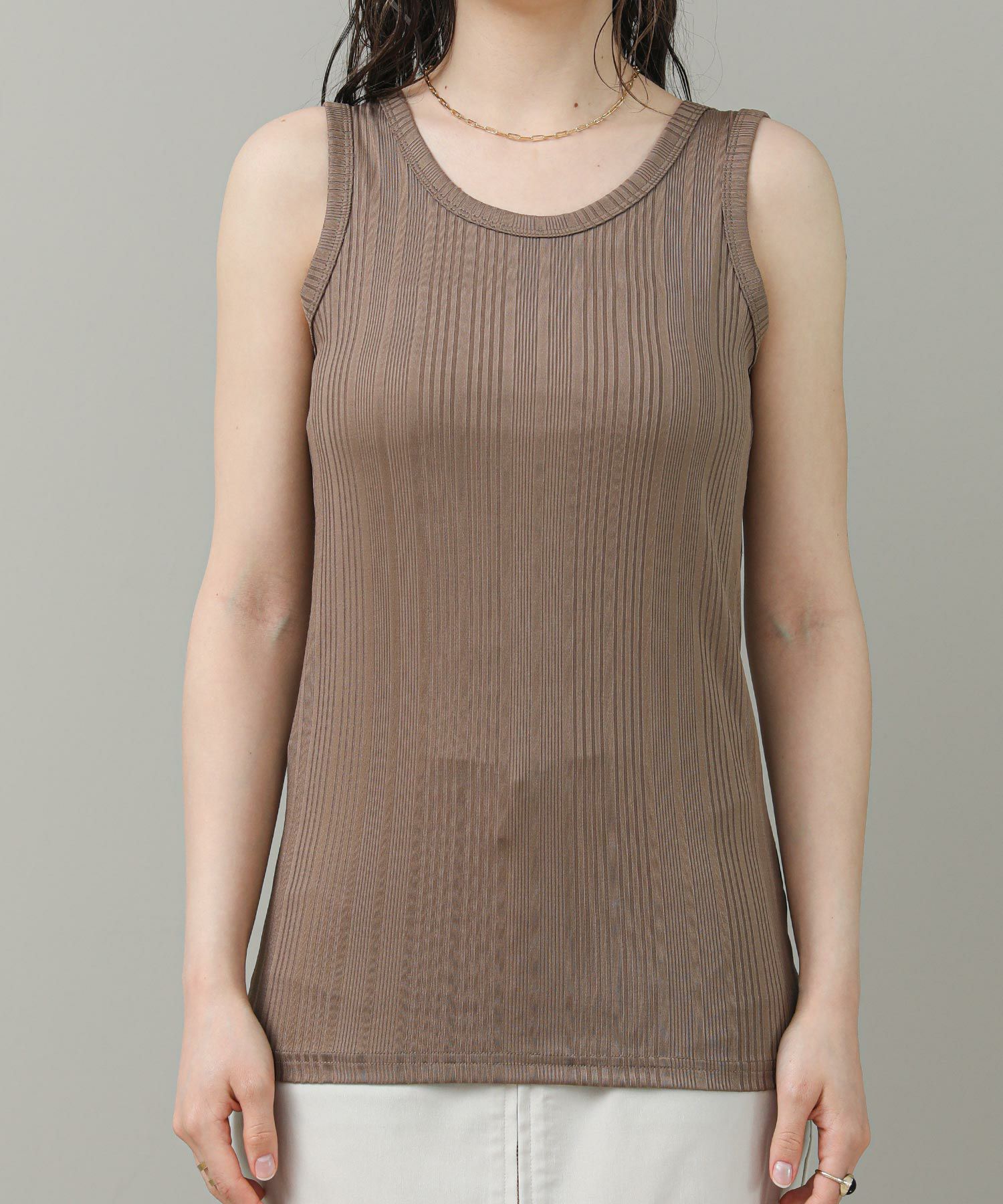 程よく光沢のある素材感とランダムなテレコでツヤがあり、大人な雰囲気です。これからのシーズンシャツやジャケットのインナーに重宝します。さりげなく、アメスリになっているので、1枚でヘルシーな肌見せも◎