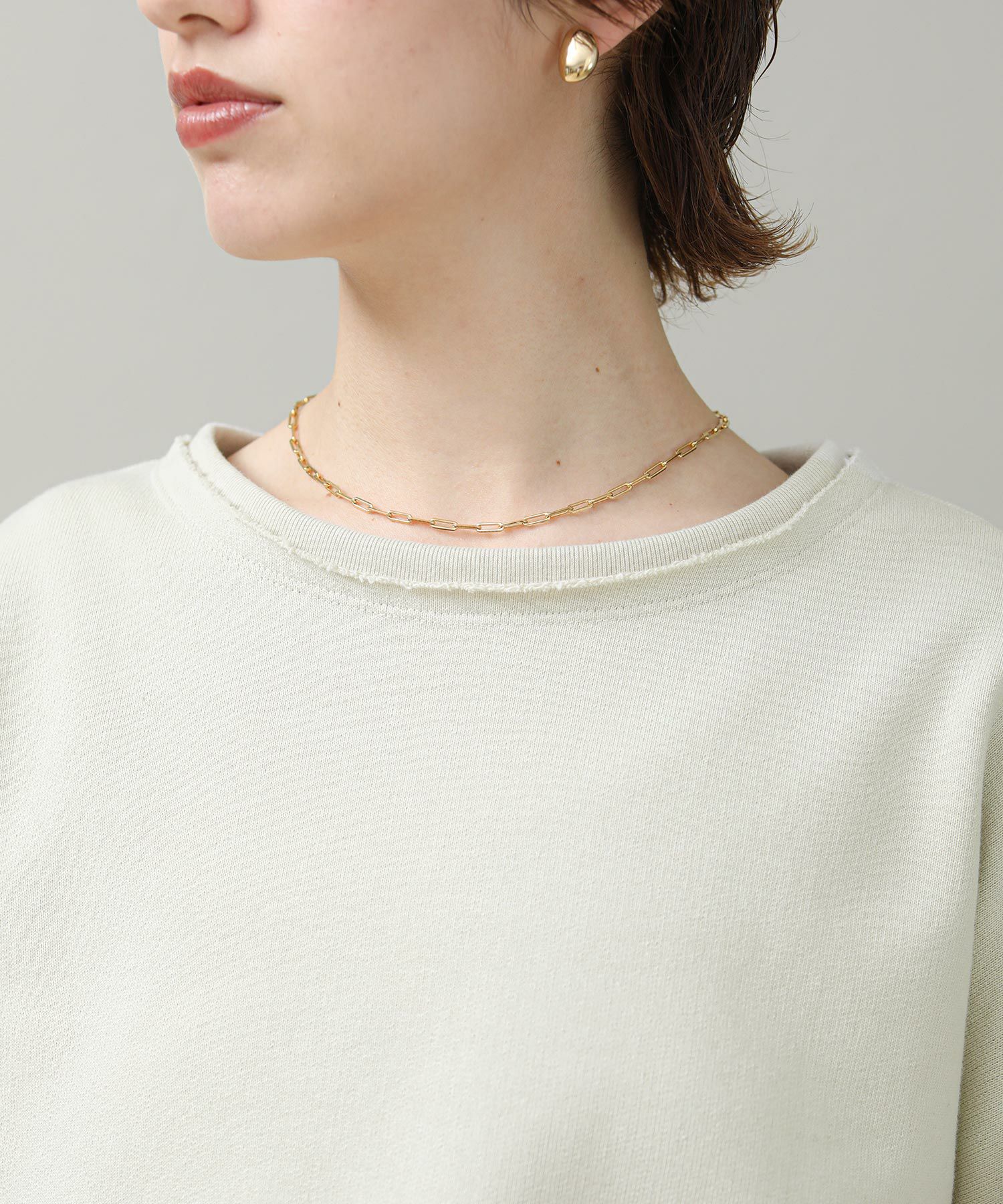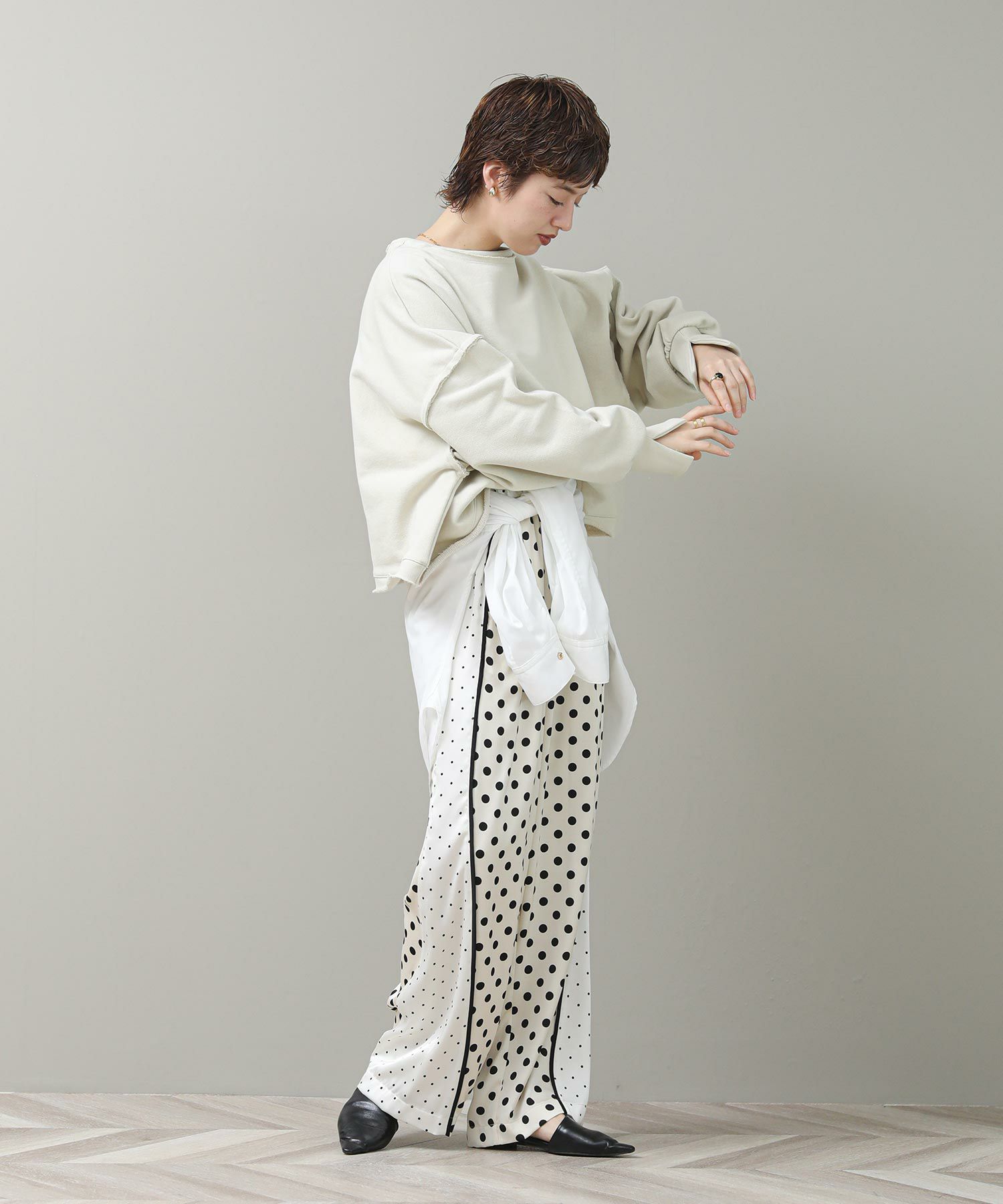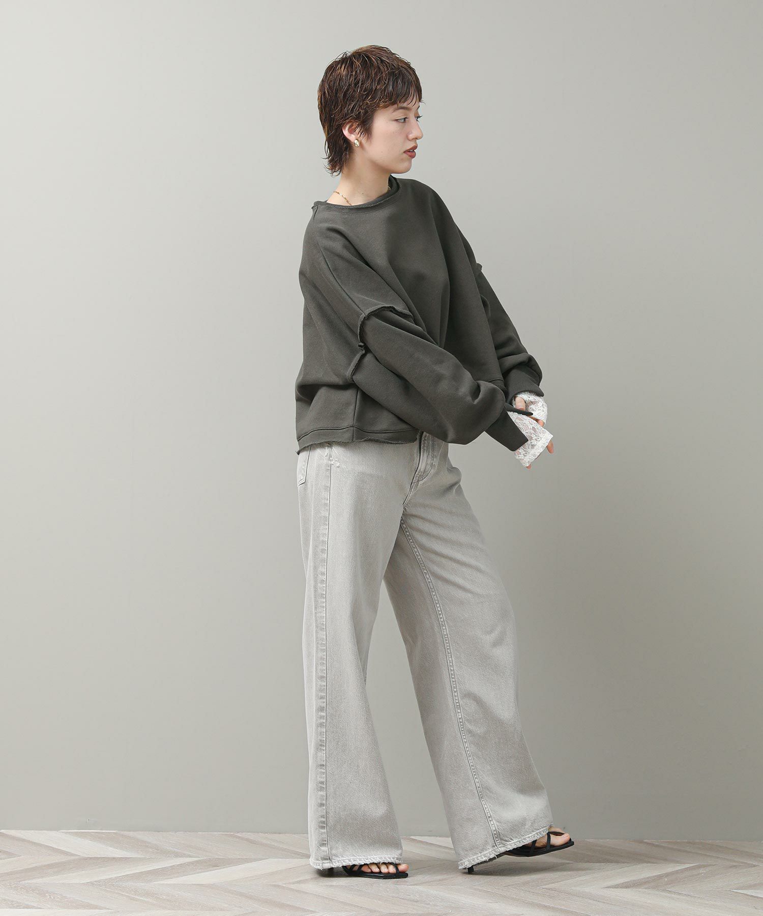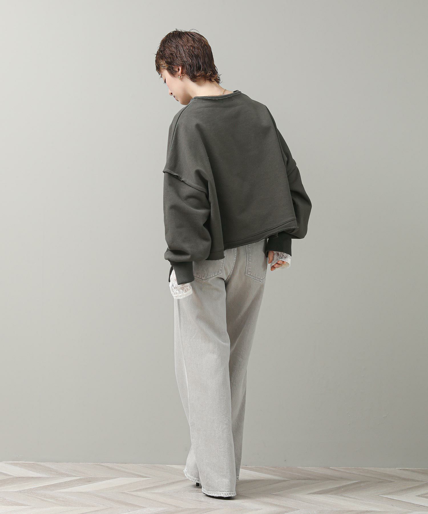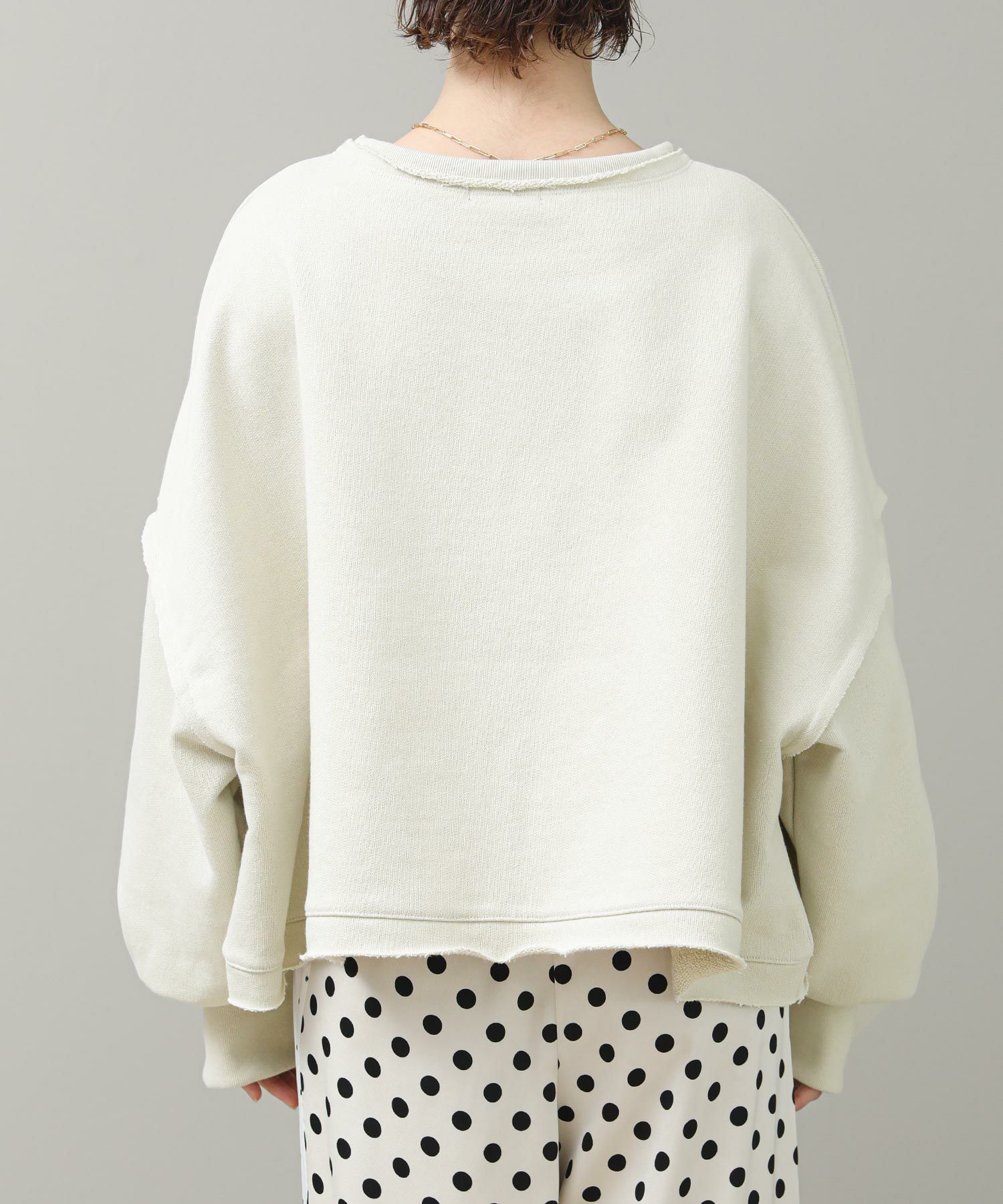 袖と裾でネックのレイヤード風のカットオフデザインが目を惹きます。たっぷりとしたオーバーシルエットですが、着丈を短めに設定しているのでワイドパンツやスカートとも好相性。
