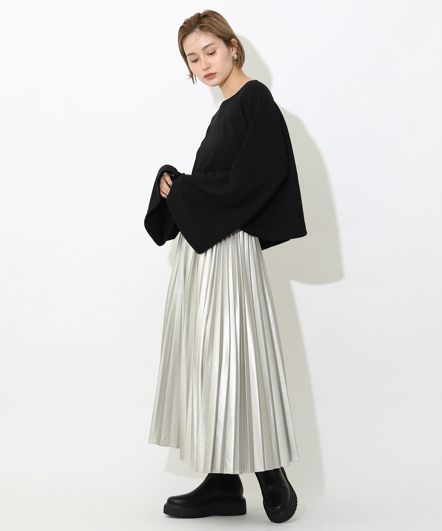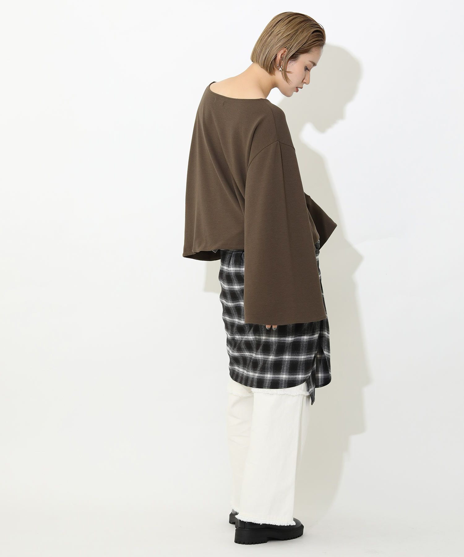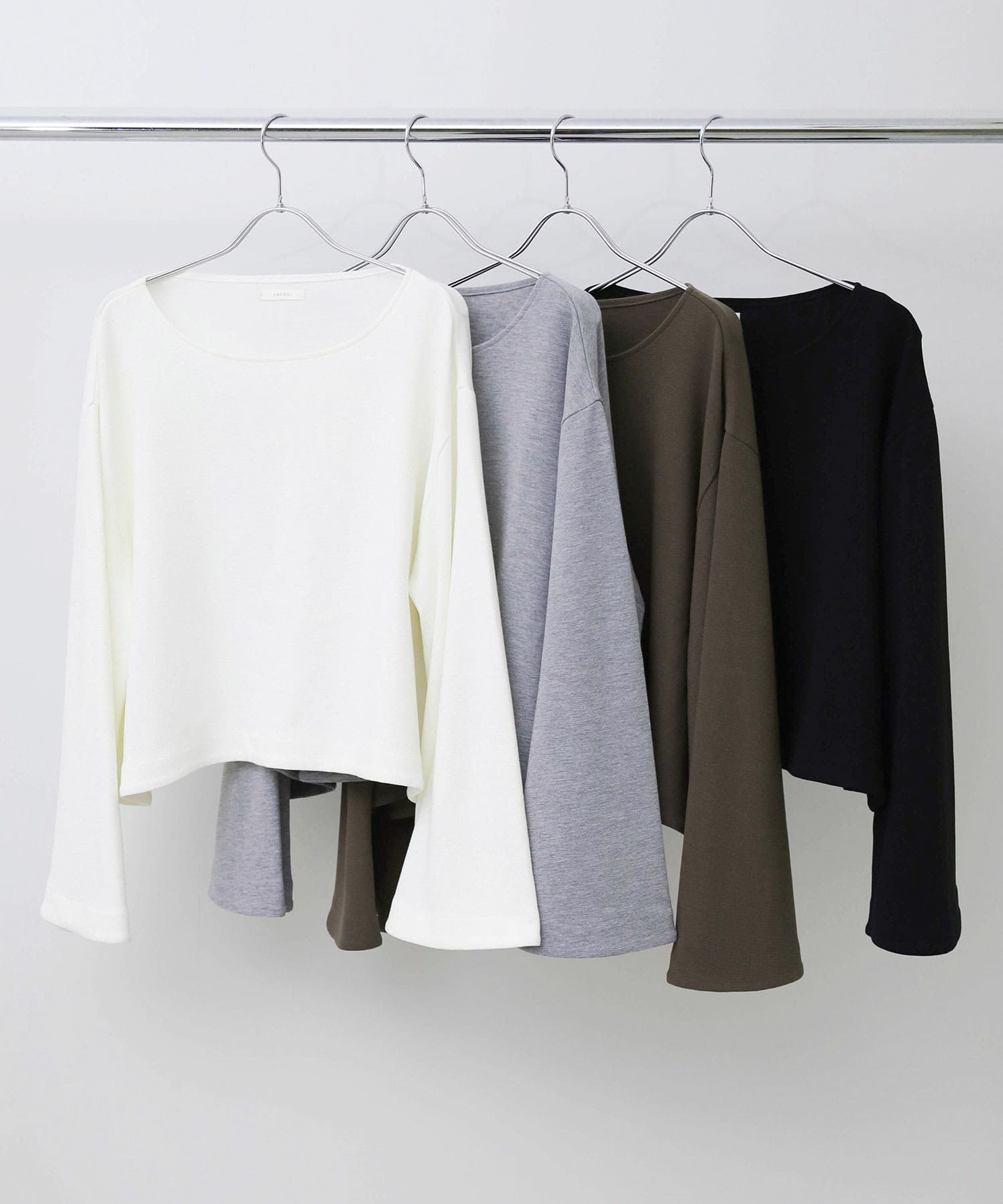 伸縮性が高く、ボディラインを拾わないリラックスしたシルエットがストレスフリーな着心地。広がりのあるフレアスリーブが手元に上品なニュアンスを与えます。デコルテを美しく見せるボートネックでよりエレガントな印象に。カジュアルなパンツを合わせたデイリースタイルから、スカート合わせのレディなスタイリングまで幅広く活躍できる一着です。