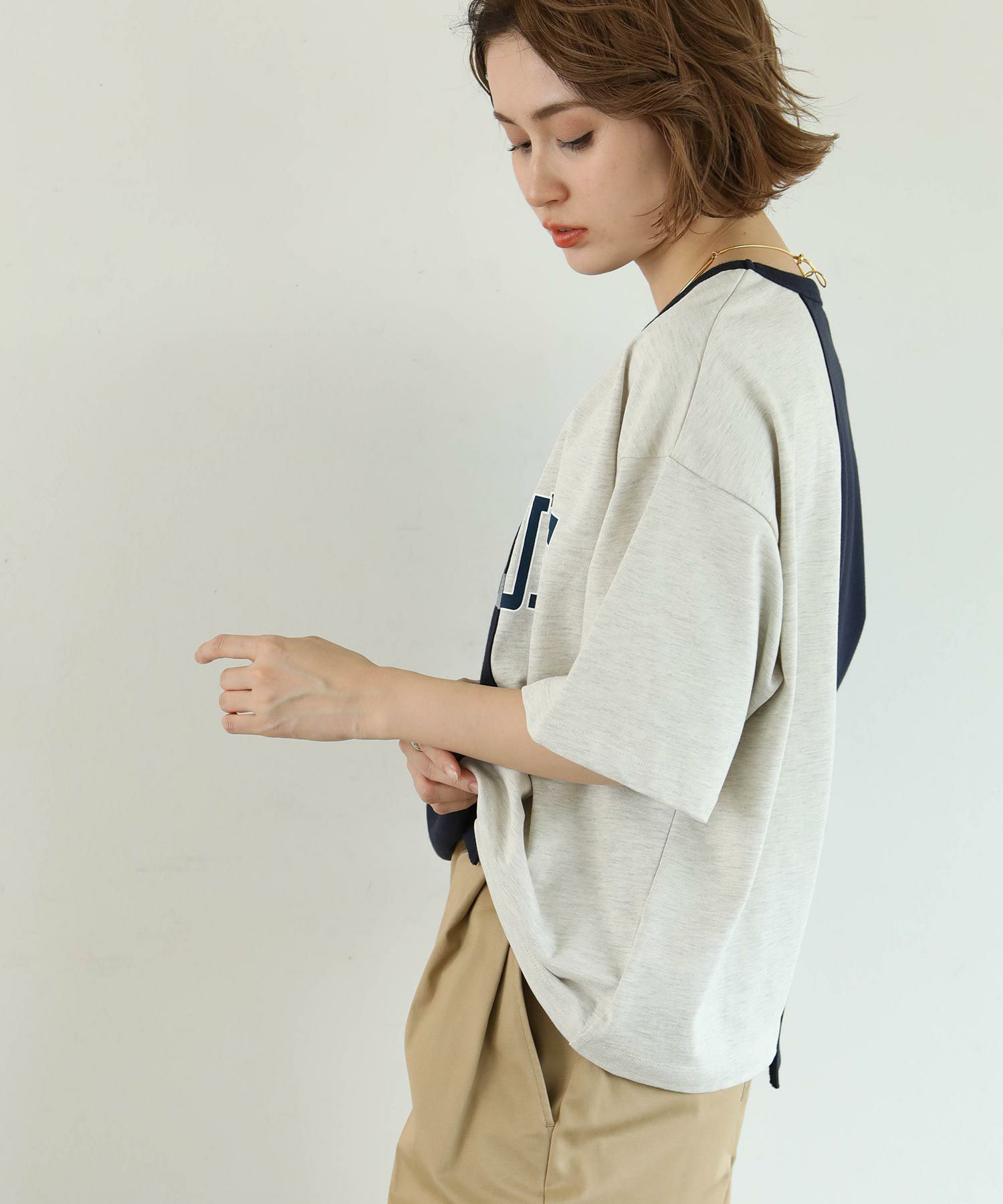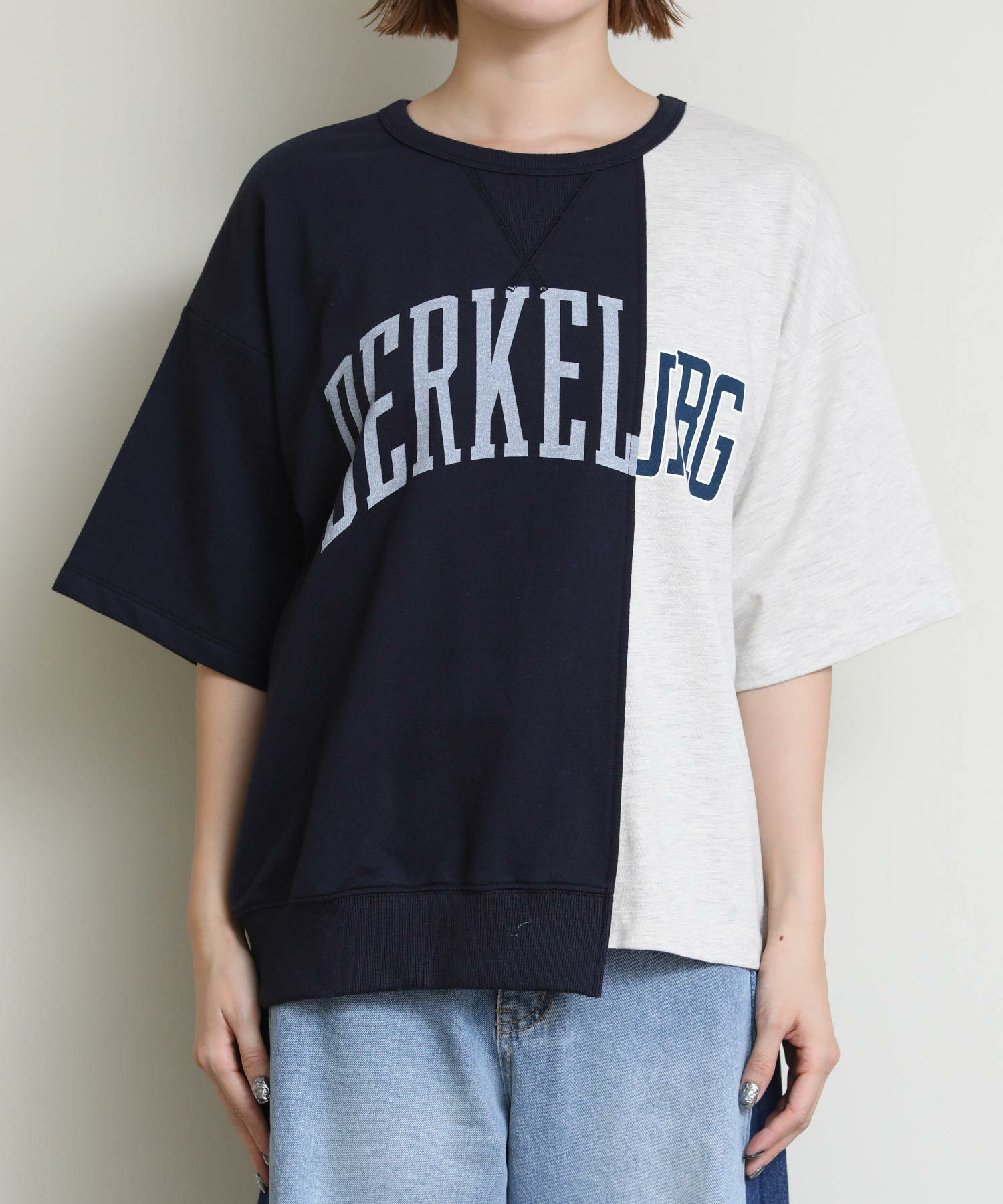 左右異なるロゴカットソーをドッキングさせたようなデザインがユニークな一着。