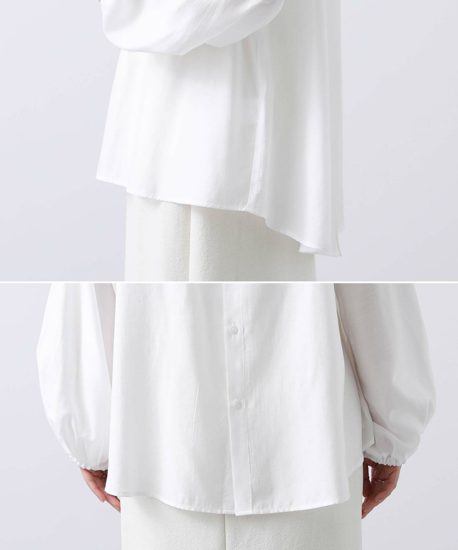 首のフリルと透けすぎないところが気に入り店舗で購入。ふんわり袖が手首を細く見せてくれます。上着を着てもゴワゴワせず、シワにならないところが◎ 前後変えると雰囲気が変わって着回しができそうです。