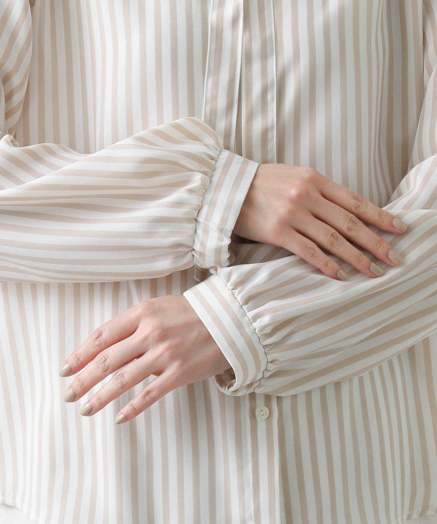 なめらかなタッチと微光沢、落ち感があり上質感のあるシルクライクなサテン生地を使用したブラウス。