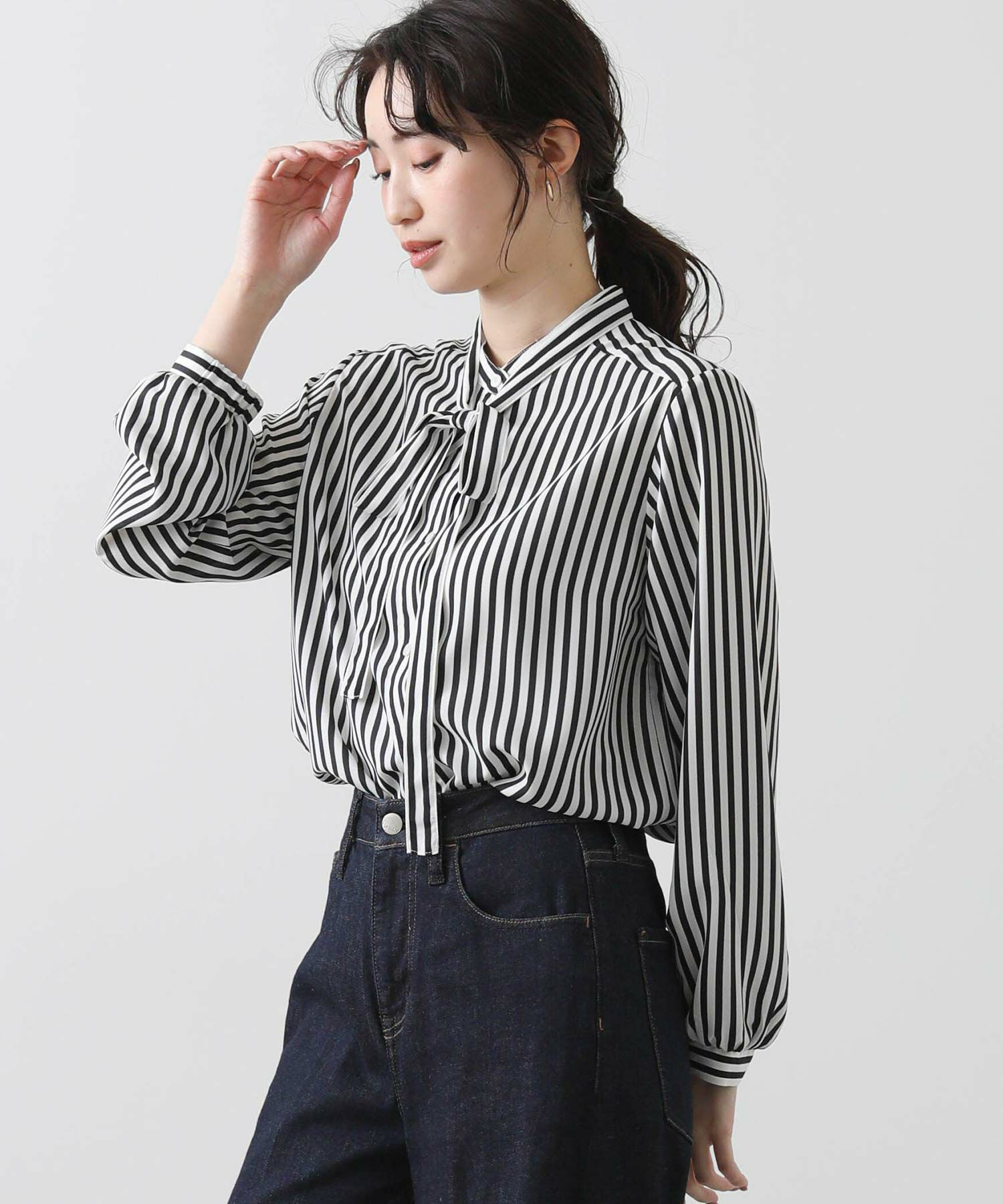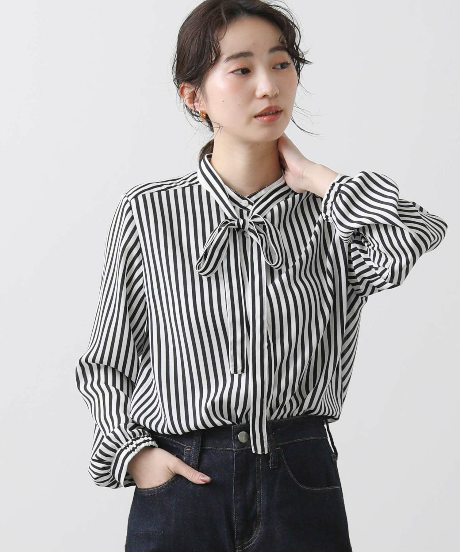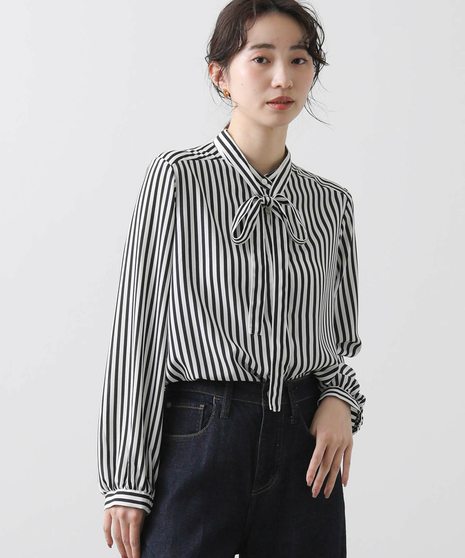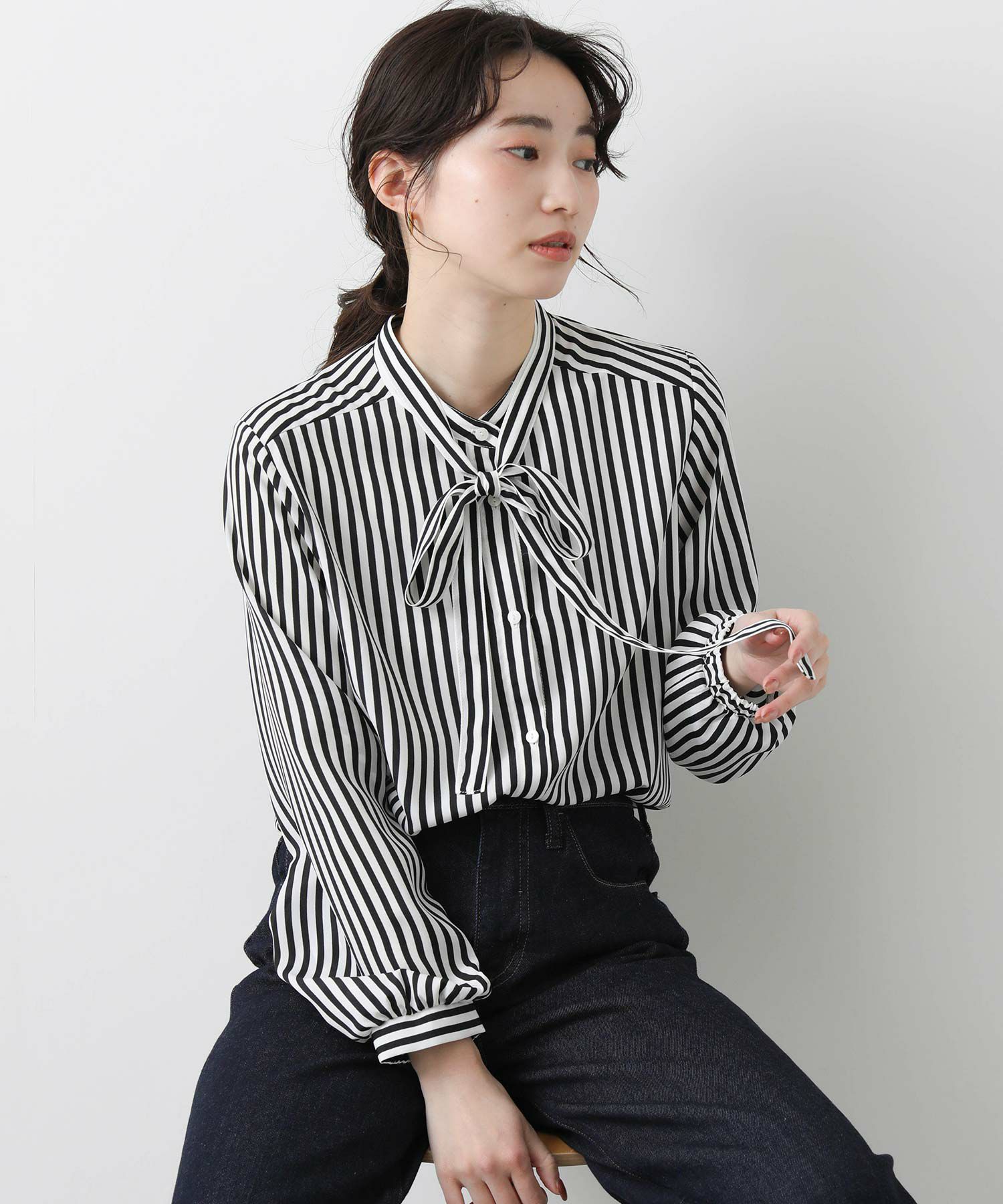 ボウタイは取り外し可能なので、アレンジ自由。オフィスにはもちろん、デニム合わせでカジュアルな着こなしにも幅広く活躍してくれます。