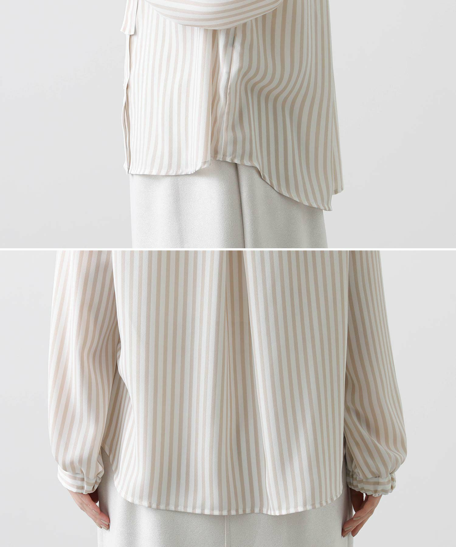なめらかなタッチと微光沢、落ち感があり上質感のあるシルクライクなサテン生地を使用したブラウス。