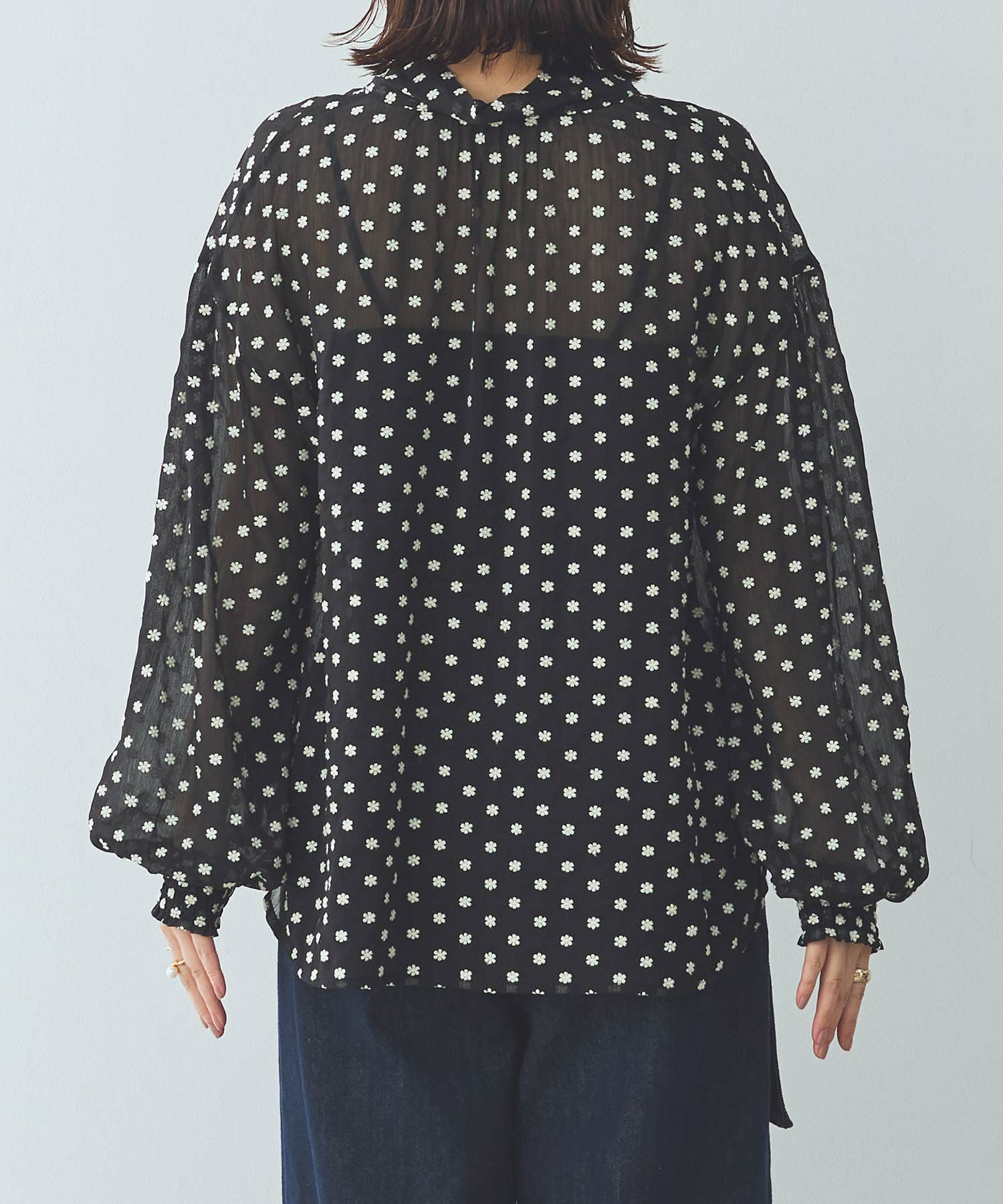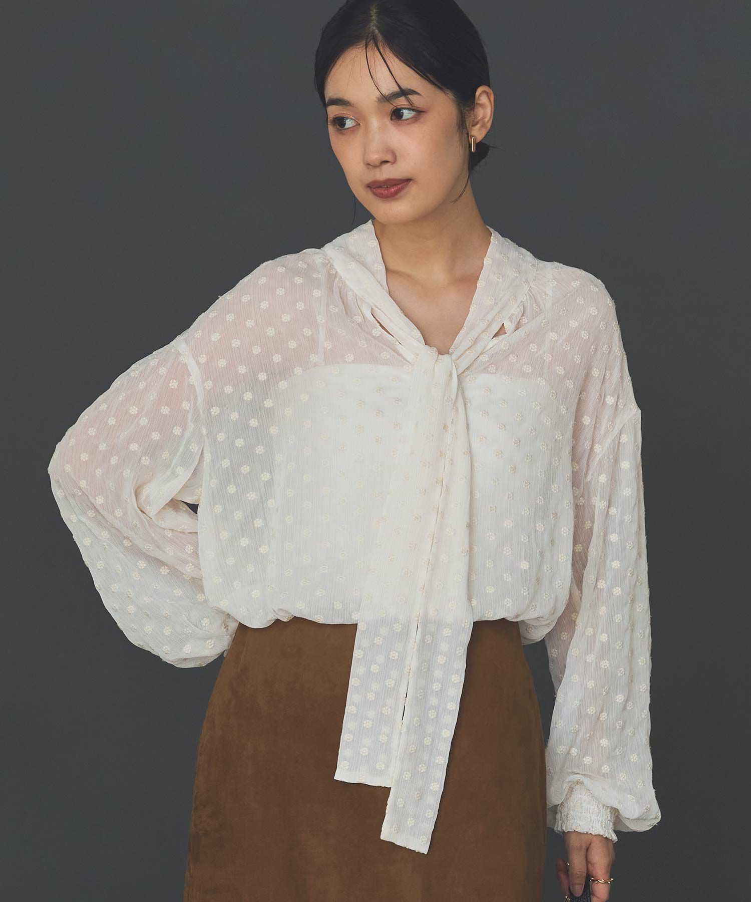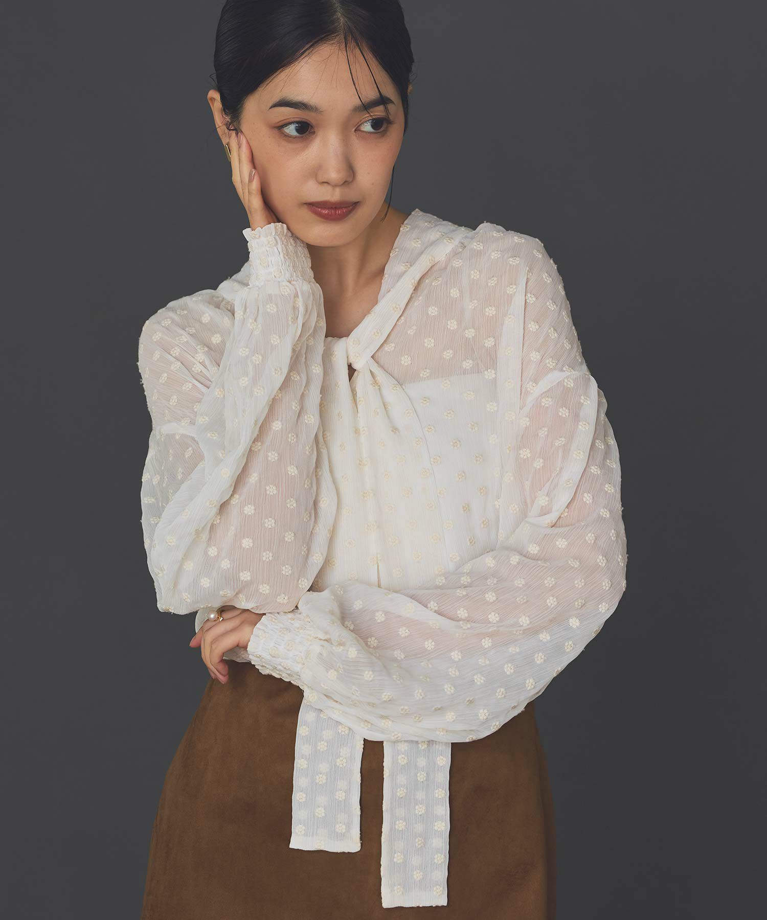 シアー感のある楊柳シフォンにお花の刺繍を施した生地を採用。ギャザーやリボンを施したデザインながら、シアーな素材の質感やネックの開きバランスで甘さを抑えた大人な仕上がりに。