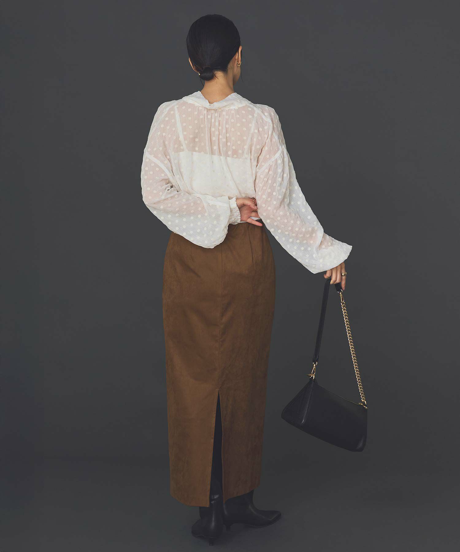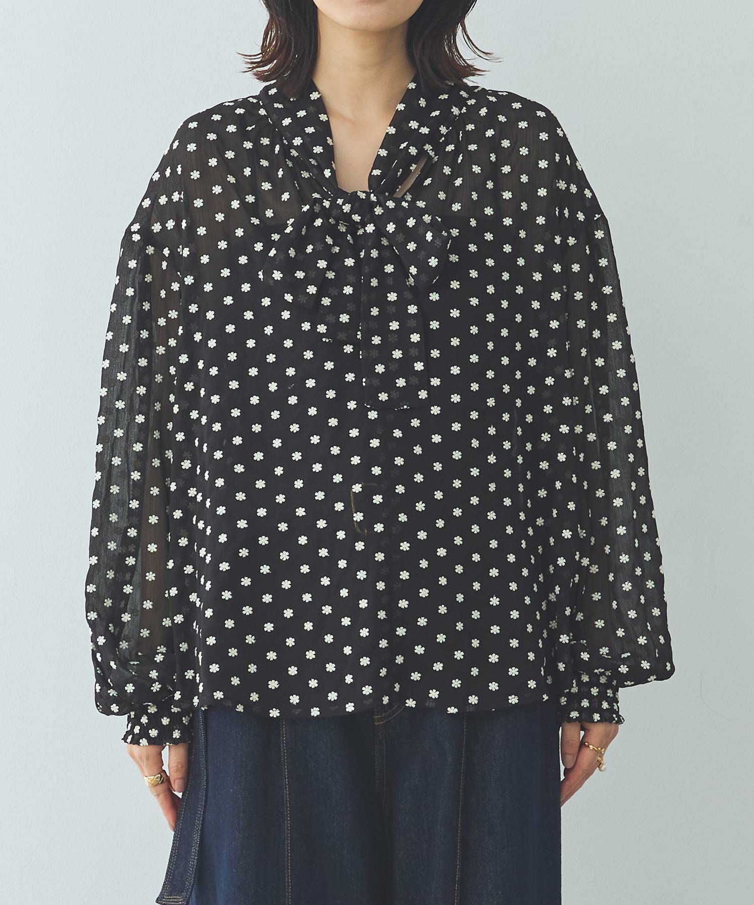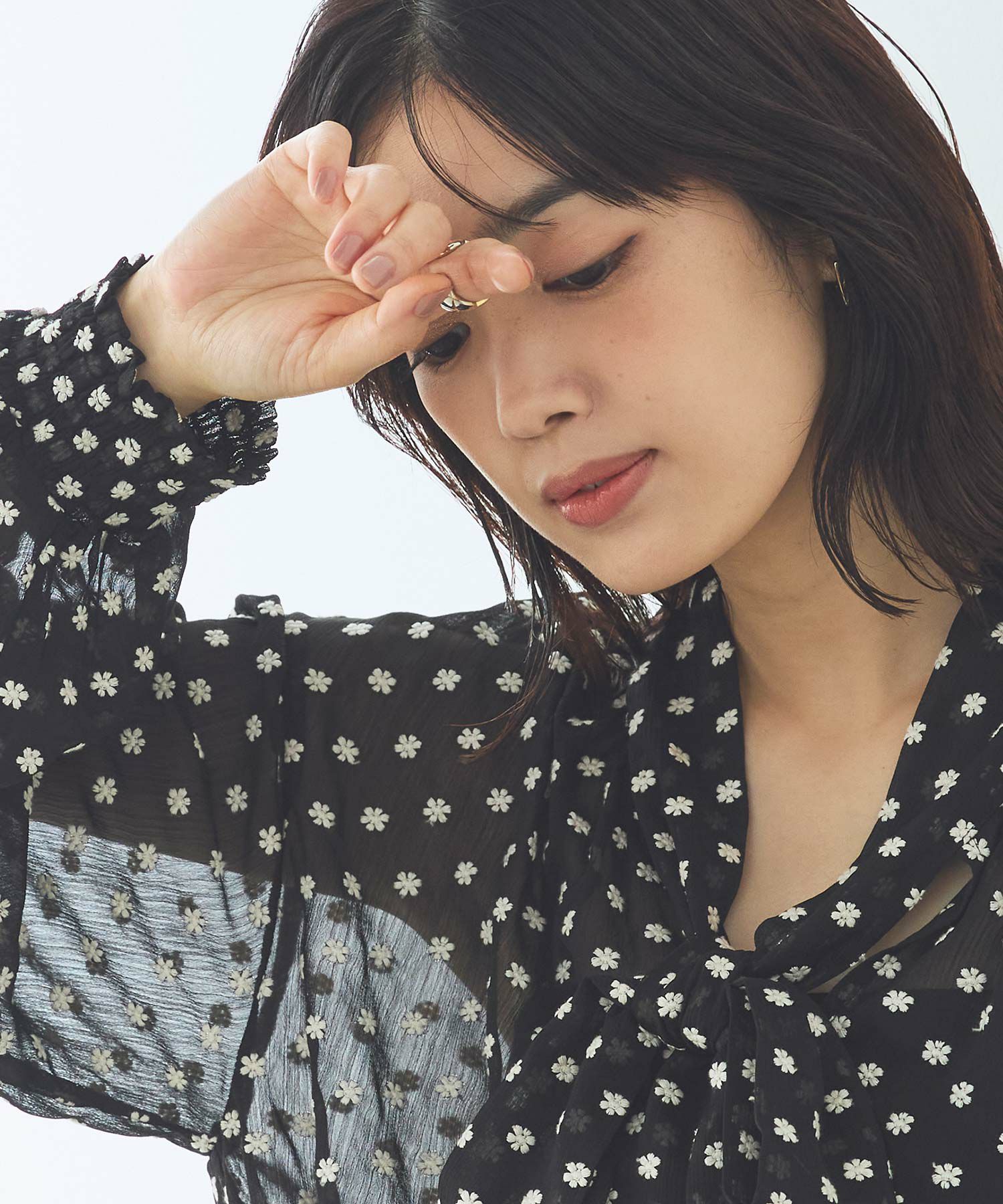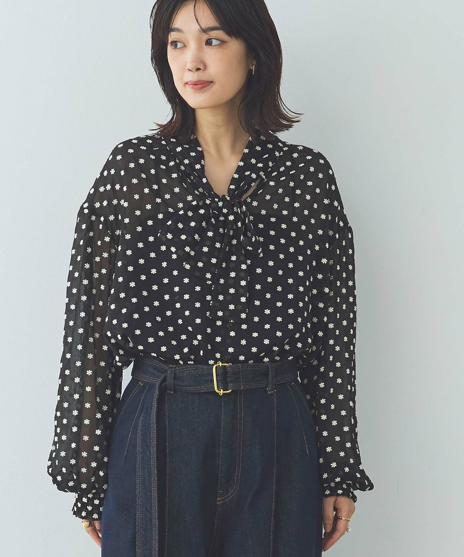 シアー感のある楊柳シフォンにお花の刺繍を施した生地を採用。ギャザーやリボンを施したデザインながら、シアーな素材の質感やネックの開きバランスで甘さを抑えた大人な仕上がりに。