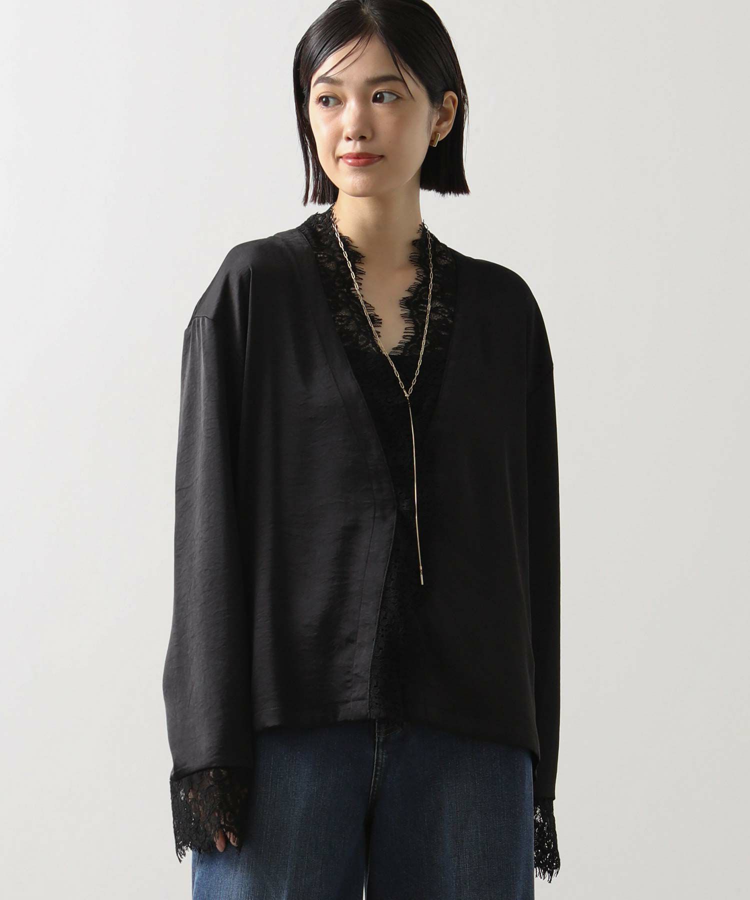 繊細なレースと組み合わせのデザインが今年らしく、カーディガンの様に軽い羽織や、ジャケットのレイヤードのアクセントとしても便利なアイテム。