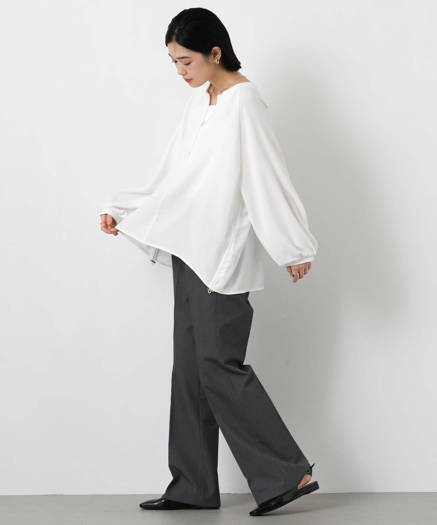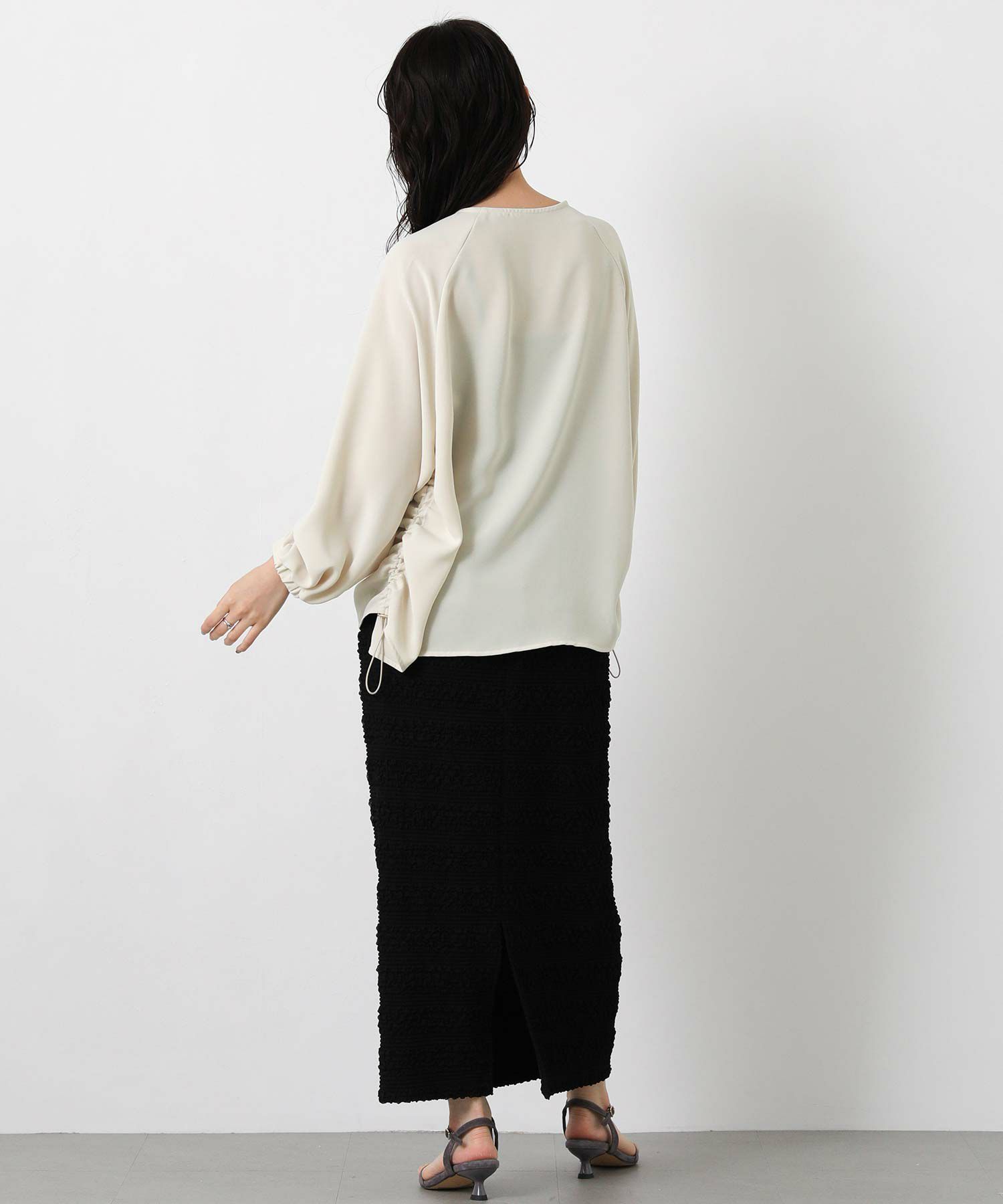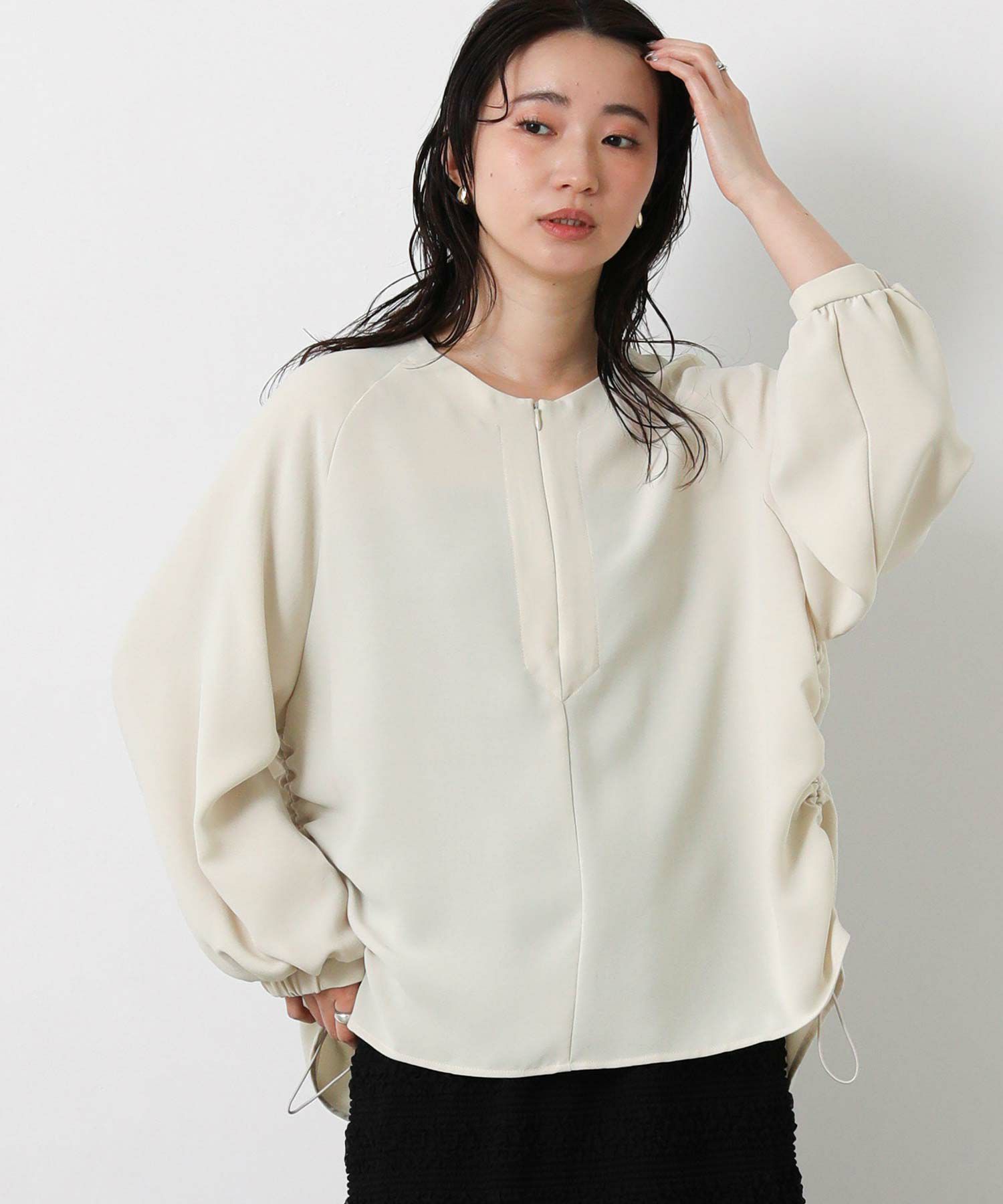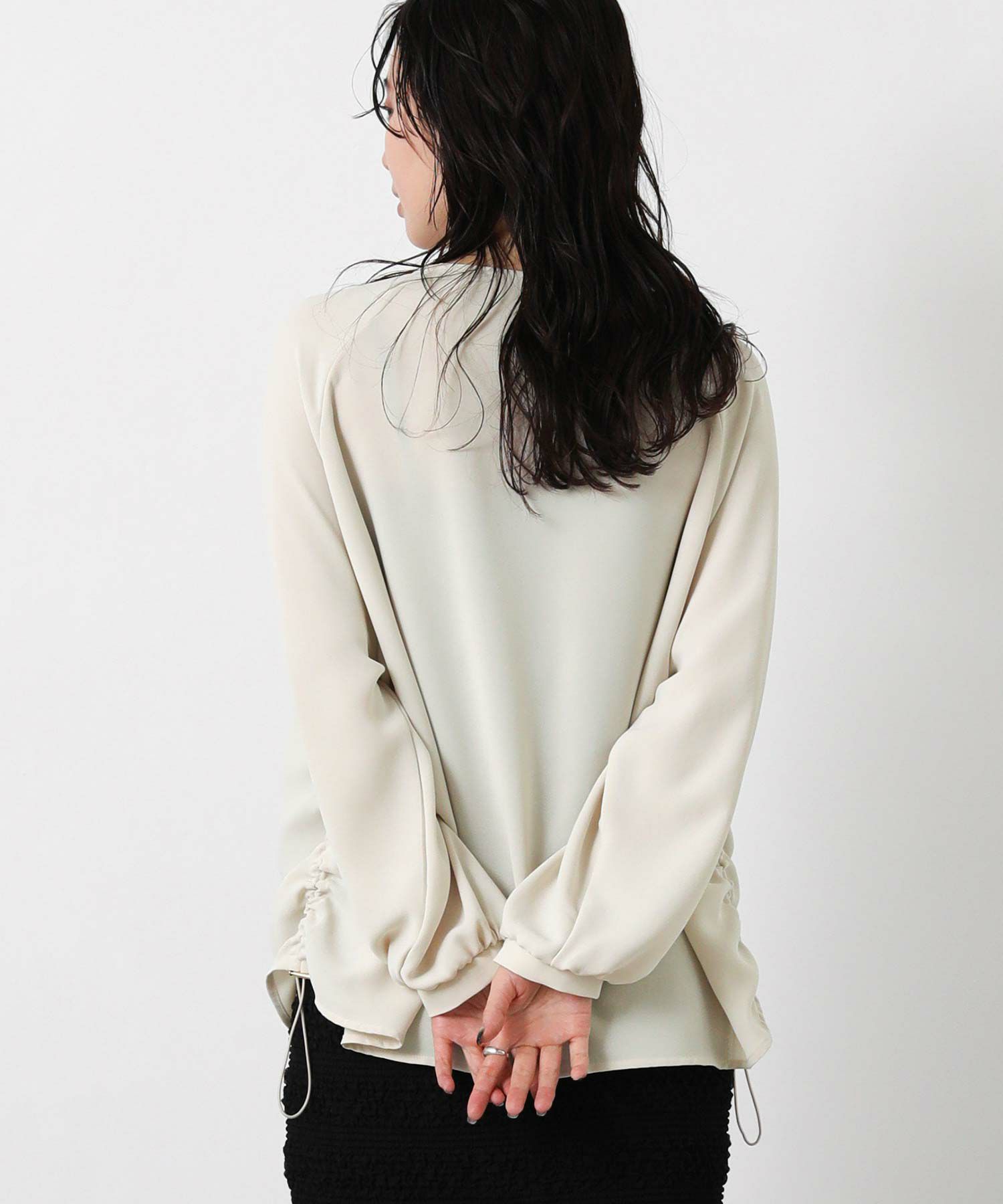 サイドにゴムを入れて着丈調整ができ、裾にニュアンスがでるのでインしなくてもお洒落に決まるデザイン。