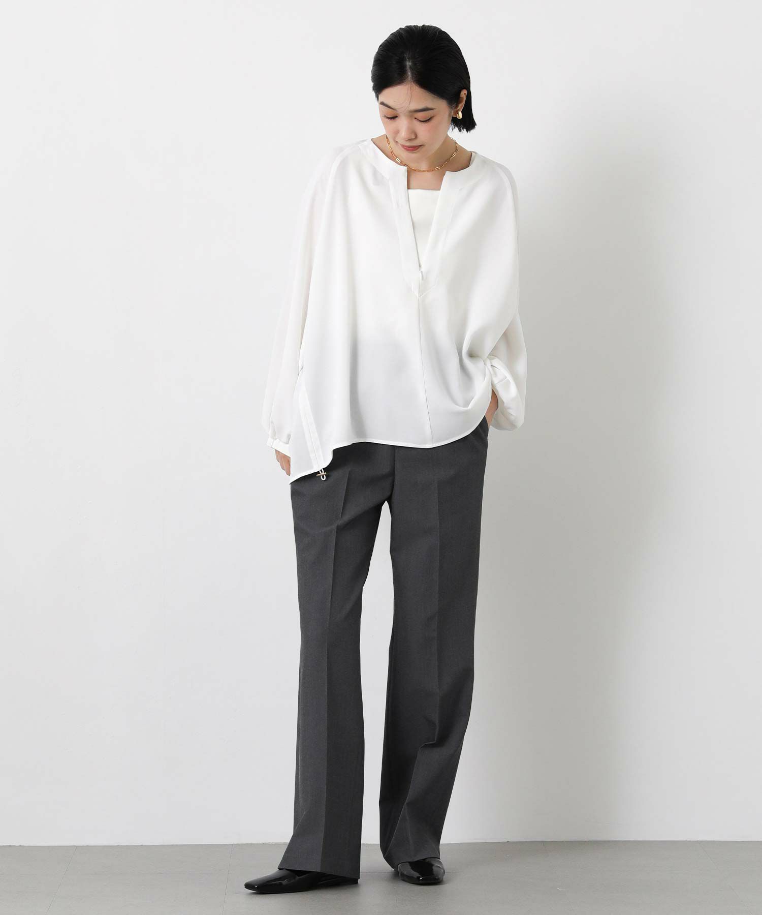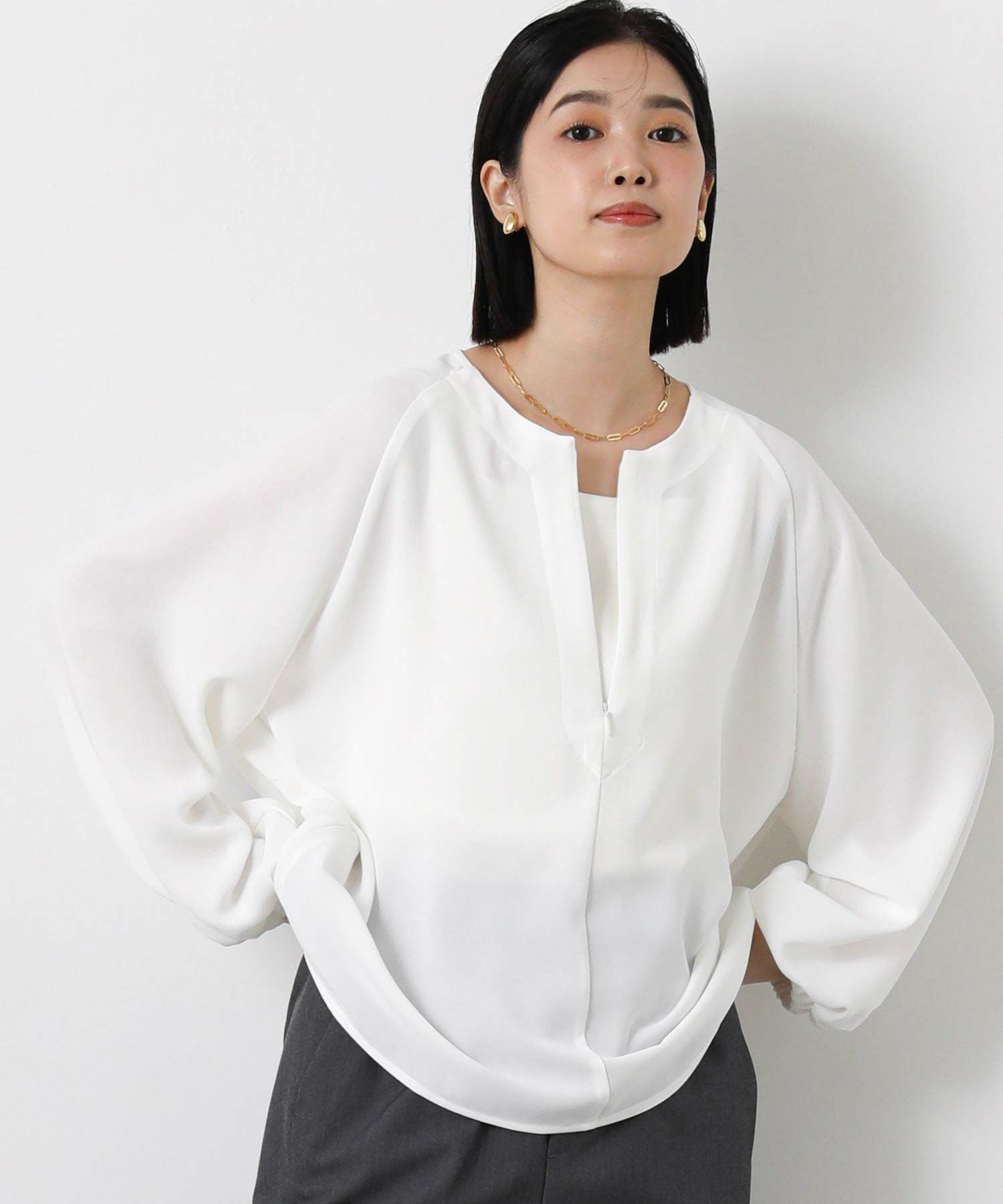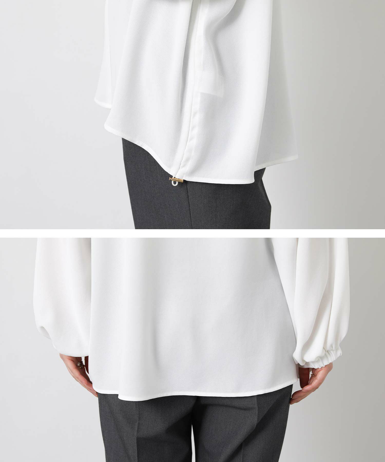 コンシールファスナーで調節可能なスキッパーデザインで、首元は抜け感がでて顔回りスッキリみえます。