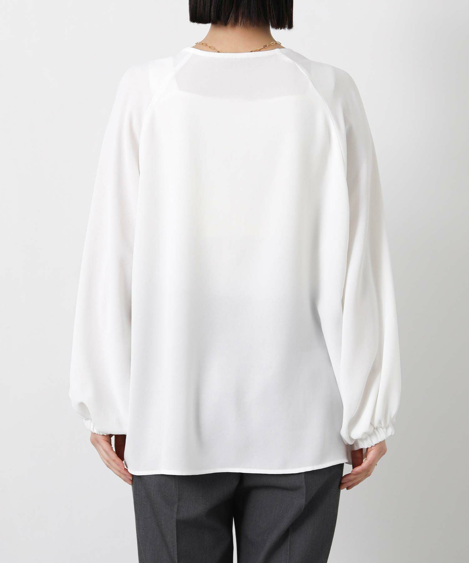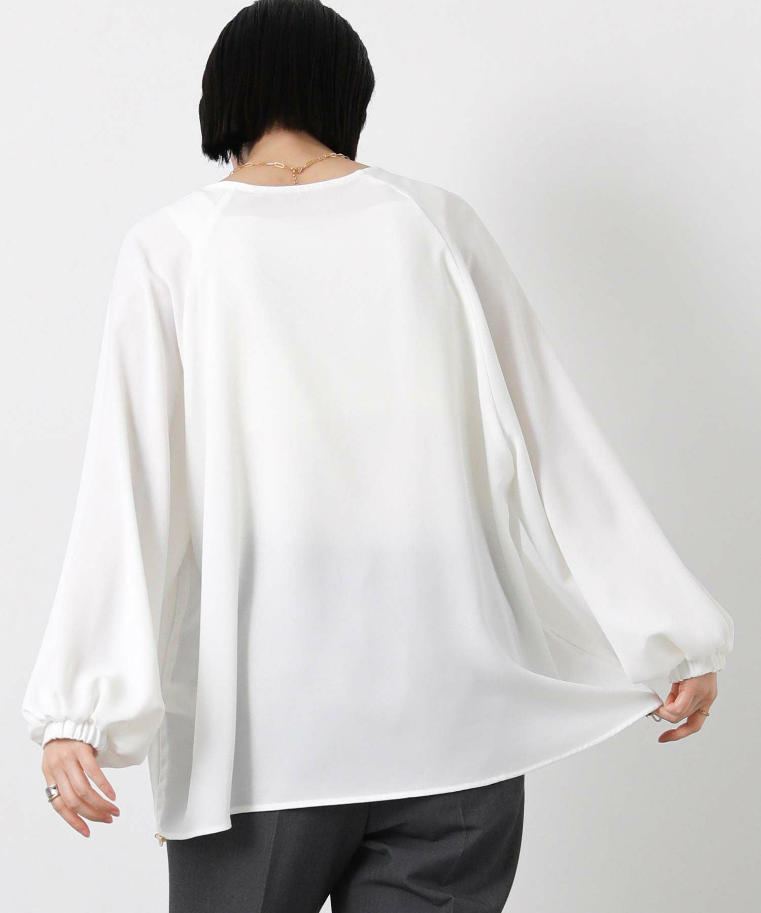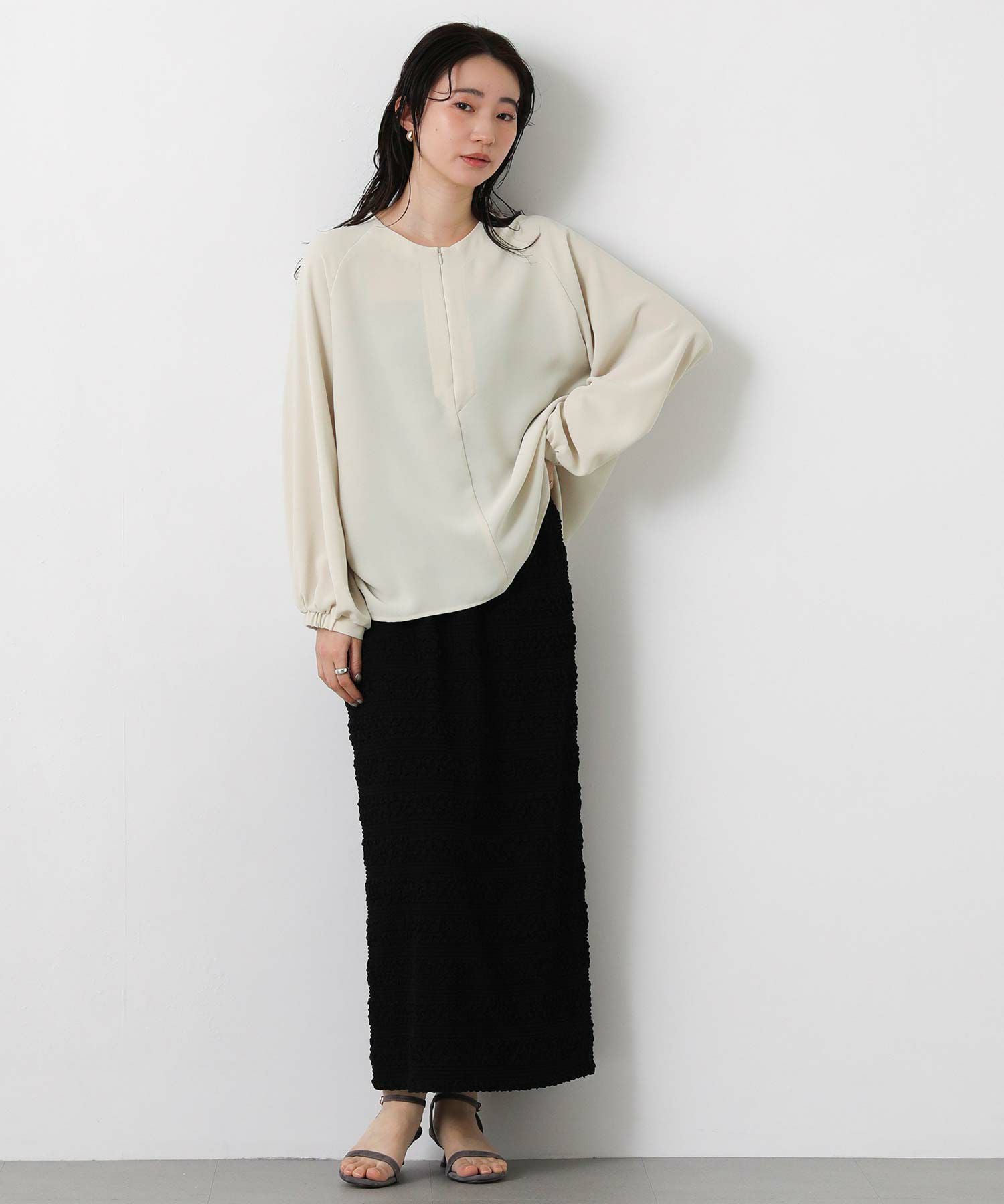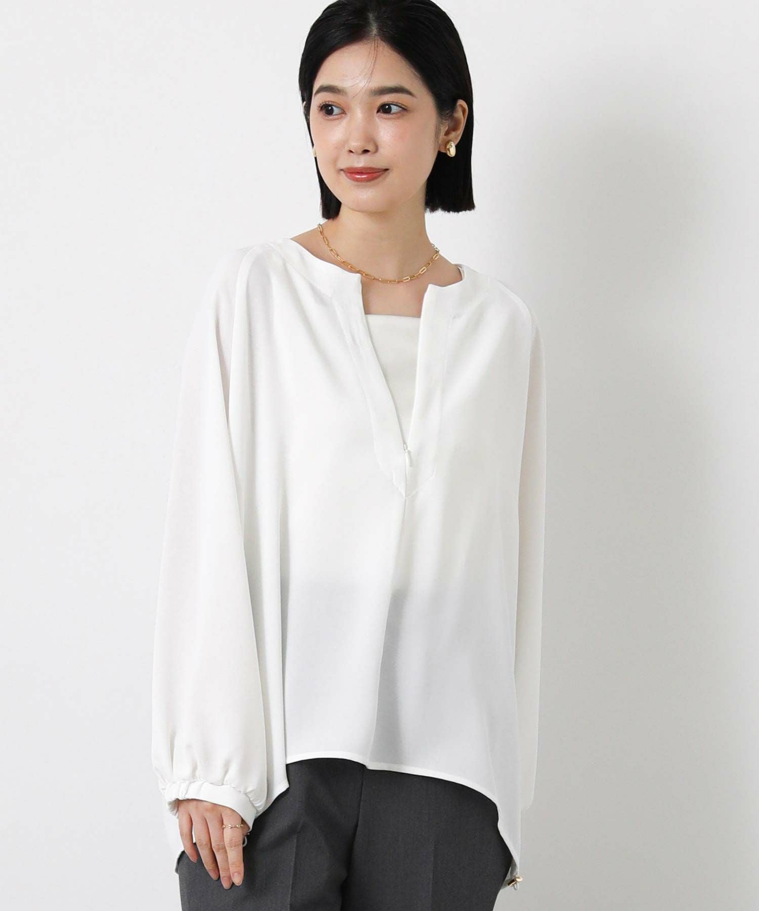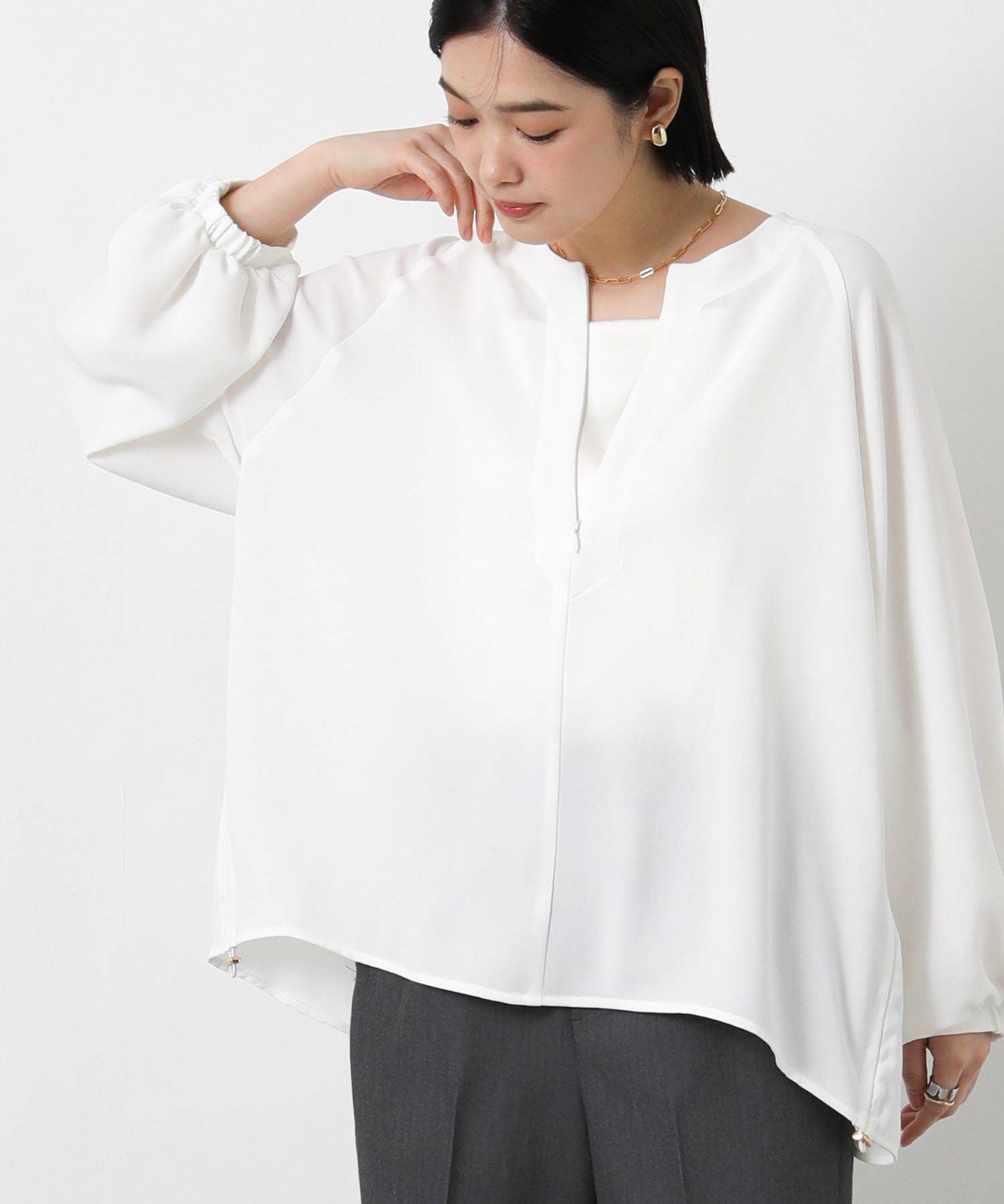 コンシールファスナーで調節可能なスキッパーデザインで、首元は抜け感がでて顔回りスッキリみえます。