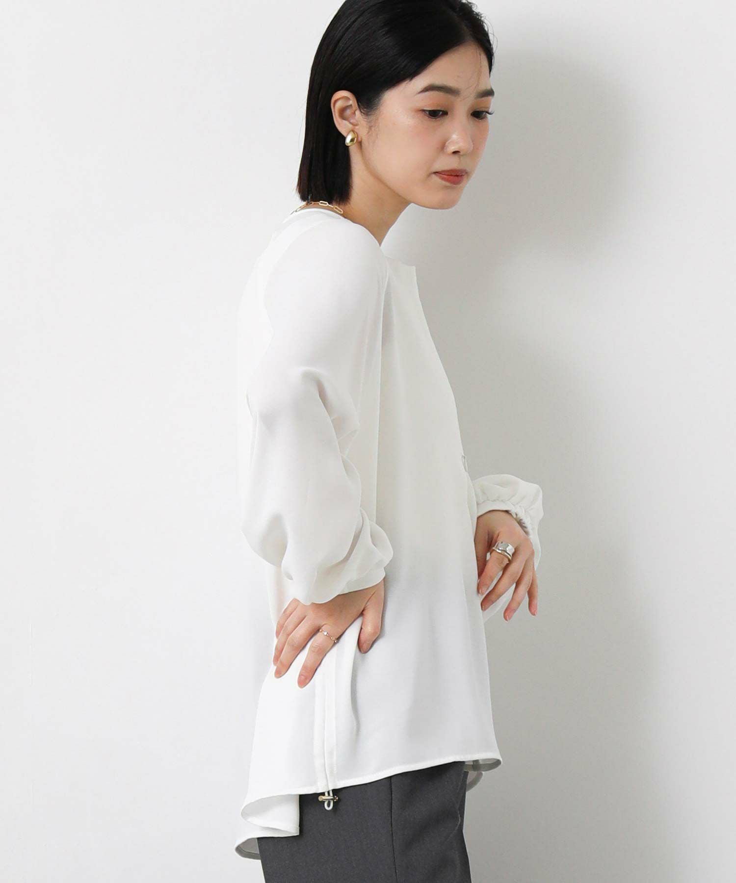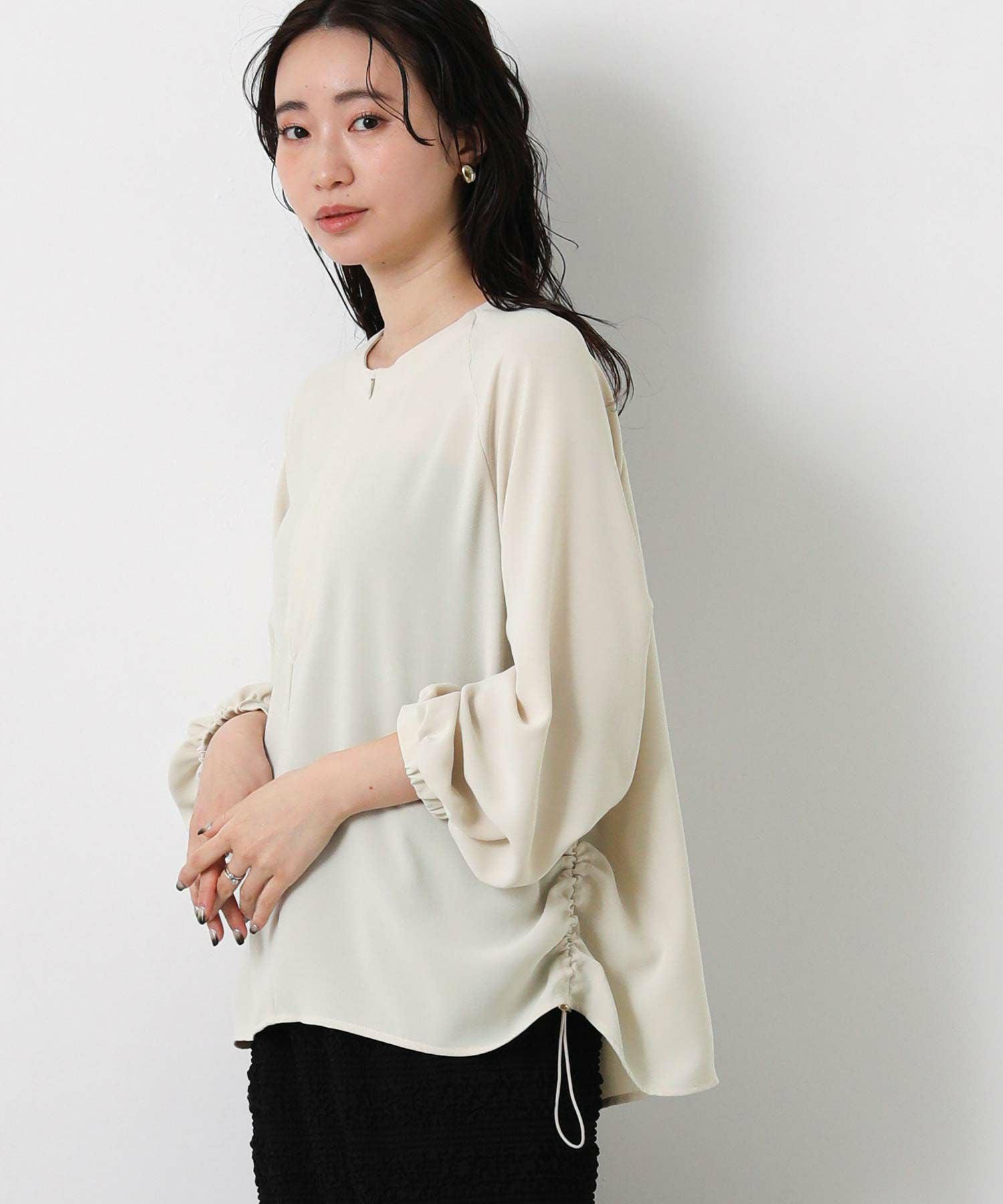 サイドにゴムを入れて着丈調整ができ、裾にニュアンスがでるのでインしなくてもお洒落に決まるデザイン。