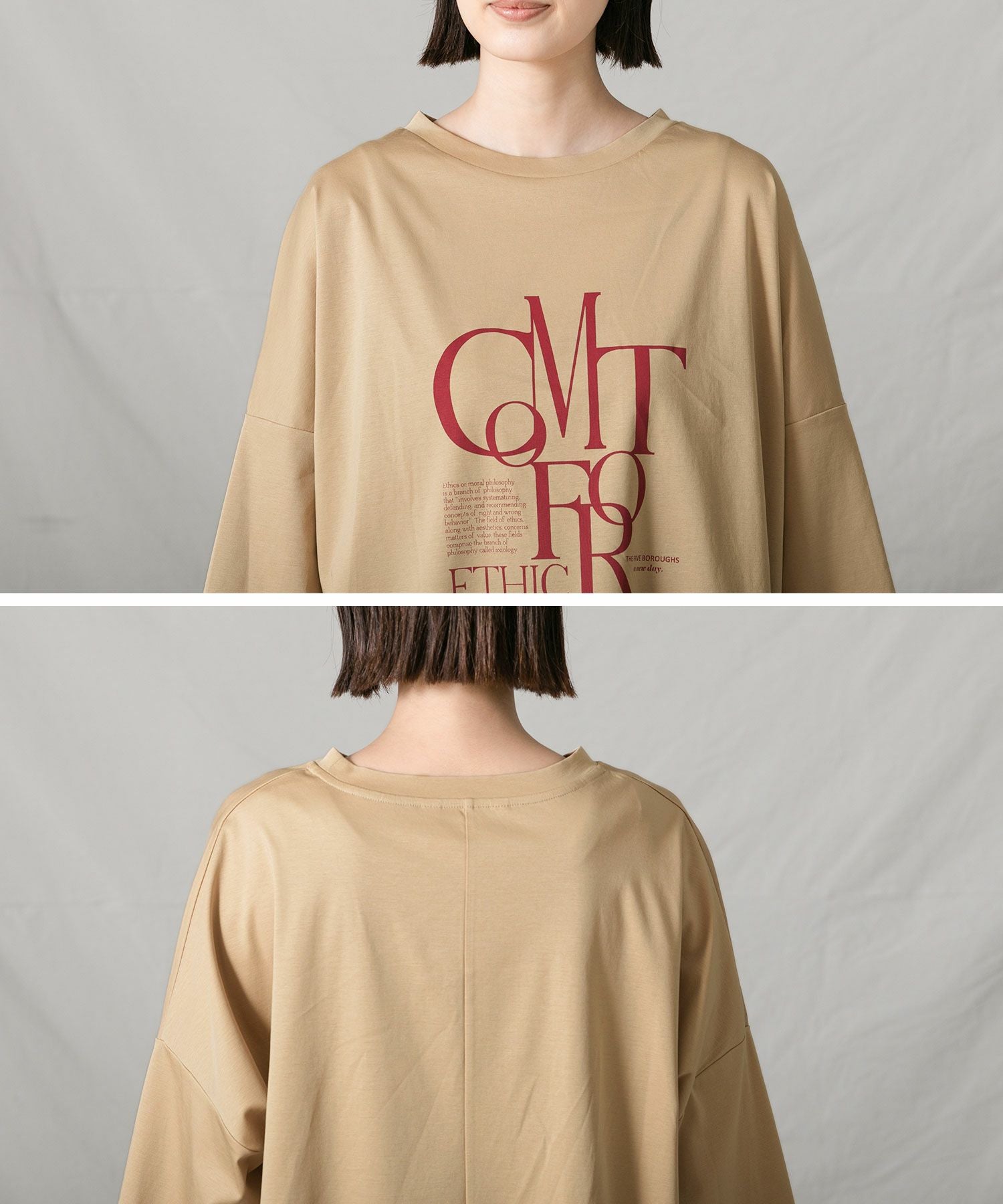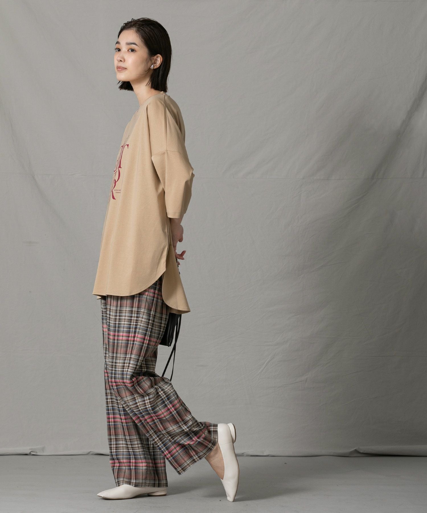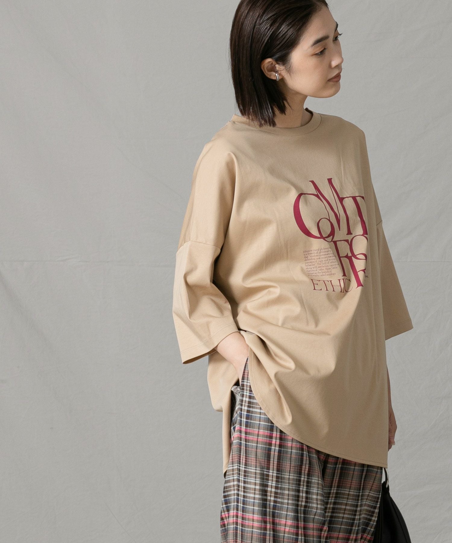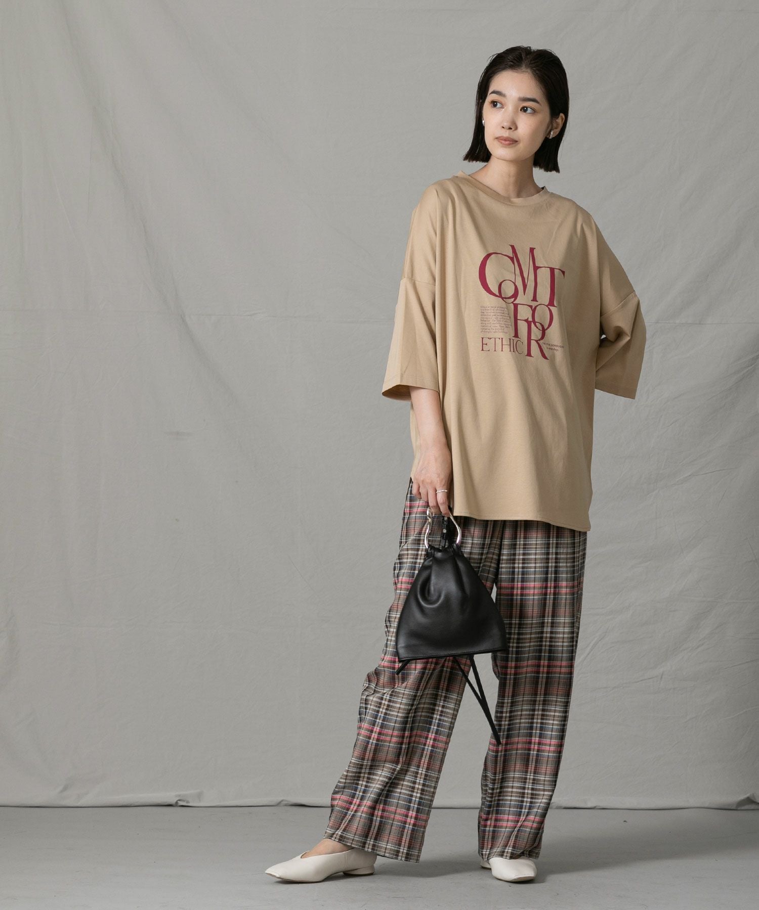 ロゴは大小の文字を組み合わせ、シックな配色にすることで秋らしい雰囲気に仕上がりました。ゆったりとしたサイズ感なので袖をロールアップしてもバランス良く、こなれ感もアップします。