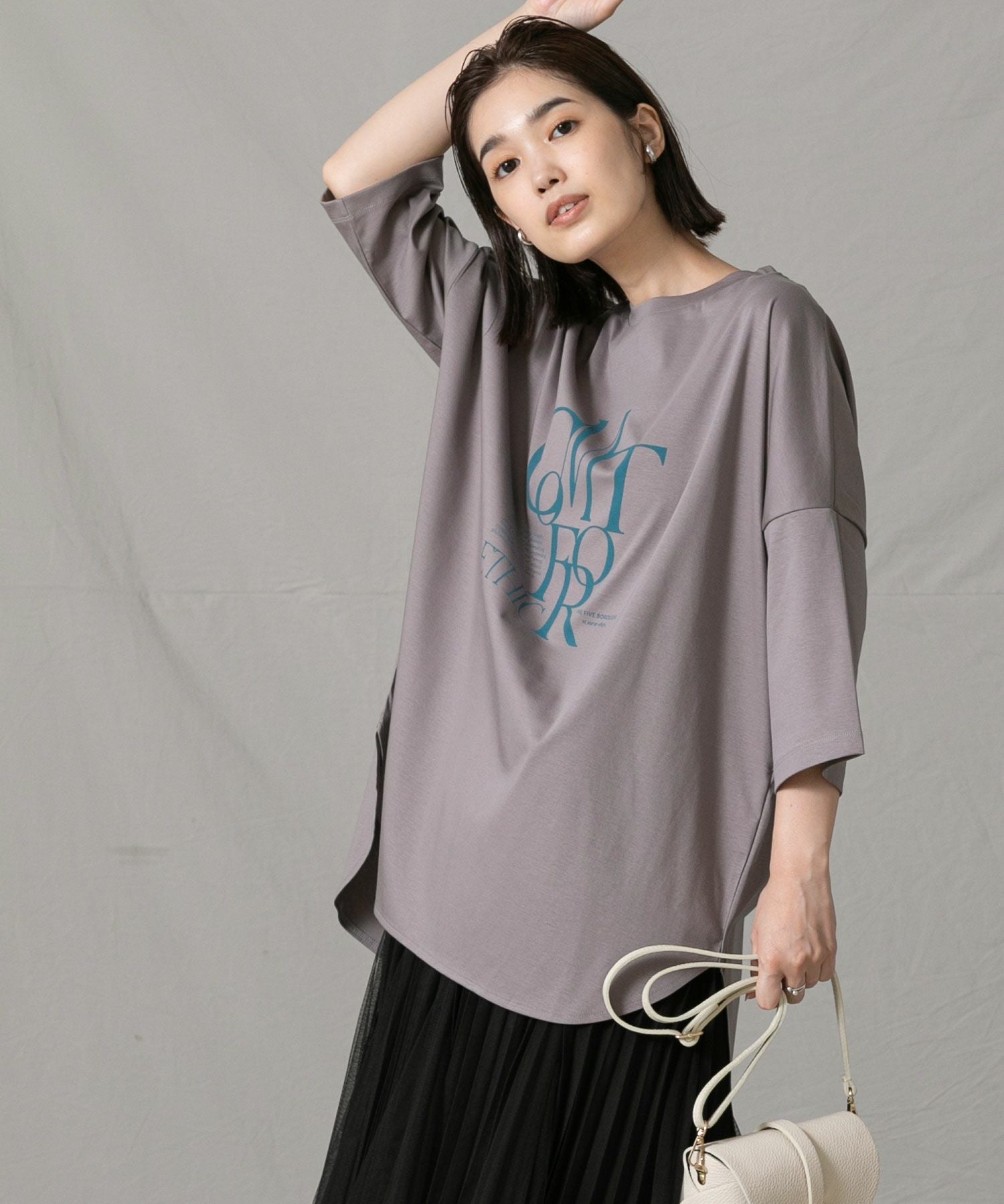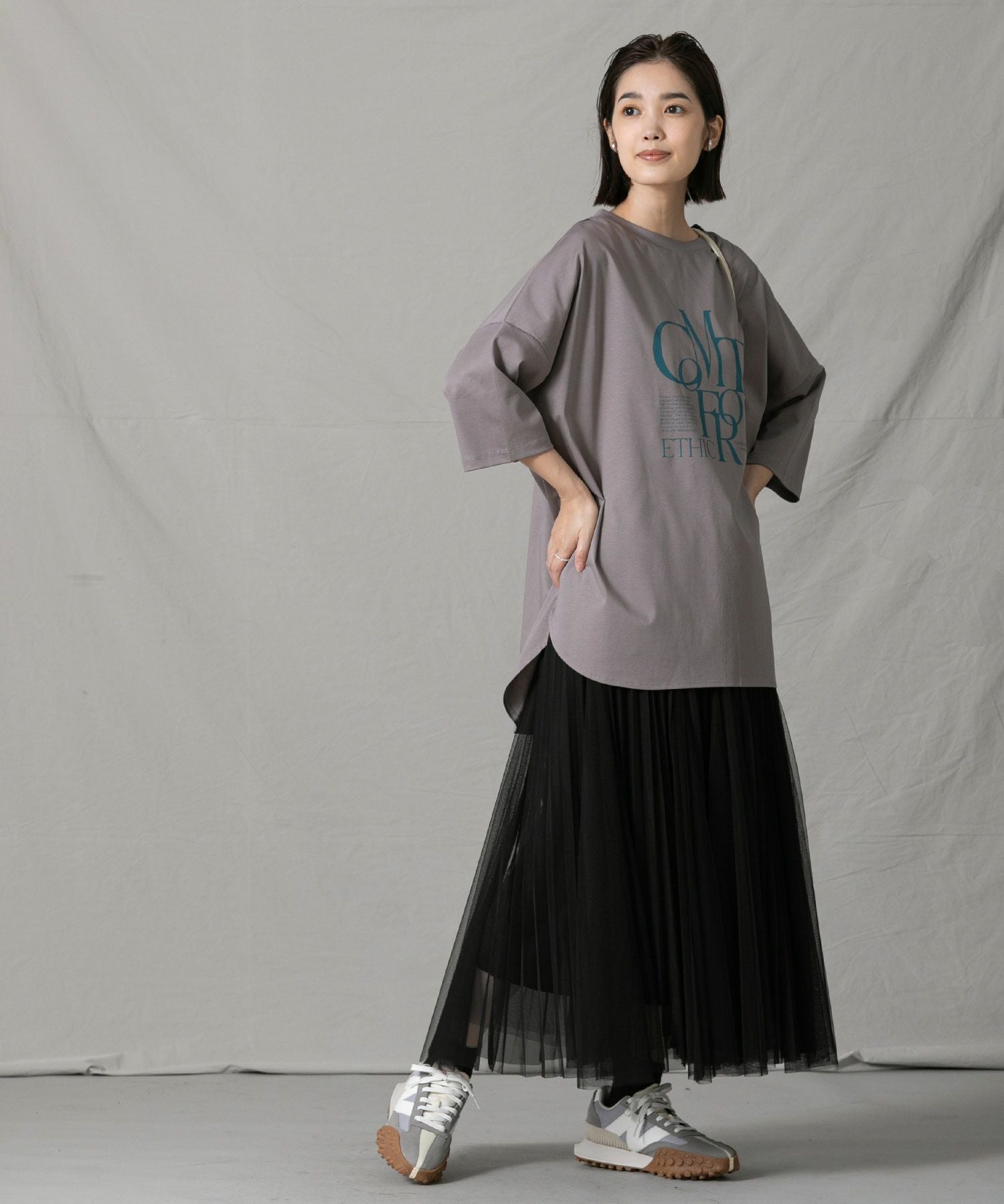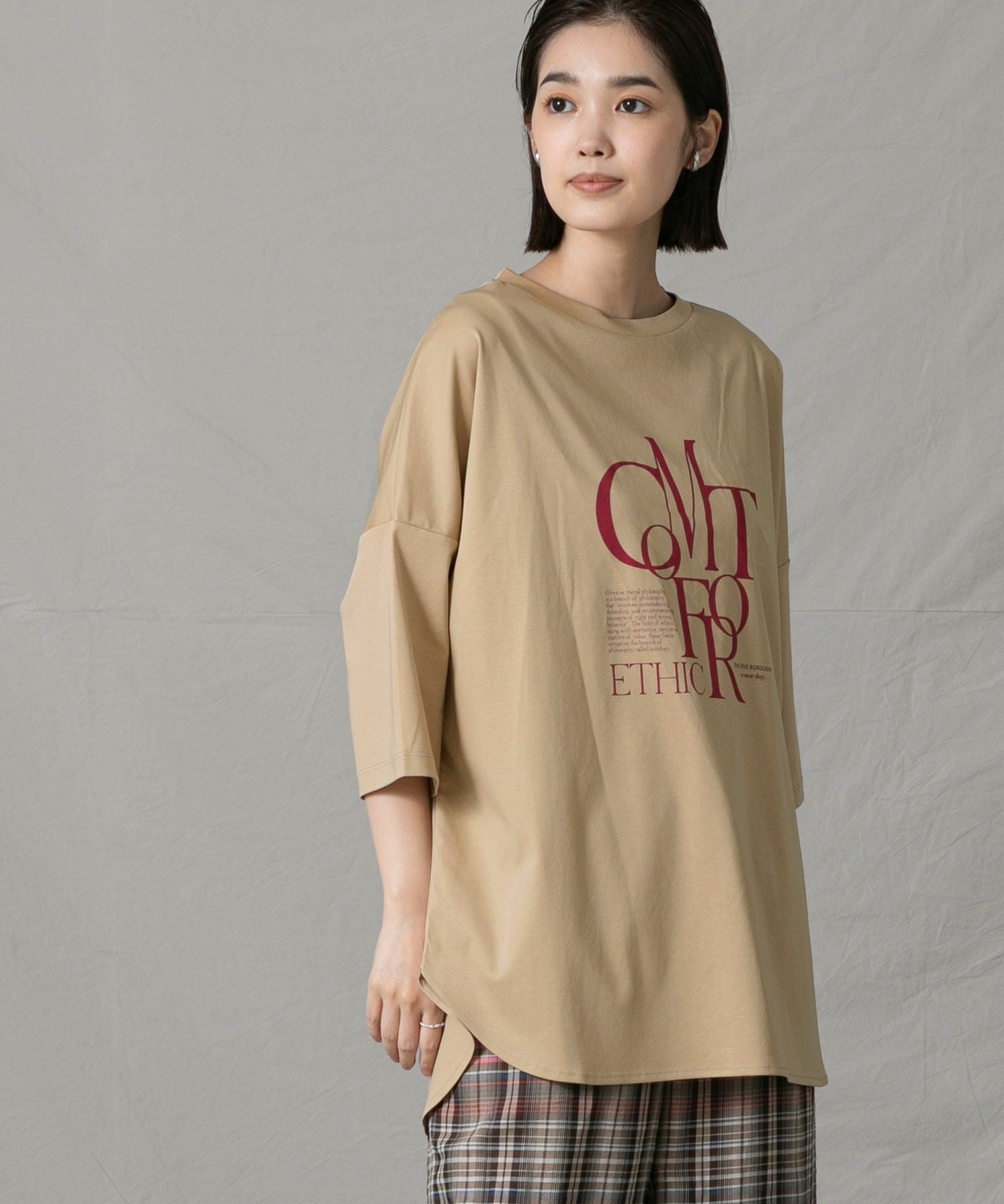 ロゴは大小の文字を組み合わせ、シックな配色にすることで秋らしい雰囲気に仕上がりました。ゆったりとしたサイズ感なので袖をロールアップしてもバランス良く、こなれ感もアップします。
