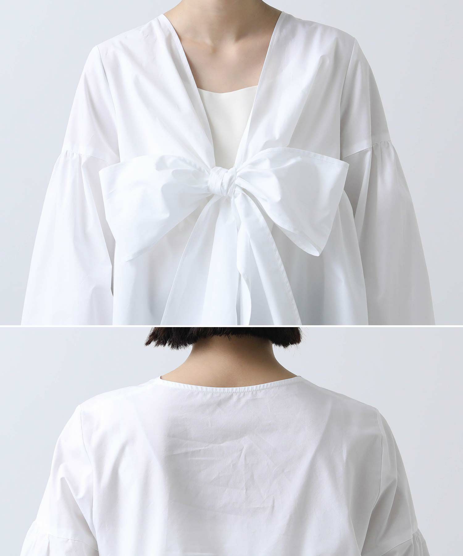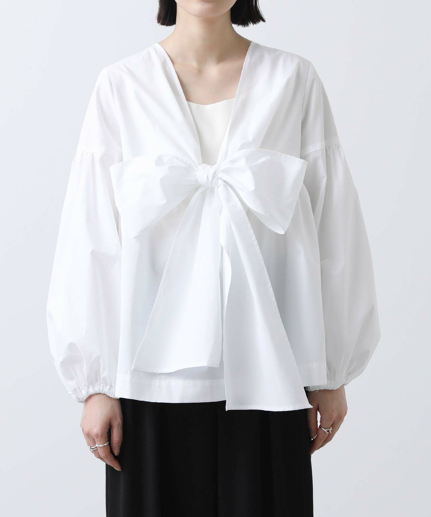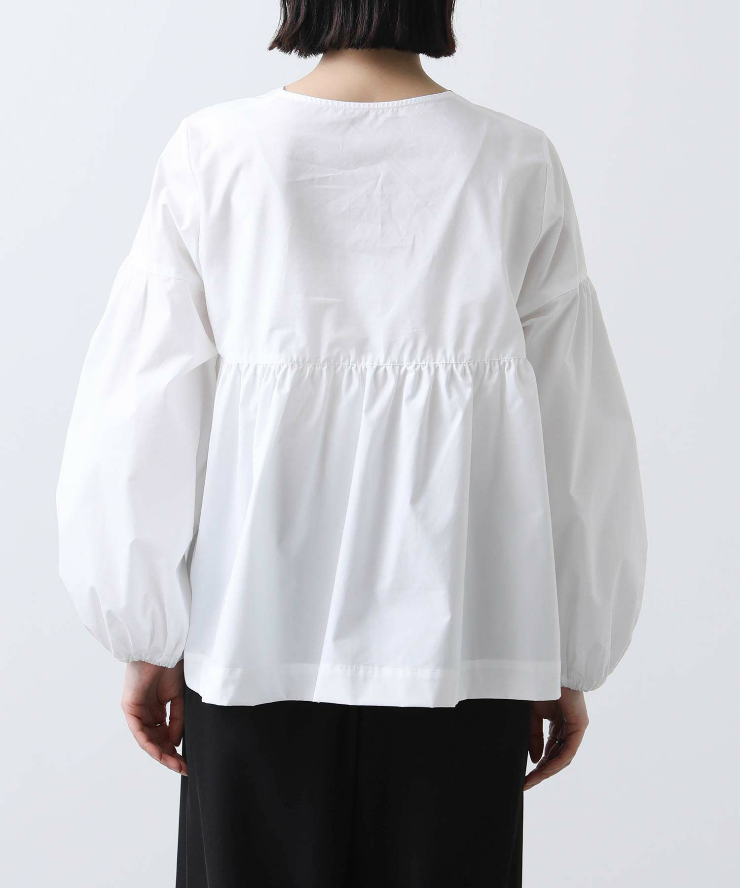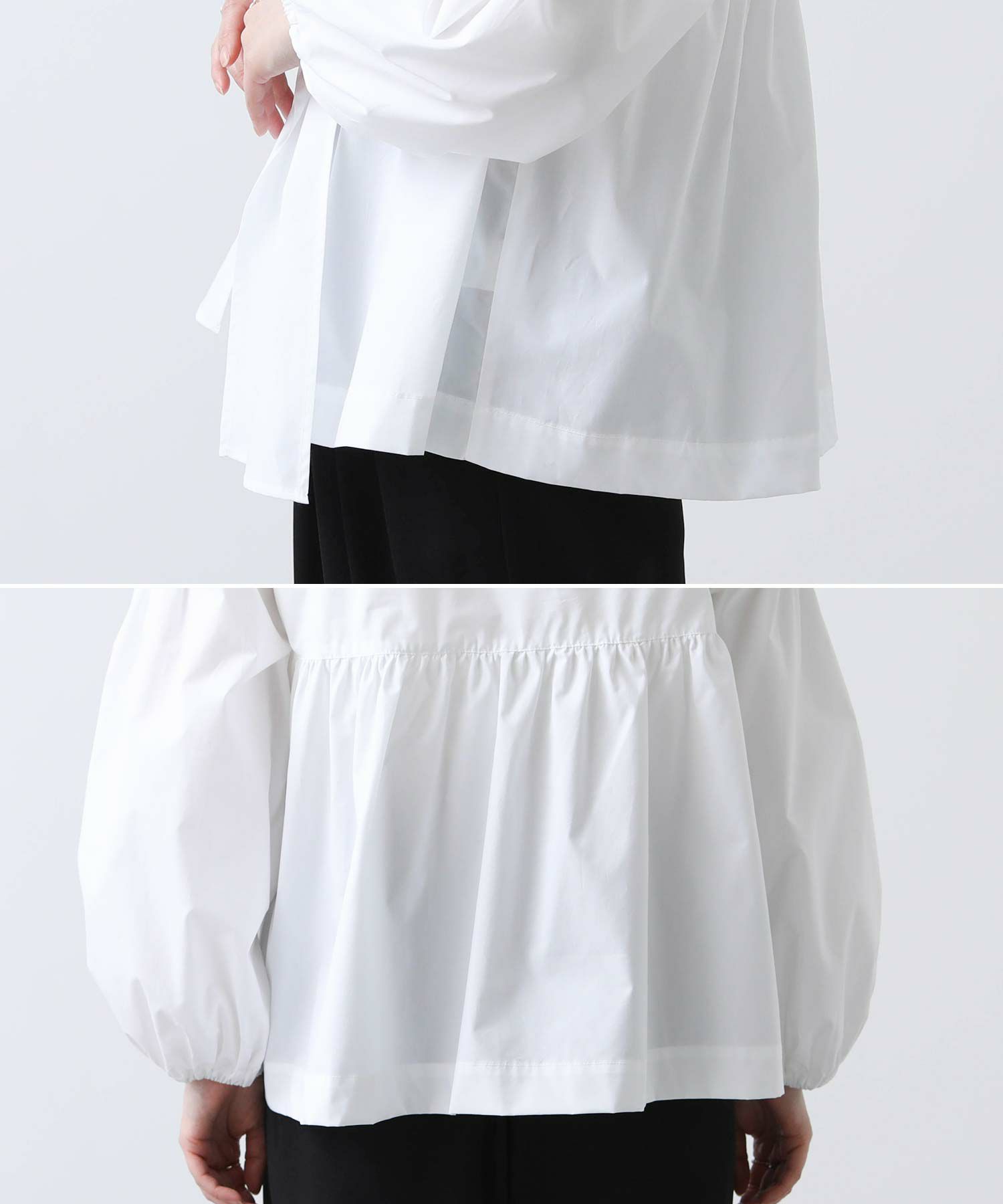 ボリュームスリーブと胸元の切替ギャザーが女性らしさをプラス。