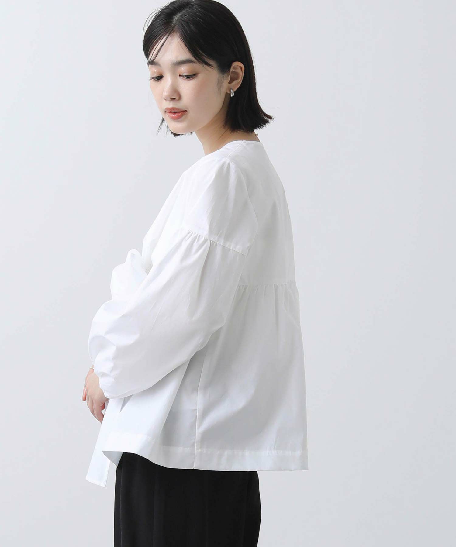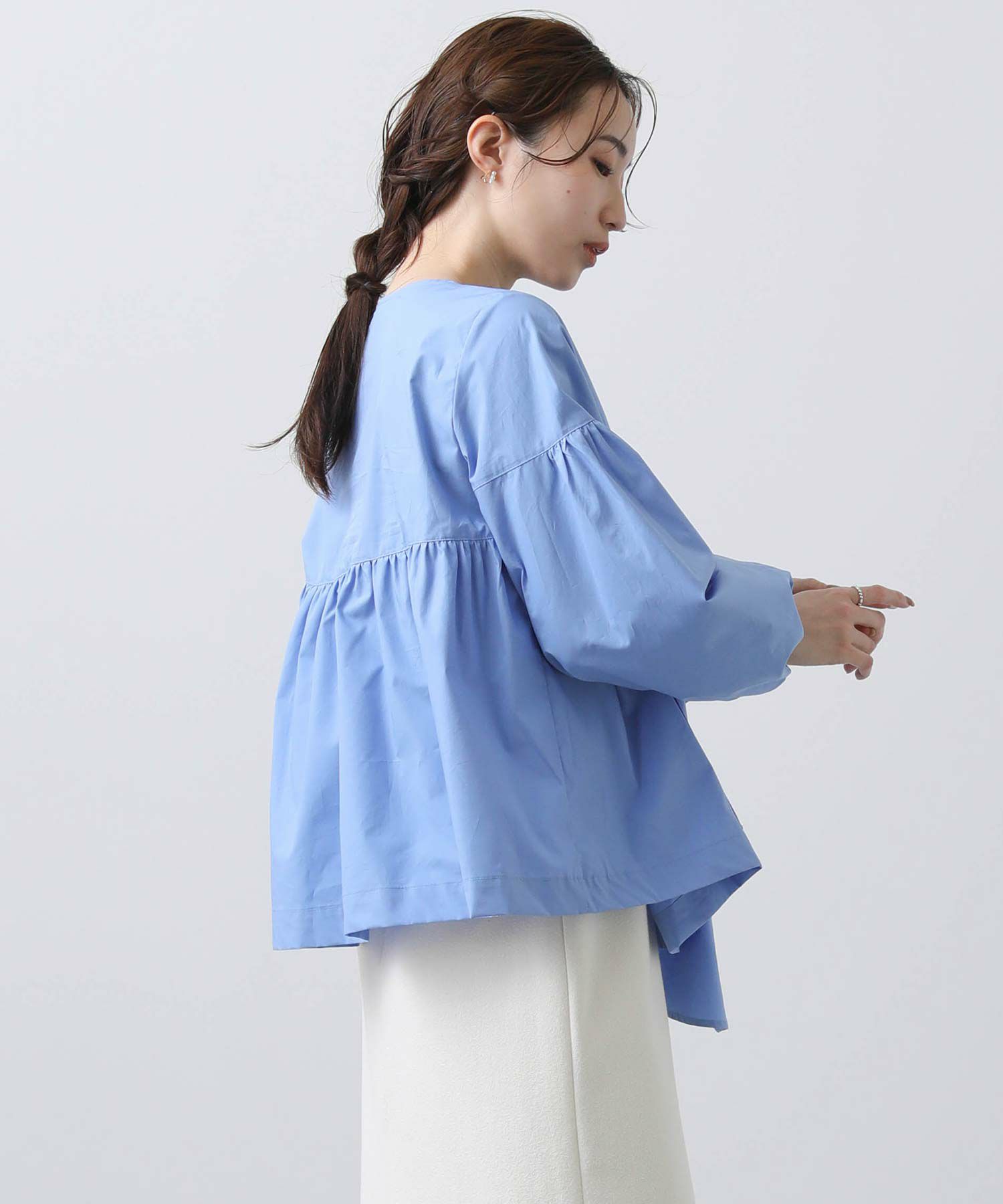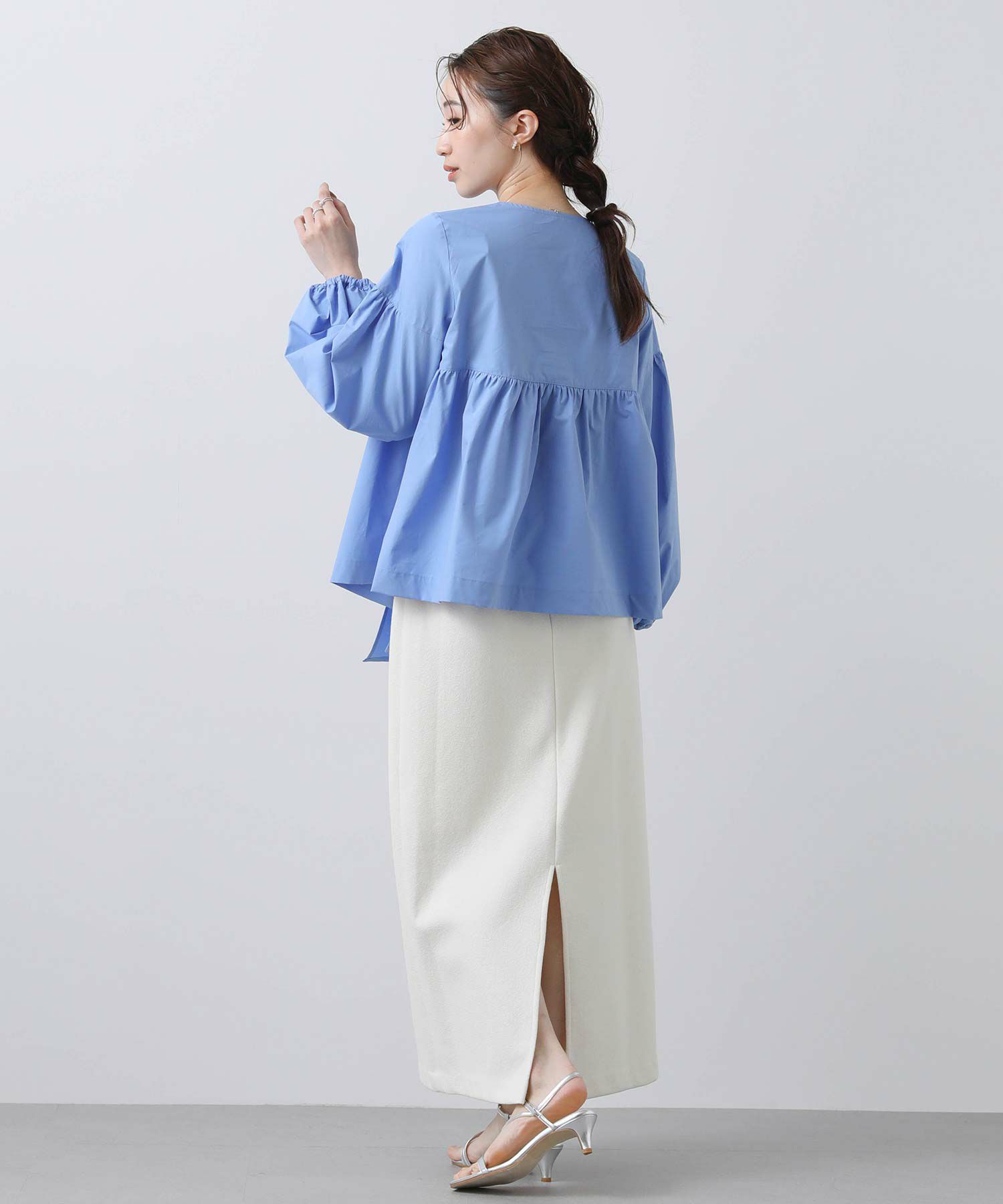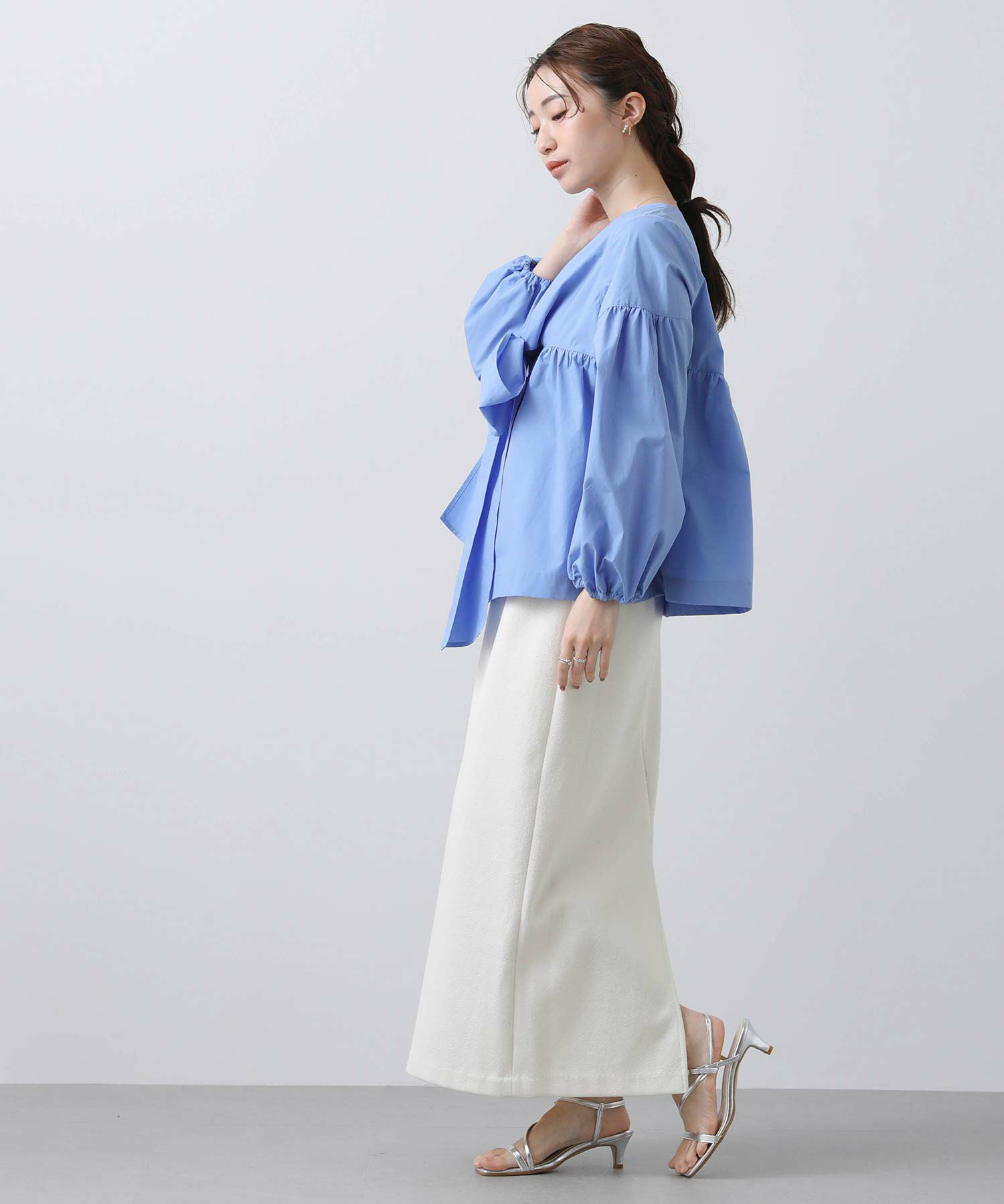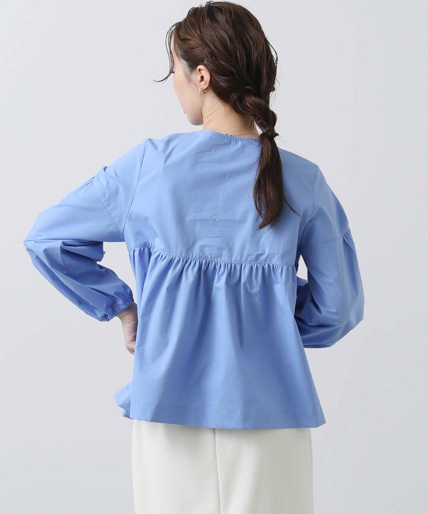ボリュームスリーブと胸元の切替ギャザーが女性らしさをプラス。