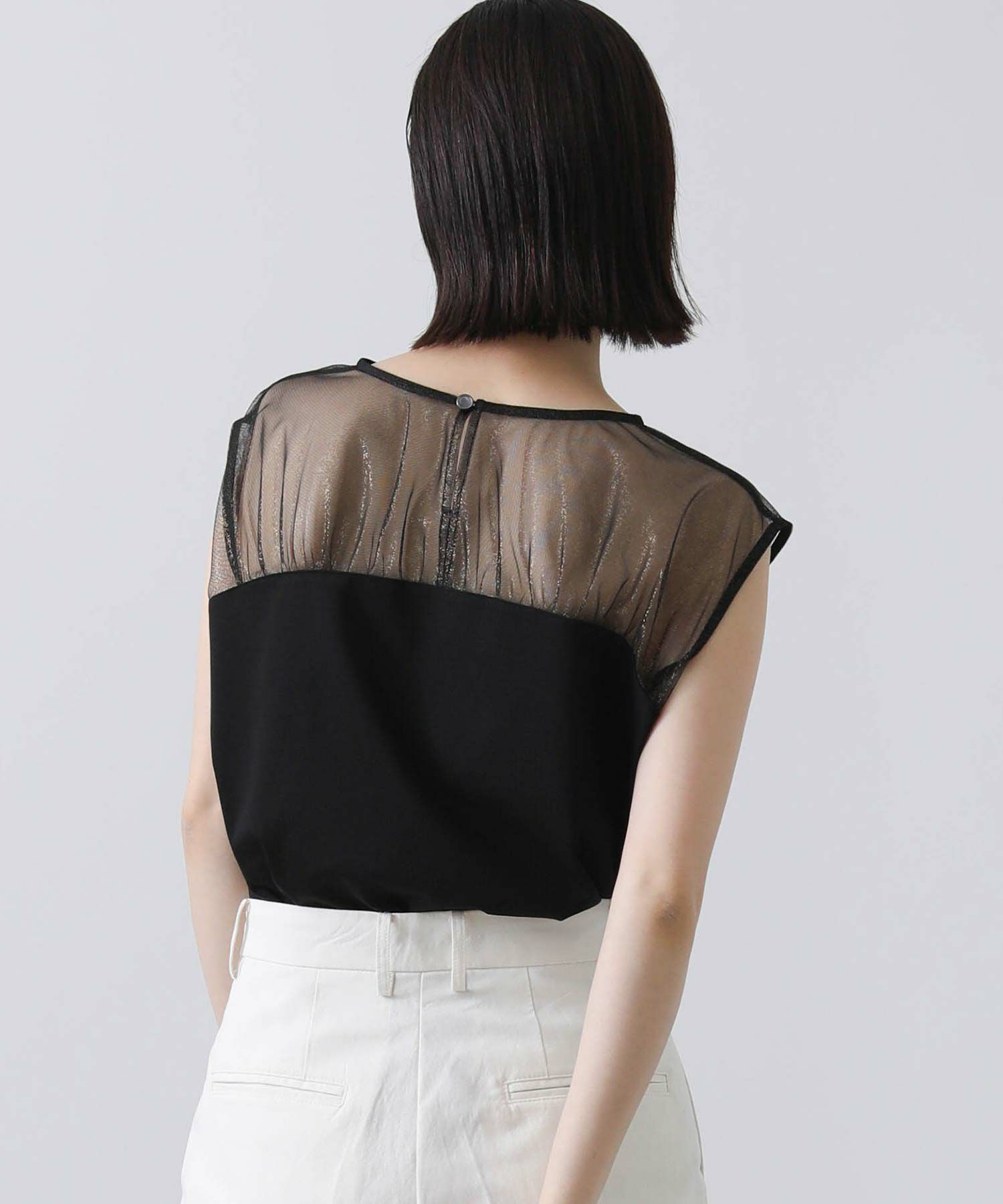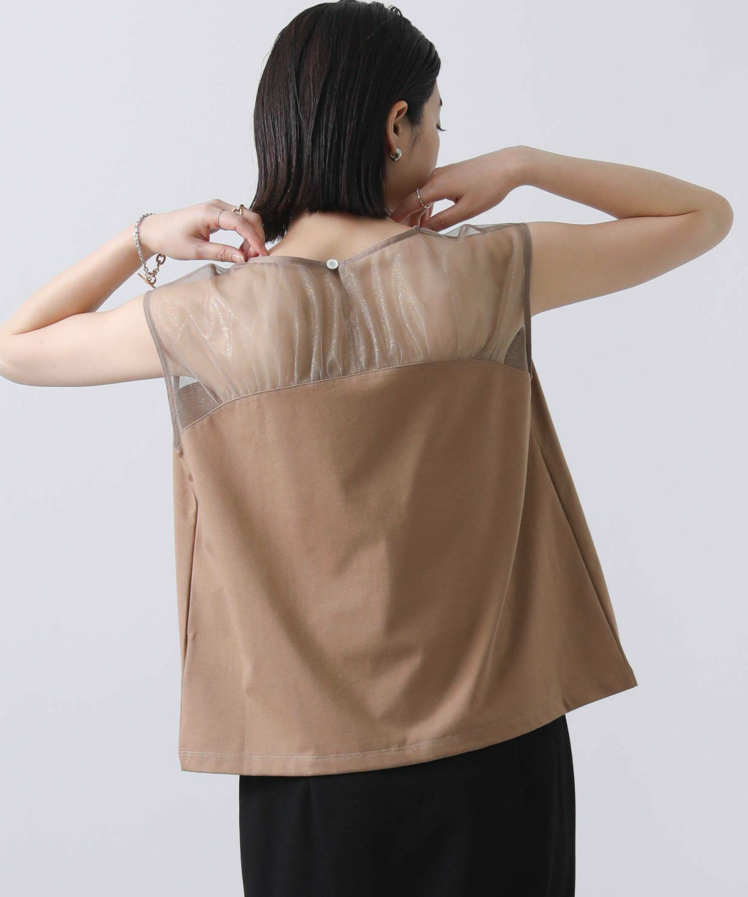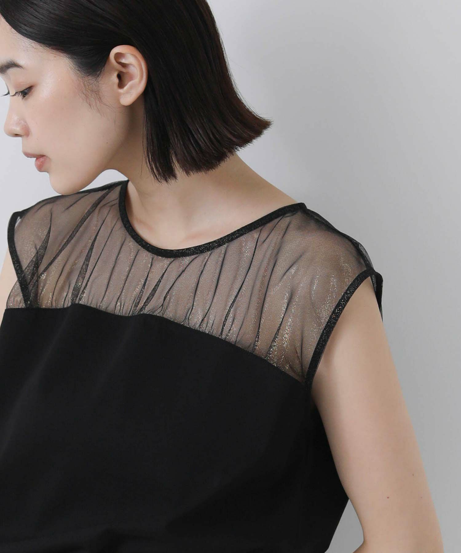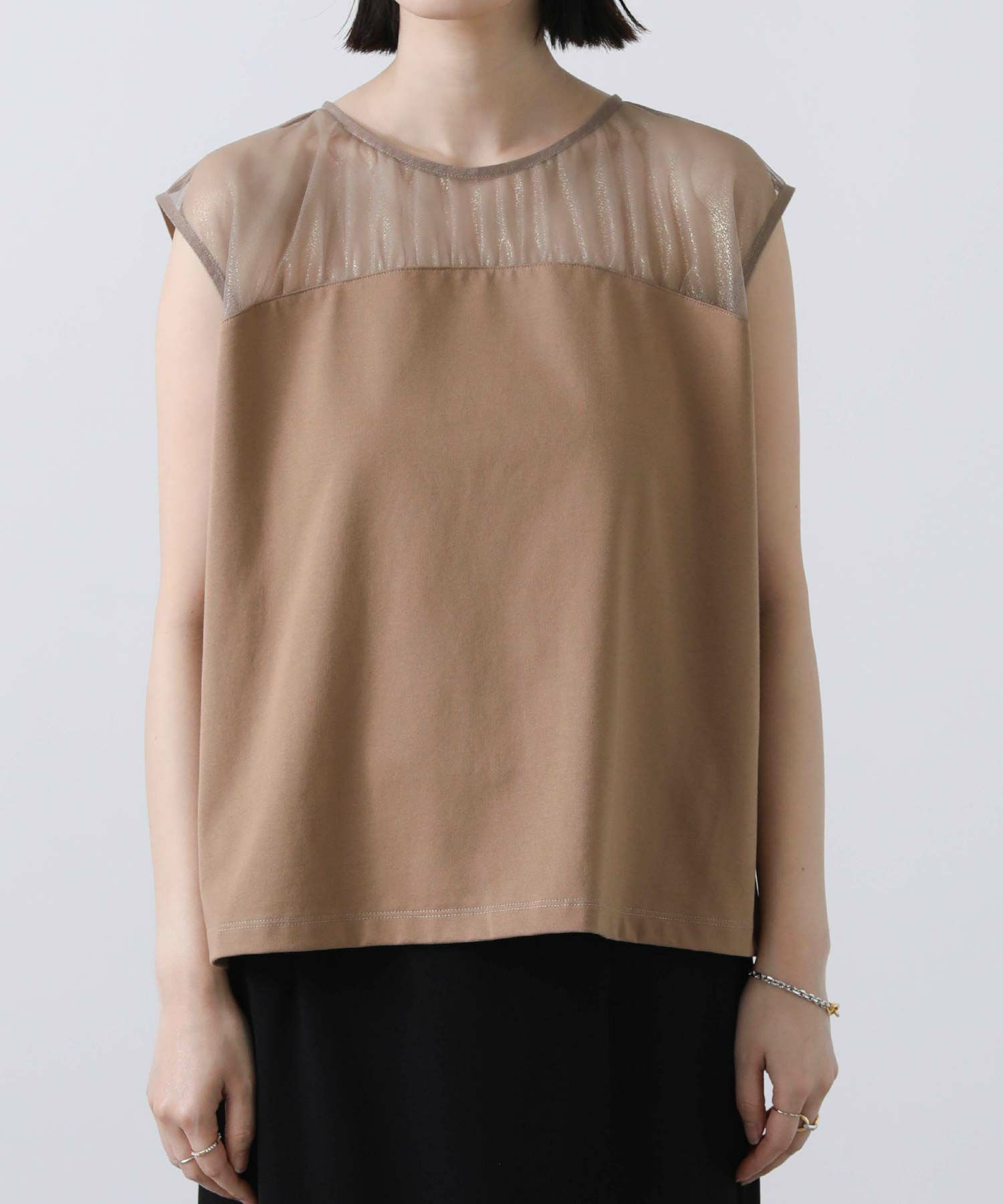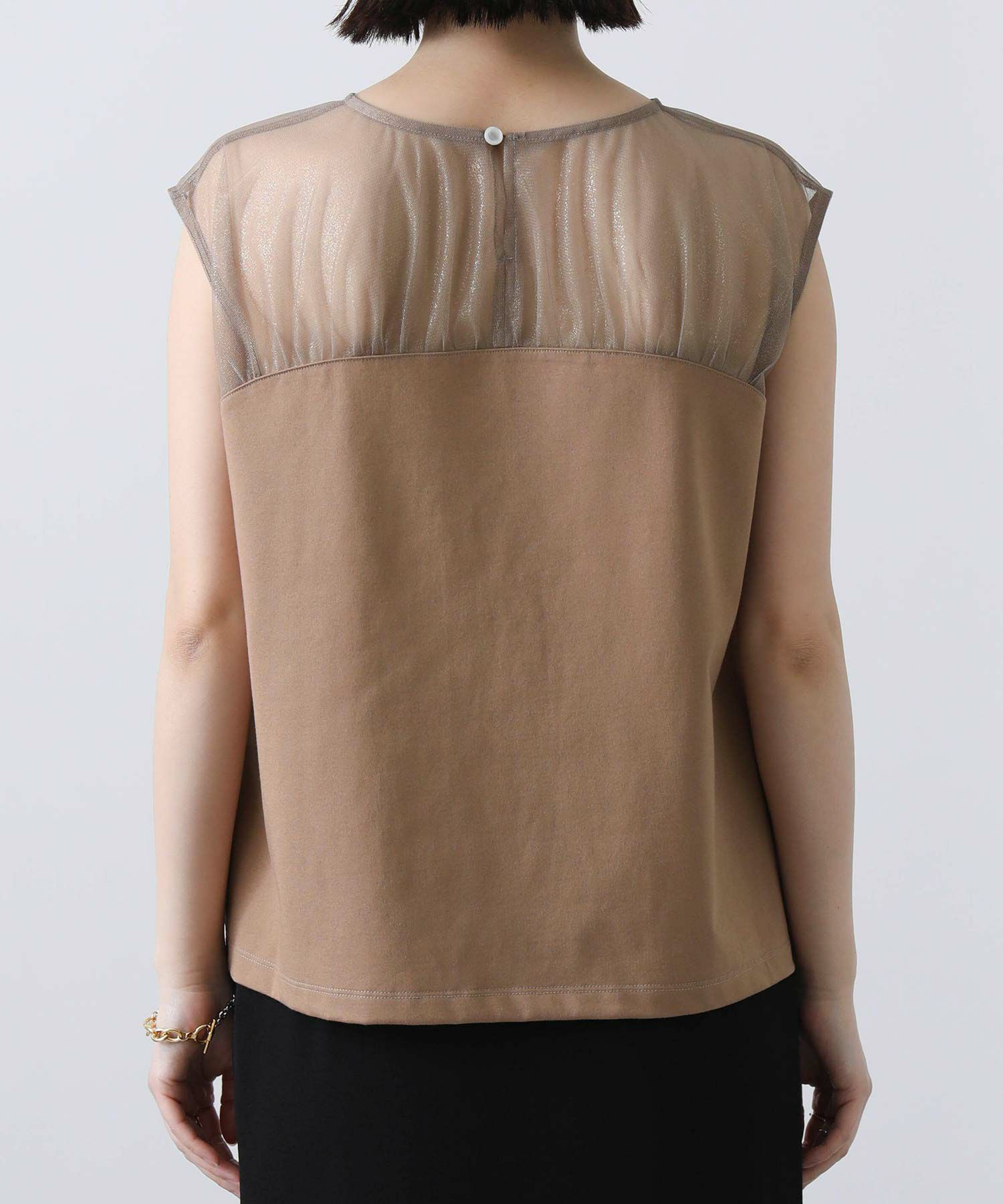 箔プリントが施されたチュール素材を切り替えた今季らしいドッキングカットプルオーバー。