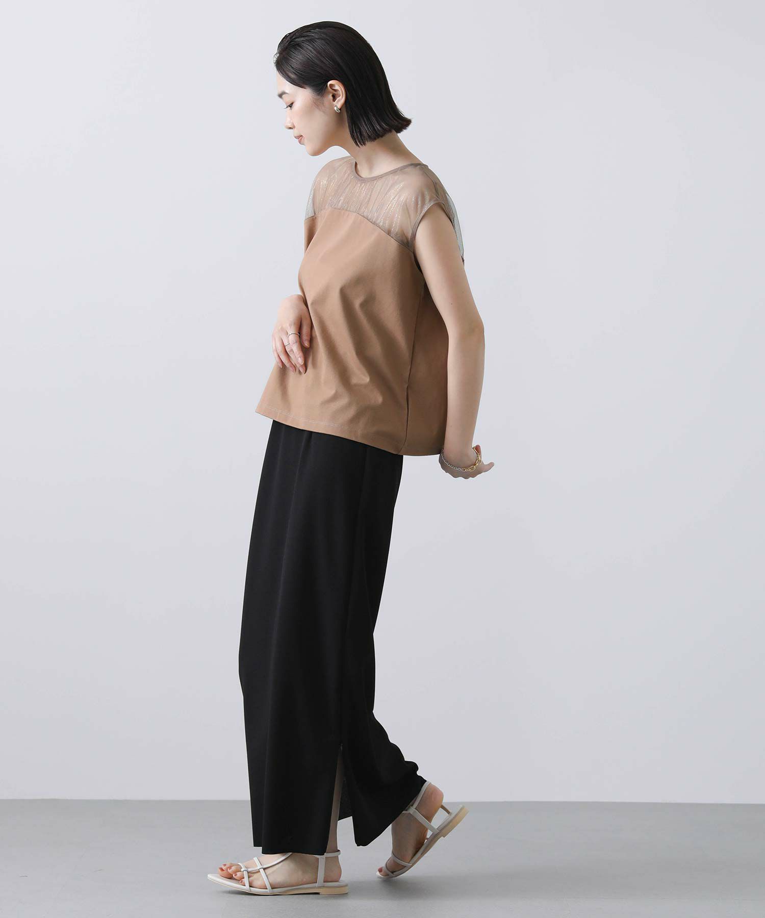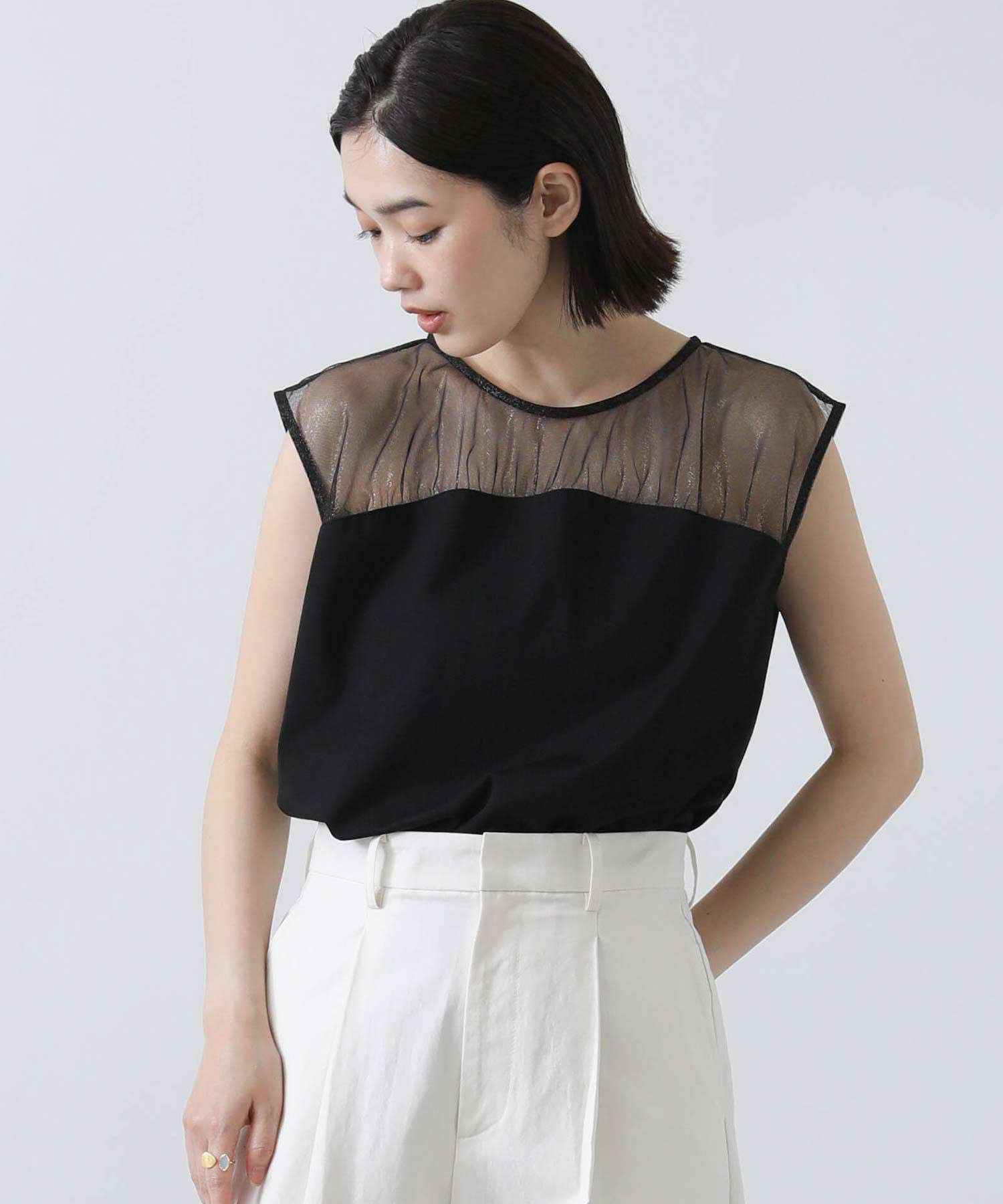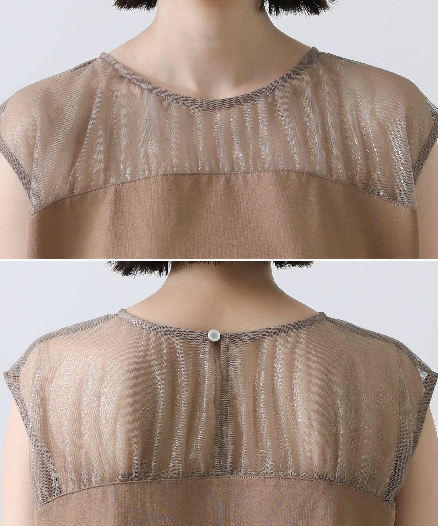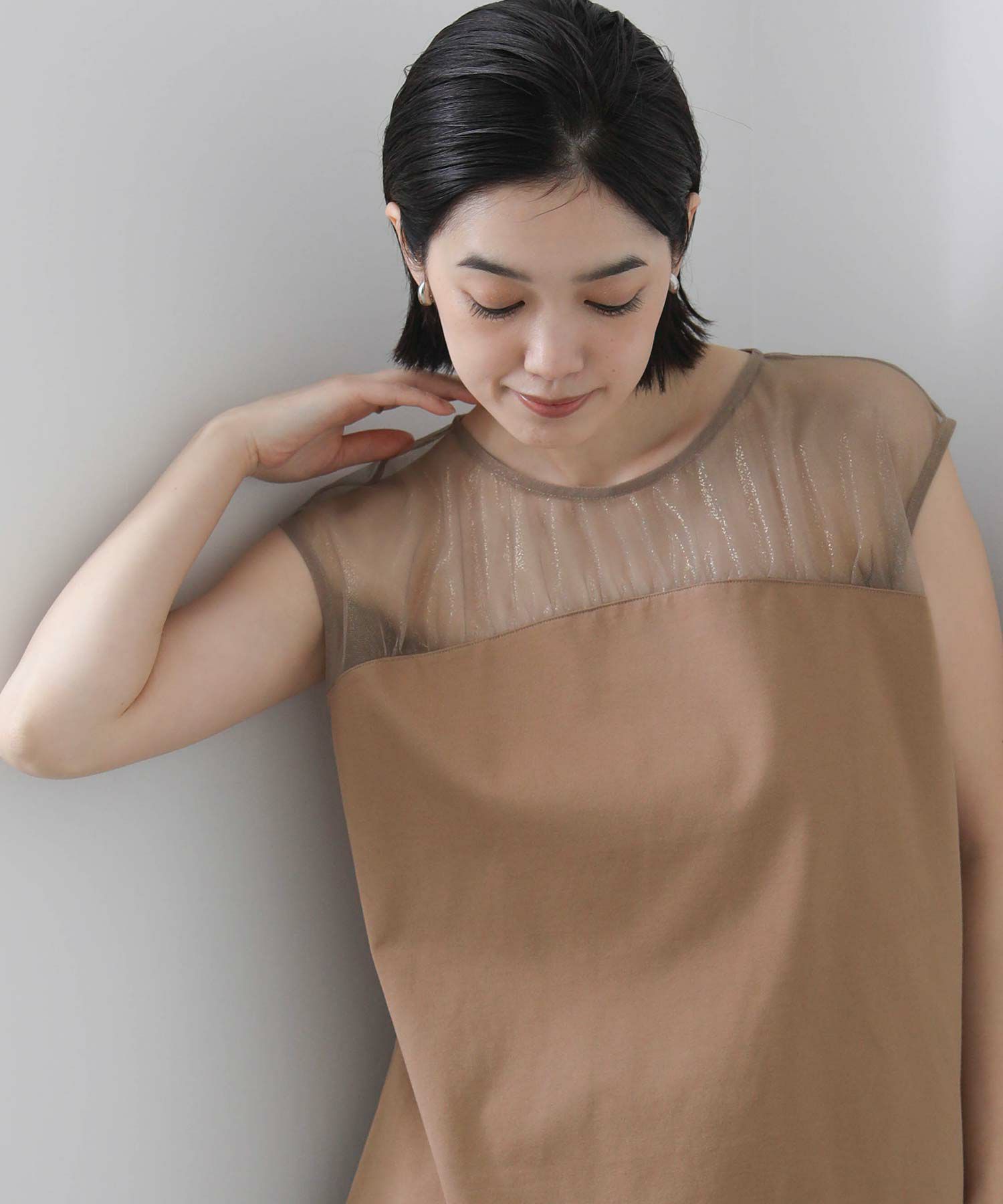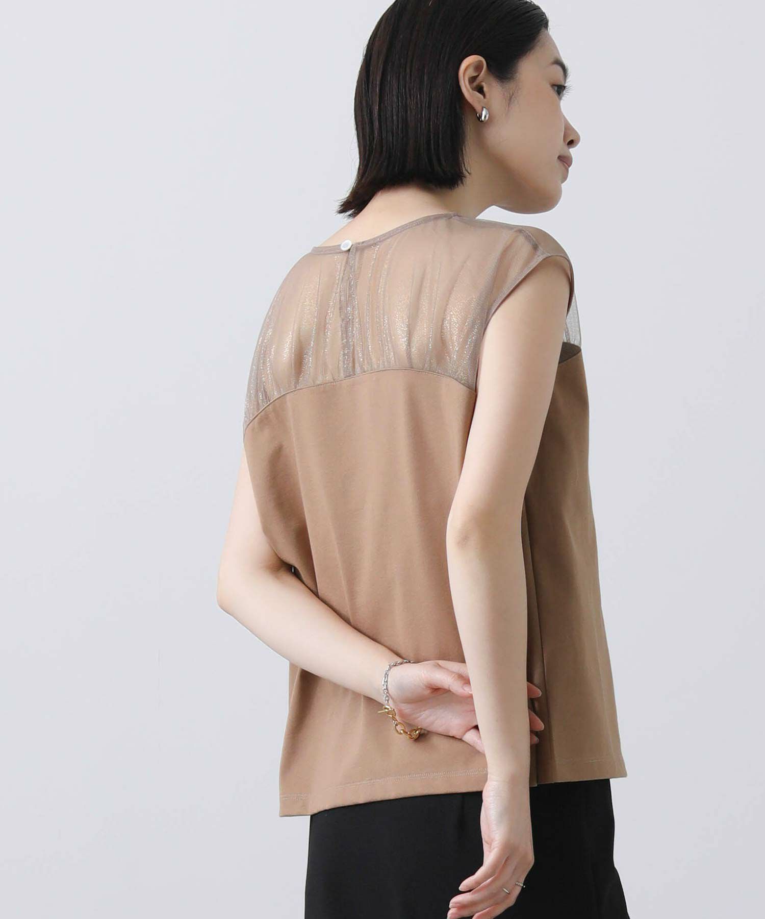 箔プリントが施されたチュール素材を切り替えた今季らしいドッキングカットプルオーバー。