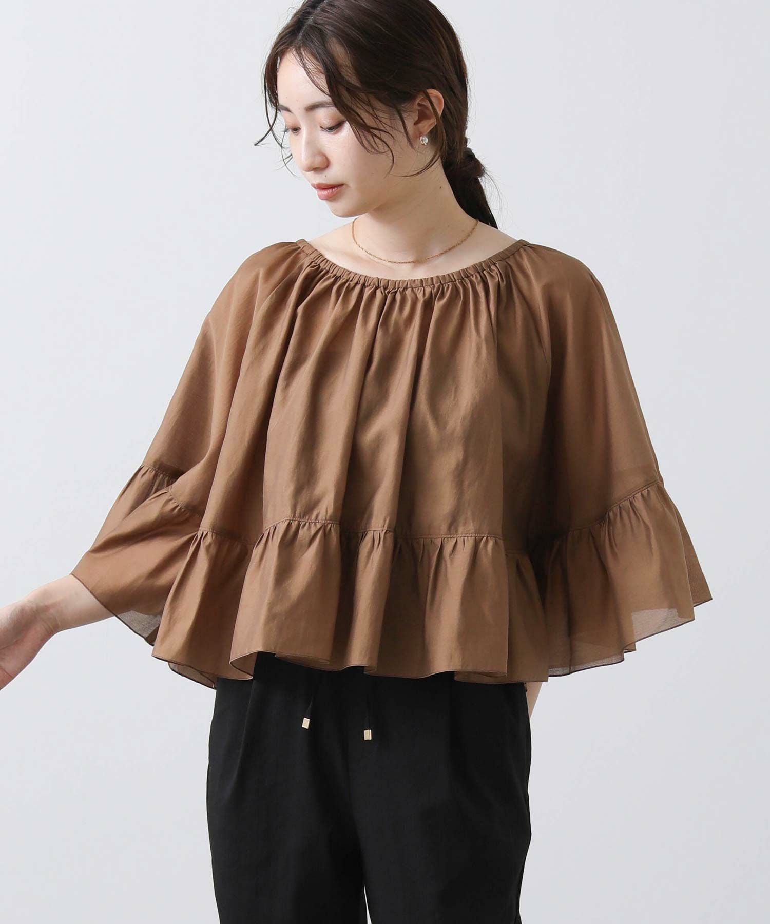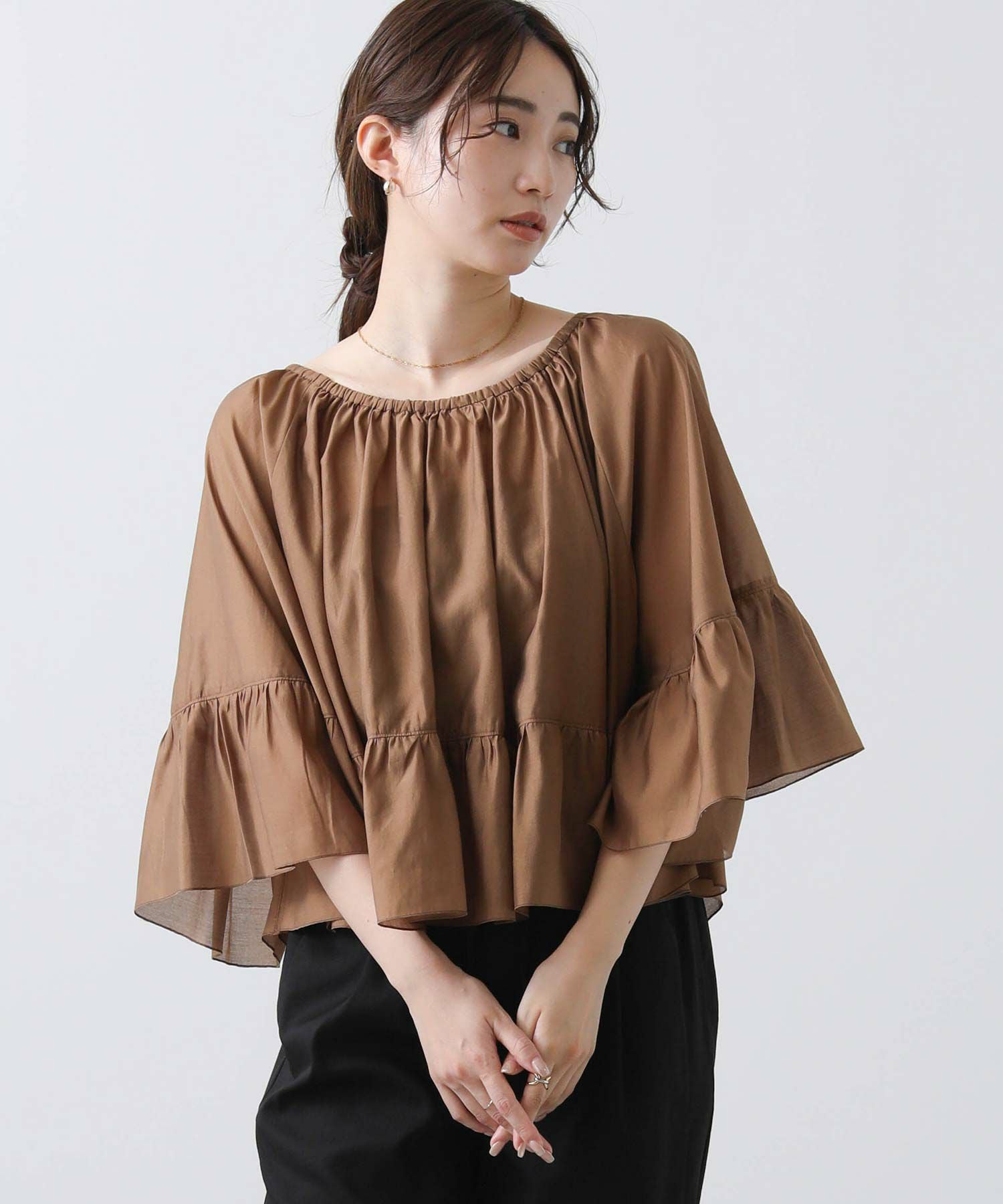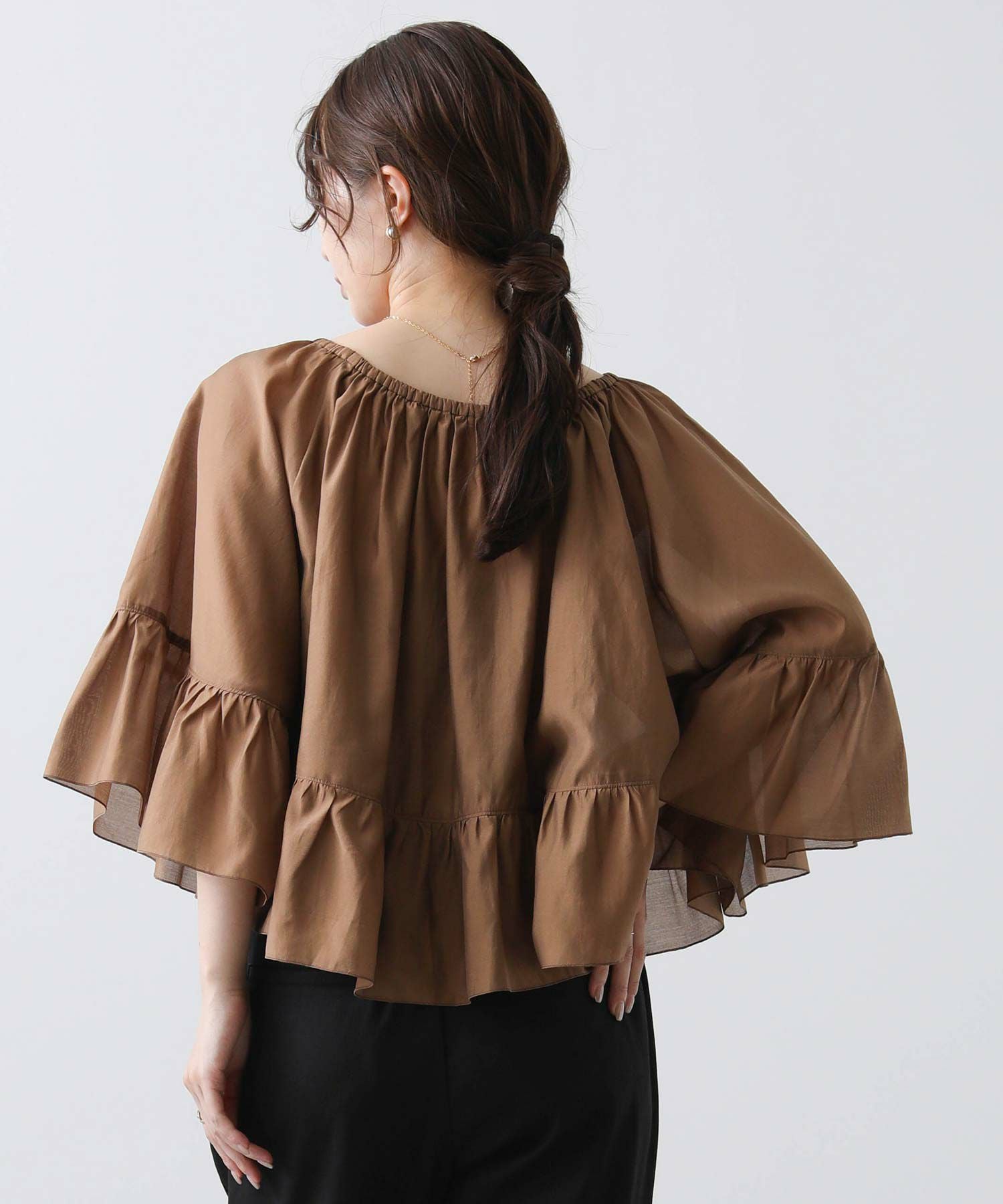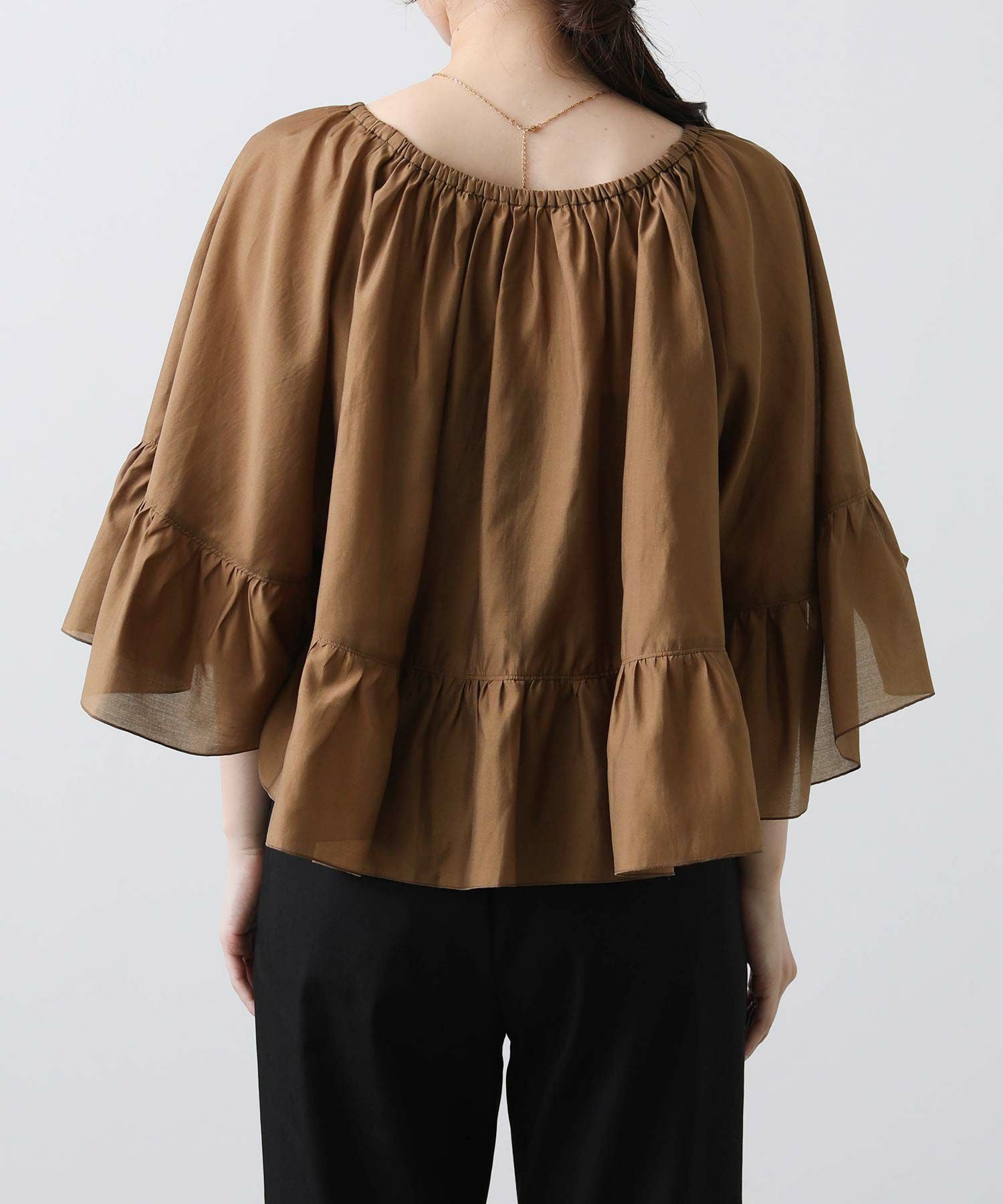 たっぷりギャザーの入ったケープ風フリルブラウス。