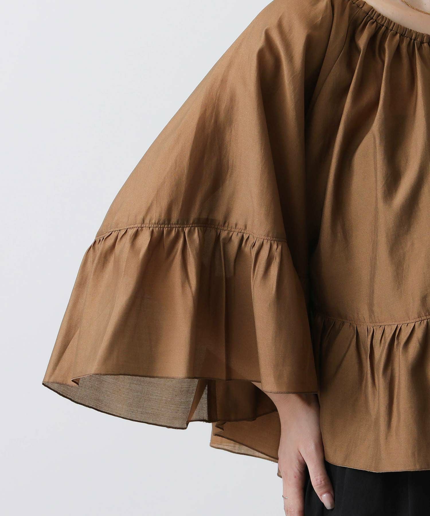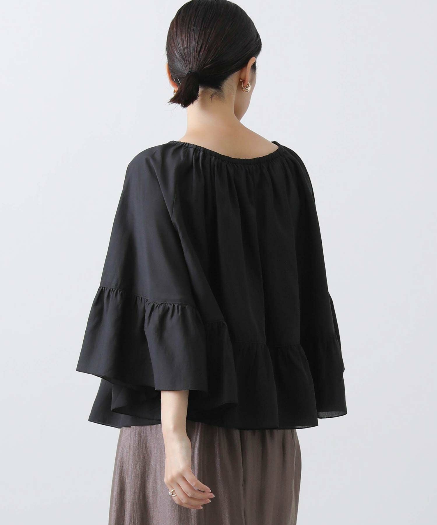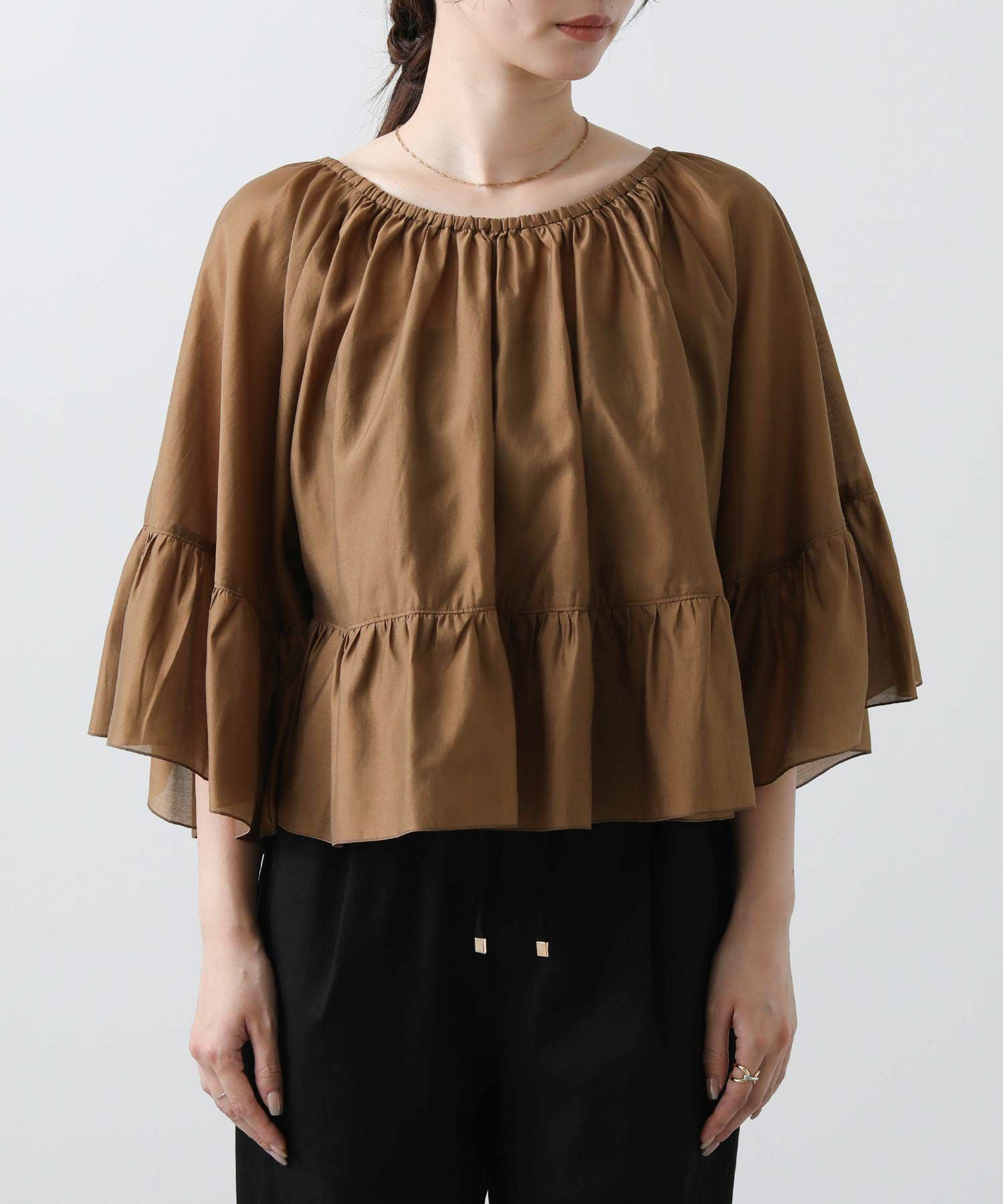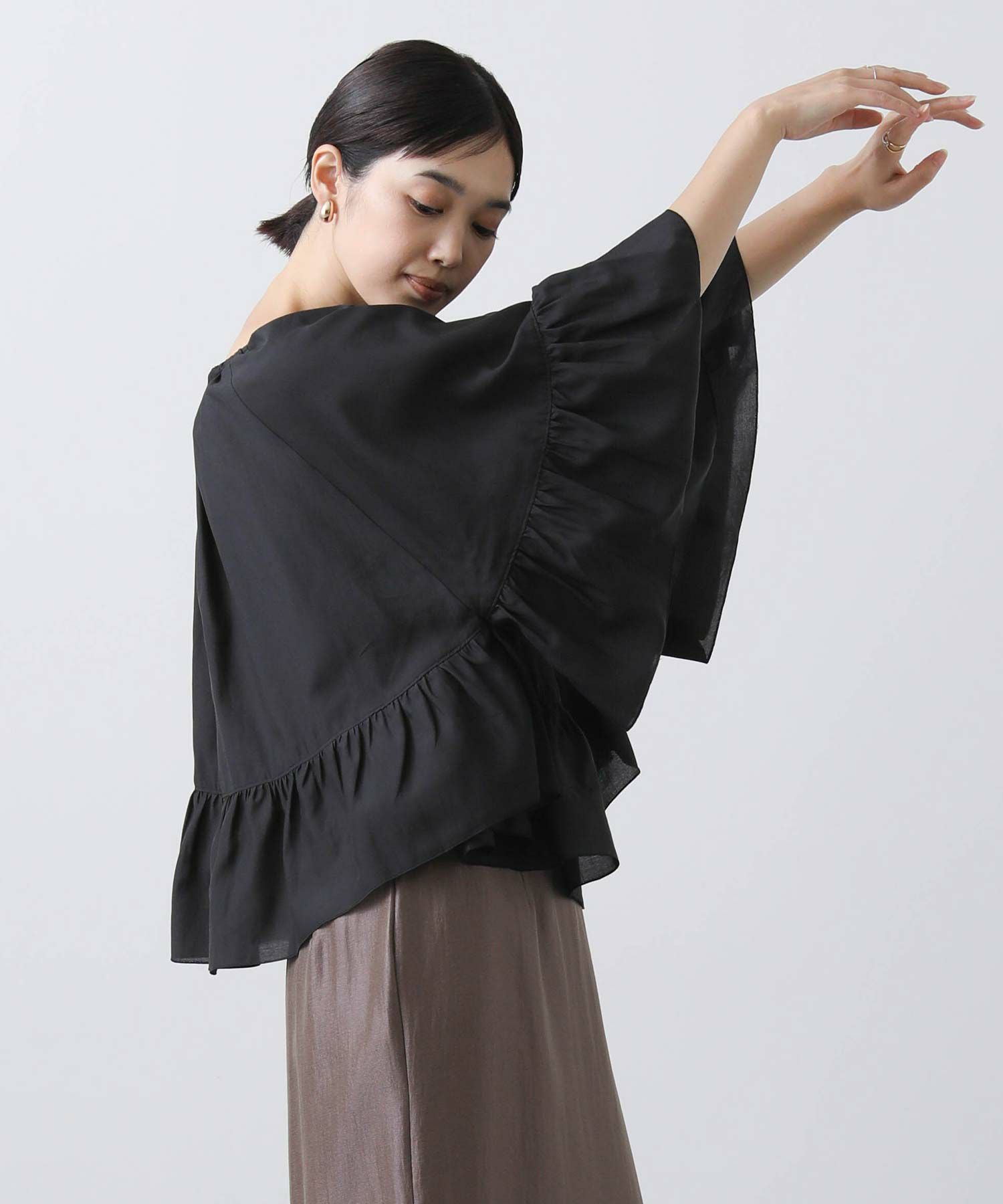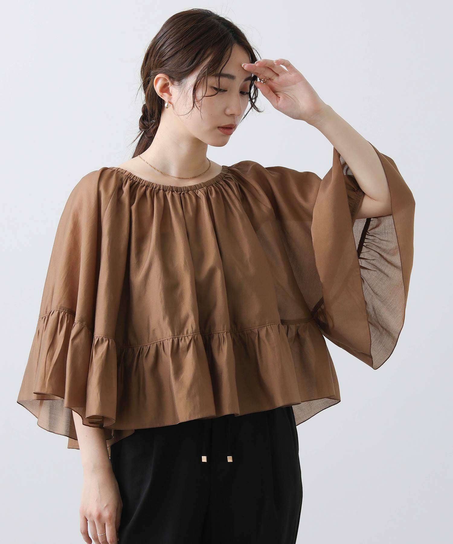 たっぷりギャザーの入ったケープ風フリルブラウス。